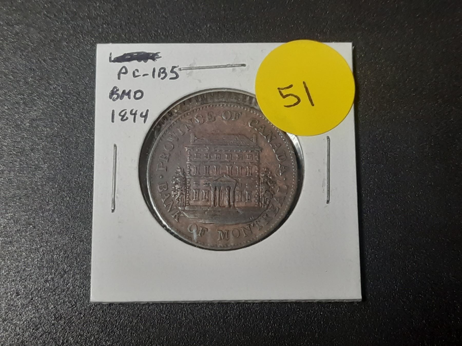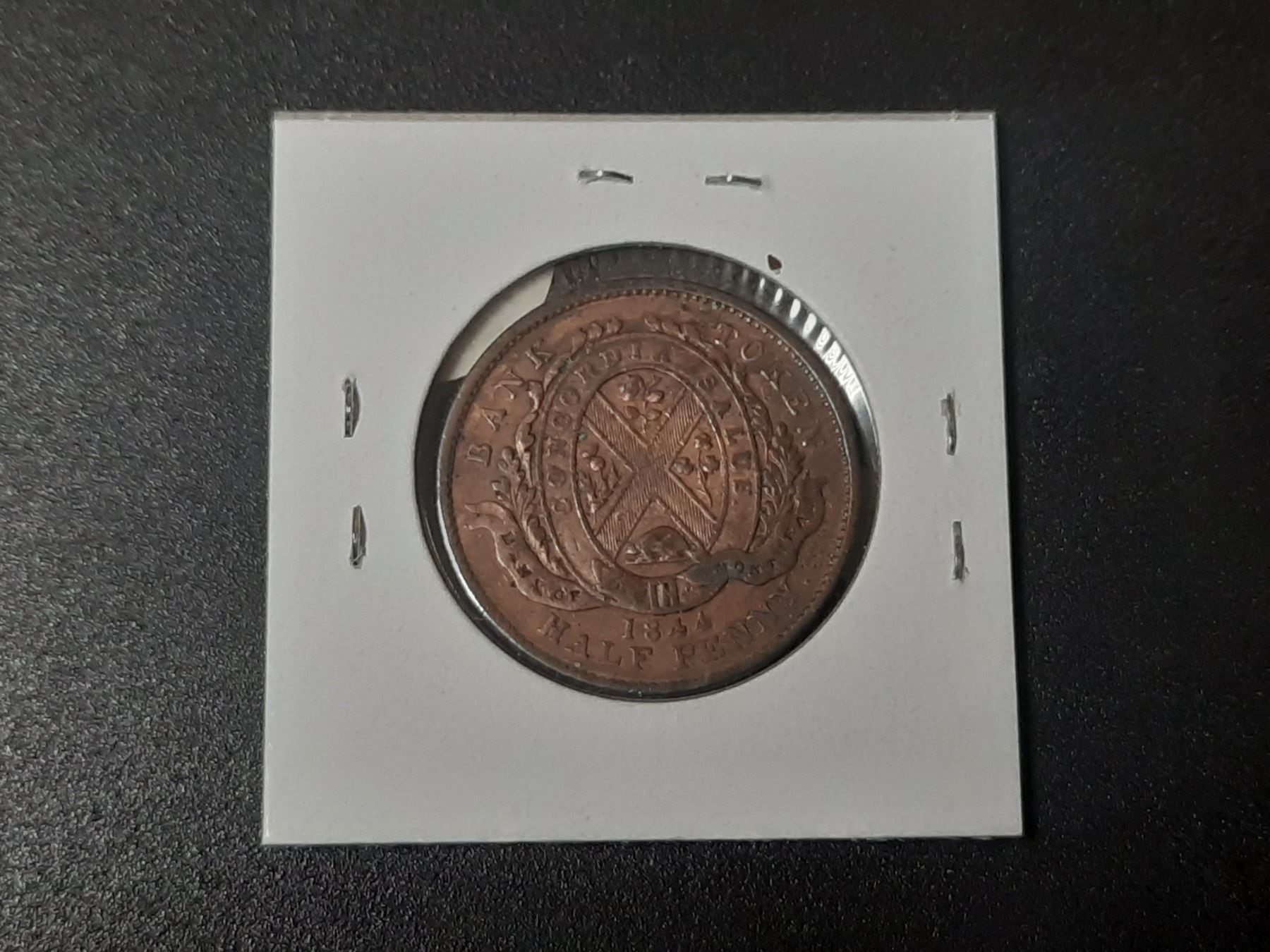 Province of Canada. 1844 Bank of Montreal Half Penny Pre-Confederation Token. Bank of Montreal on ribbon. Small Trees. Long nose beaver. PC-1B5. VF.