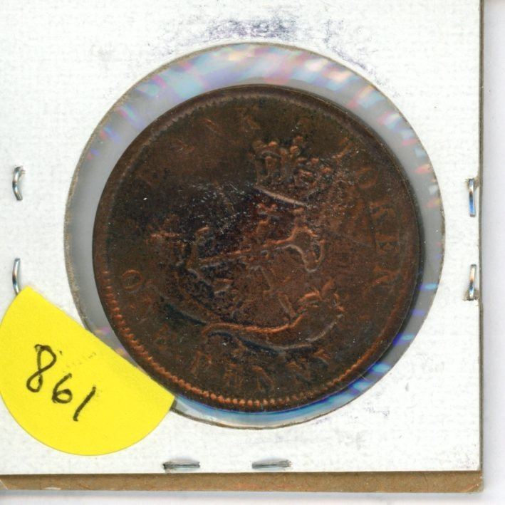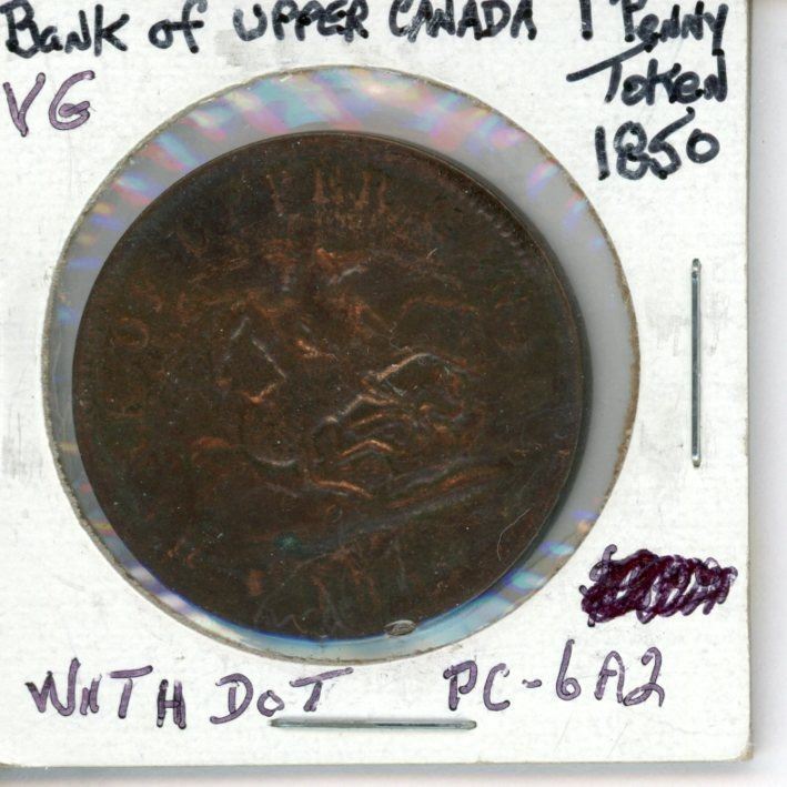 Province of Canada. 1850 One Penny Token. Bank of Upper Canada. St. George slaying a dragon. With Dot. PC-6A2. VG-8. Cleaned.
