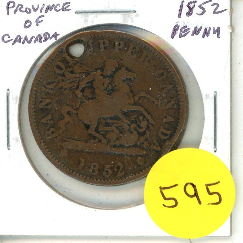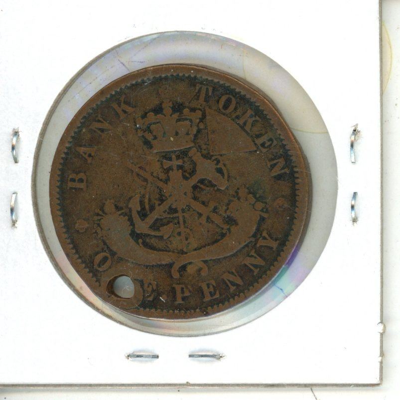 Province of Canada 1852 Penny. Bank of Upper Canada. VG-8. Holed.