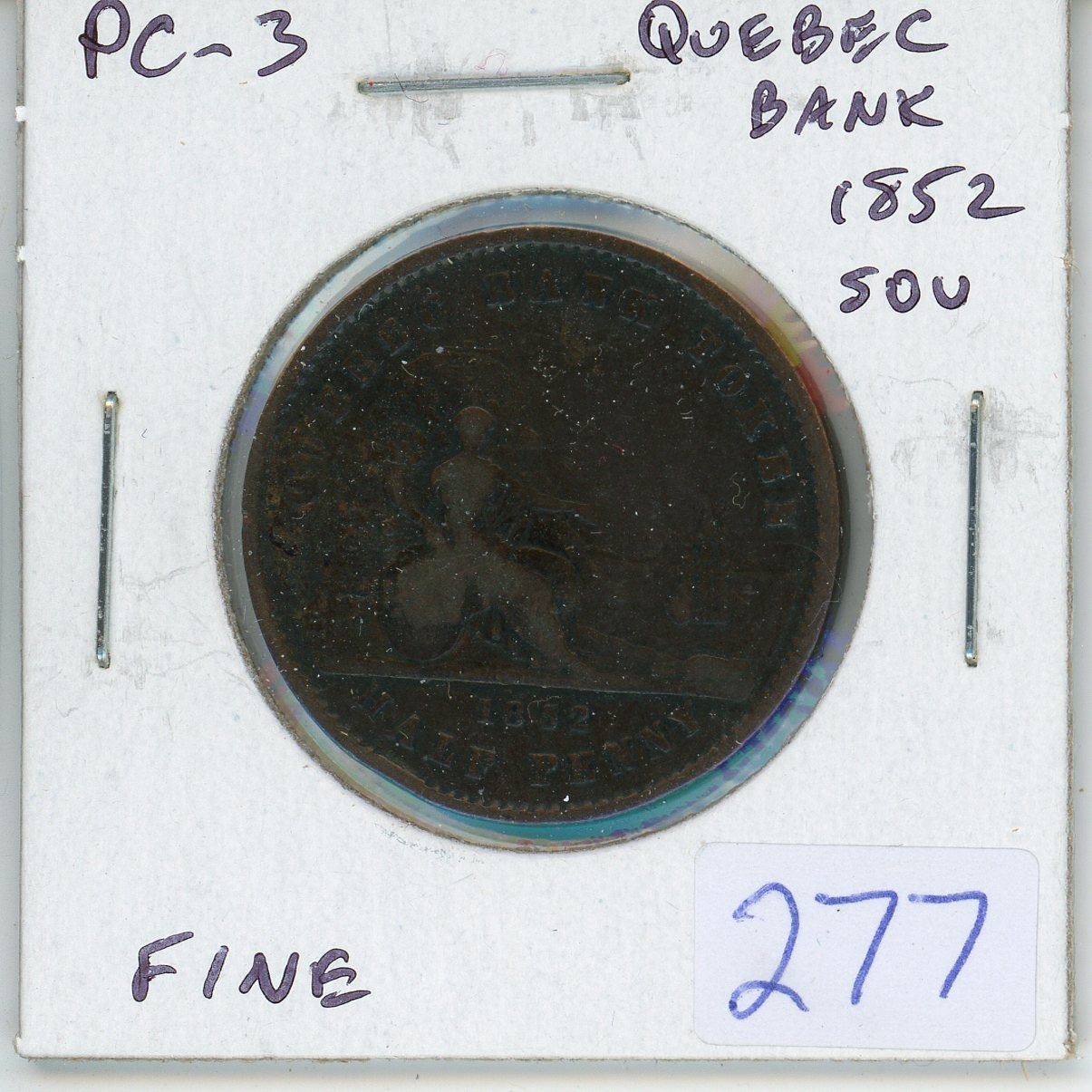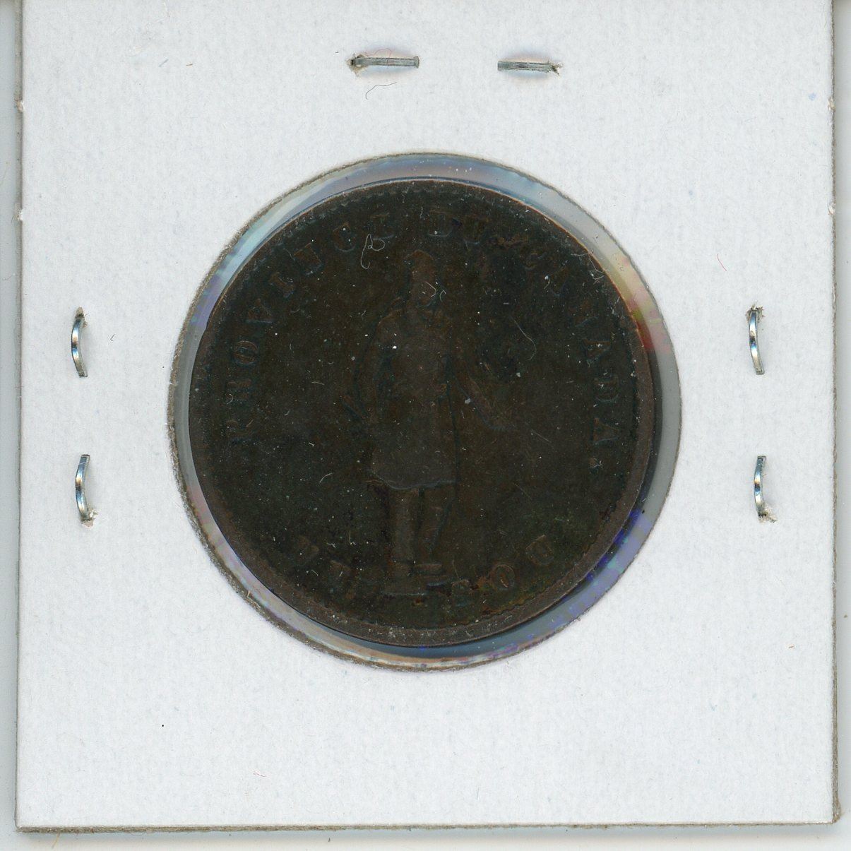 Province of Canada 1852 Quebec Bank Half Penny Un Sou Pre-Confederation Token. PC-3. Habitant/Britannia. Fine-12.