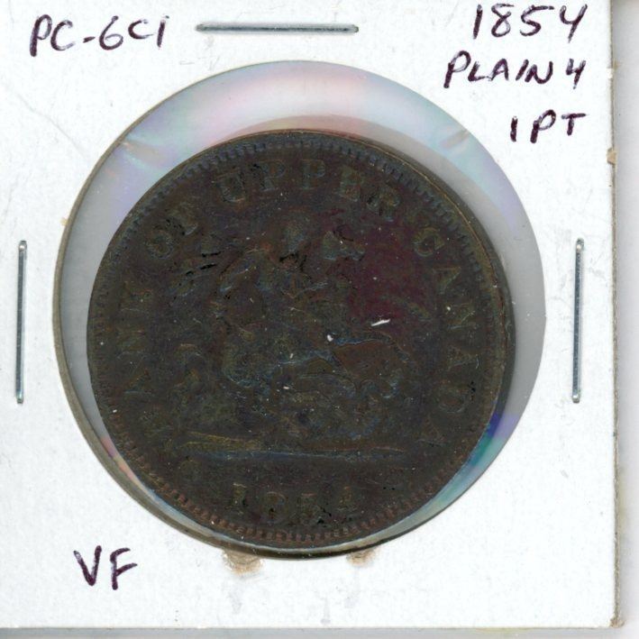 Province of Canada. 1854 Plain 4 One Penny Token. Bank of Upper Canada. St. George slaying a dragon. VF-20.