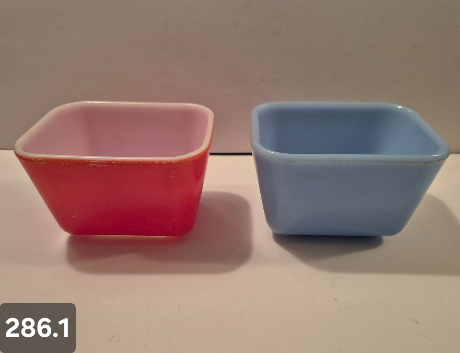 Pyrex - 2 refrigerator jars, no lids, blue delphite and red, excellent condition