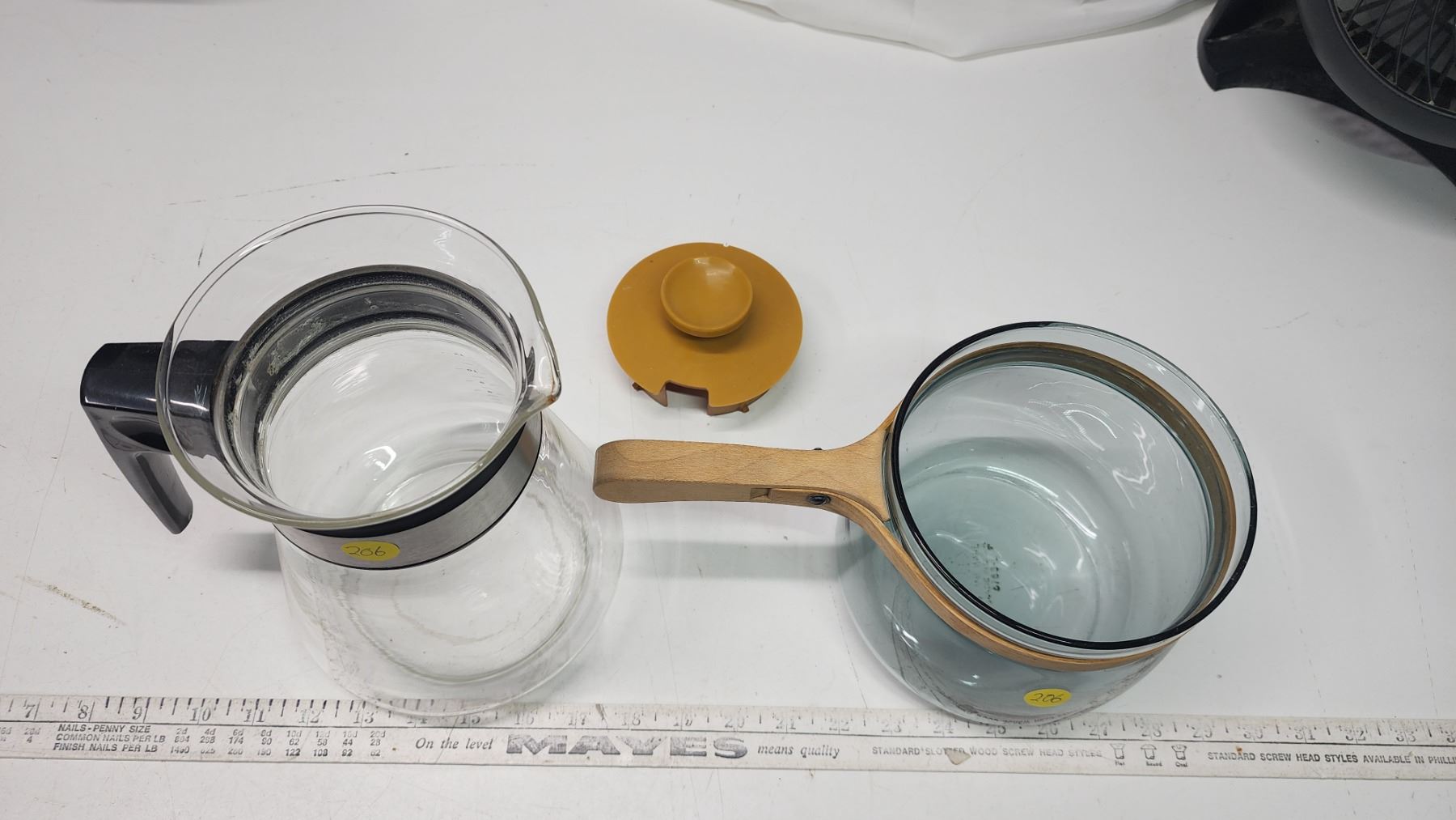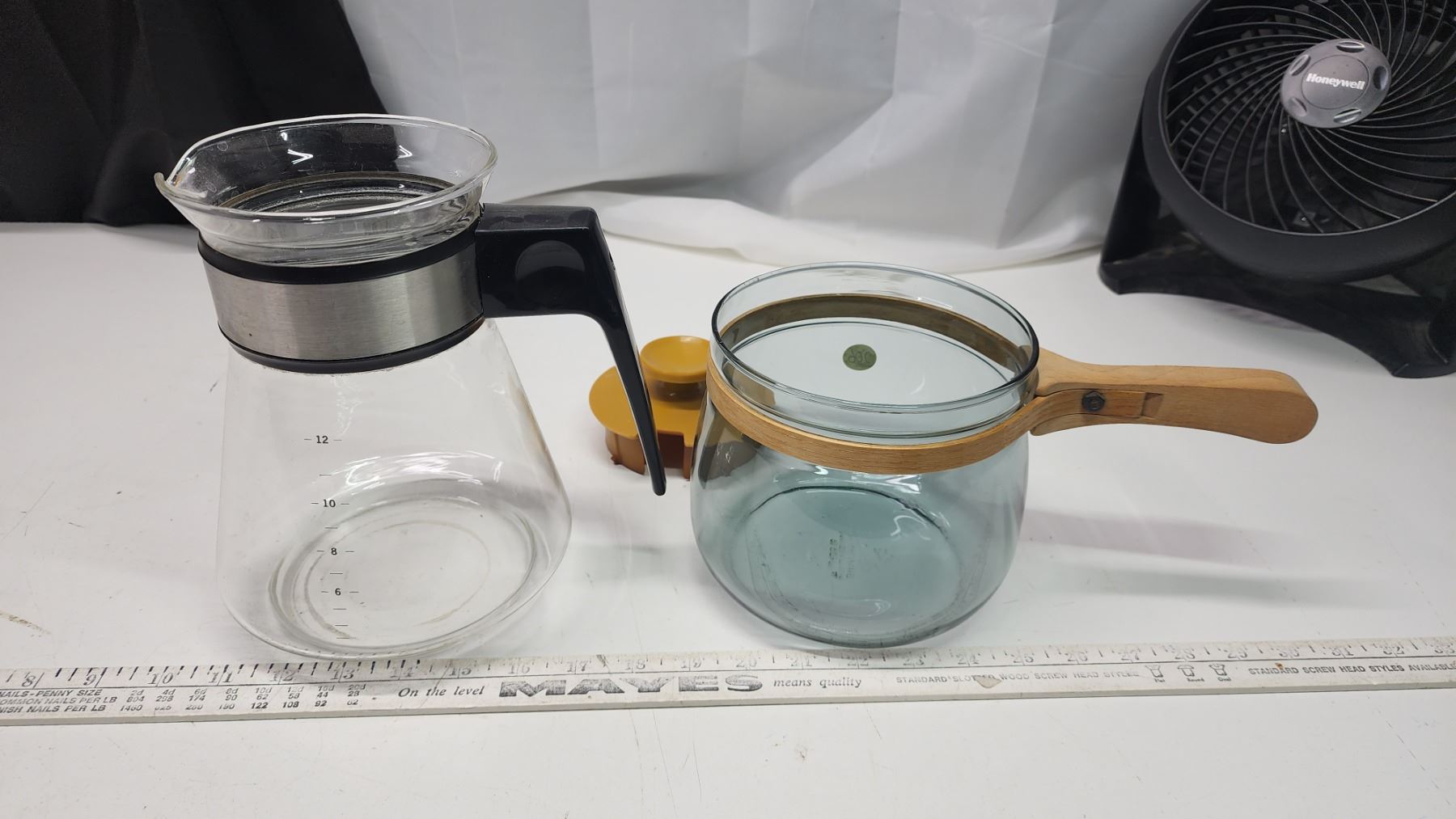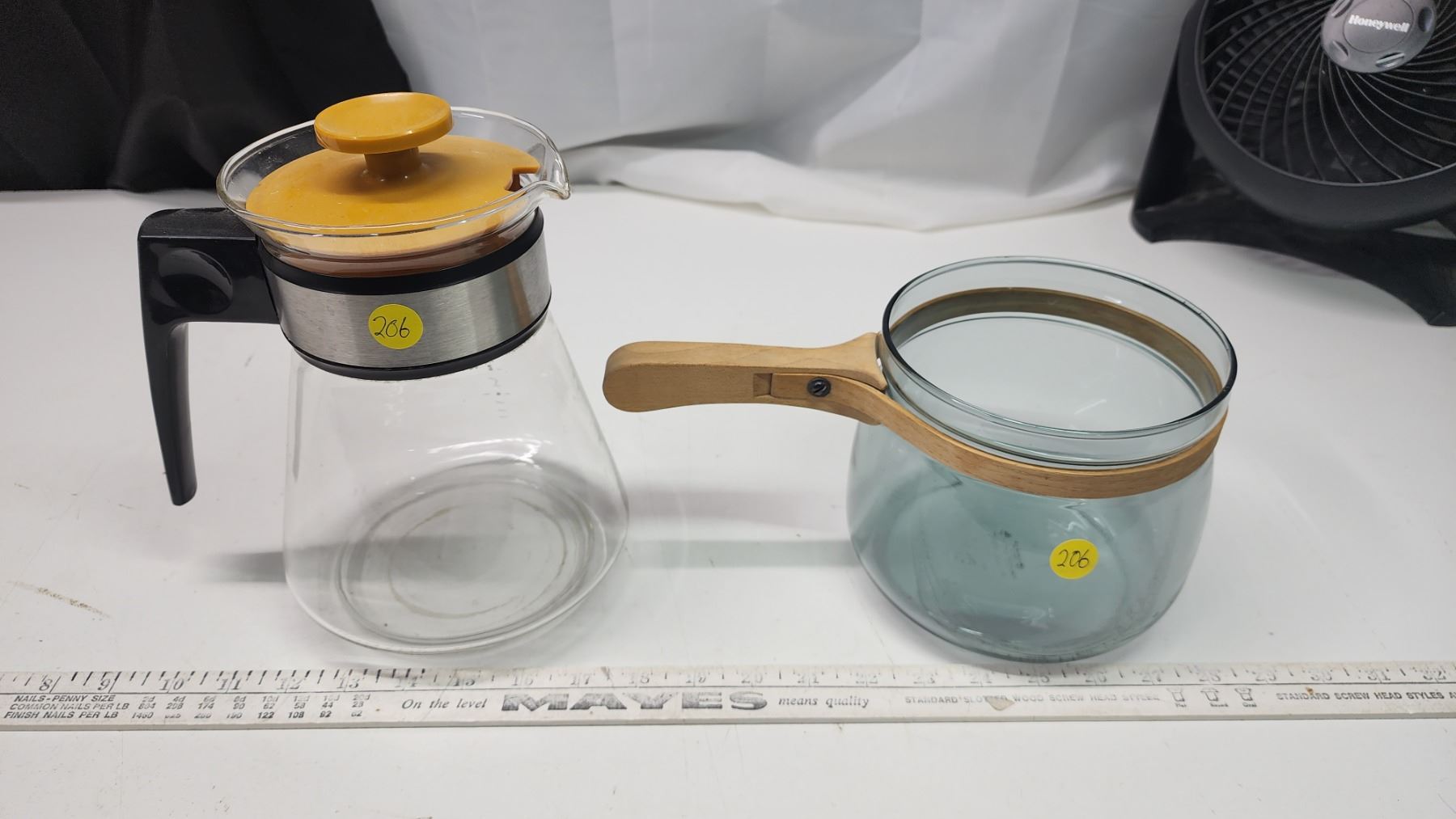 Pyrex tinted glass cooking pot - wooden handle & Glass 12cup coffee pot/pitcher