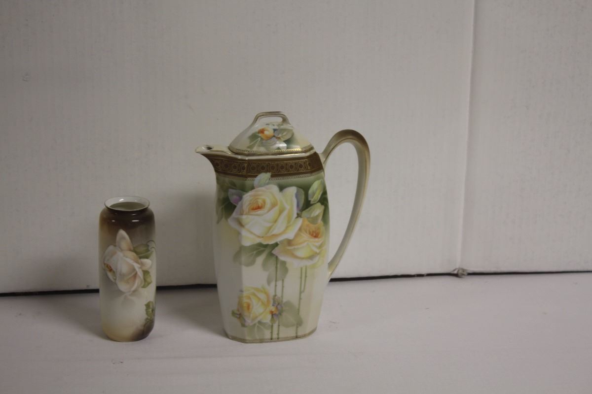 A small R.S. Germany vase and coffee pot made of china with a rose design