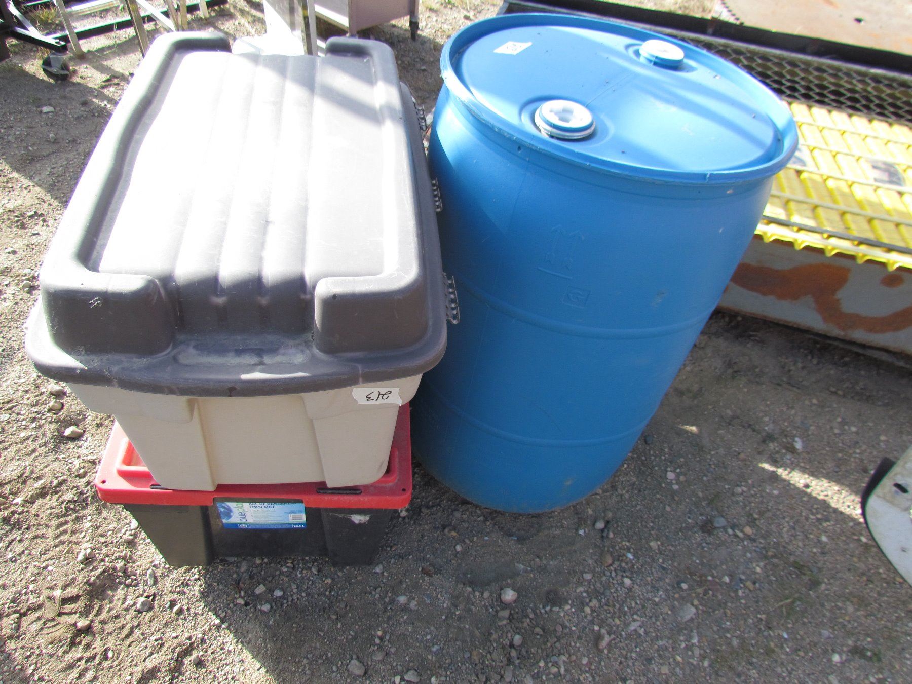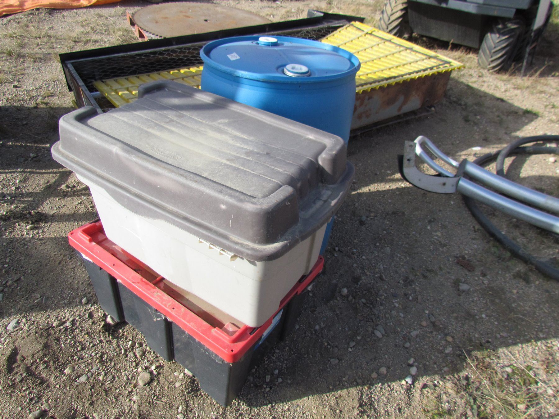 RAIN BARREL AND 2 PLASTIC TUBS
