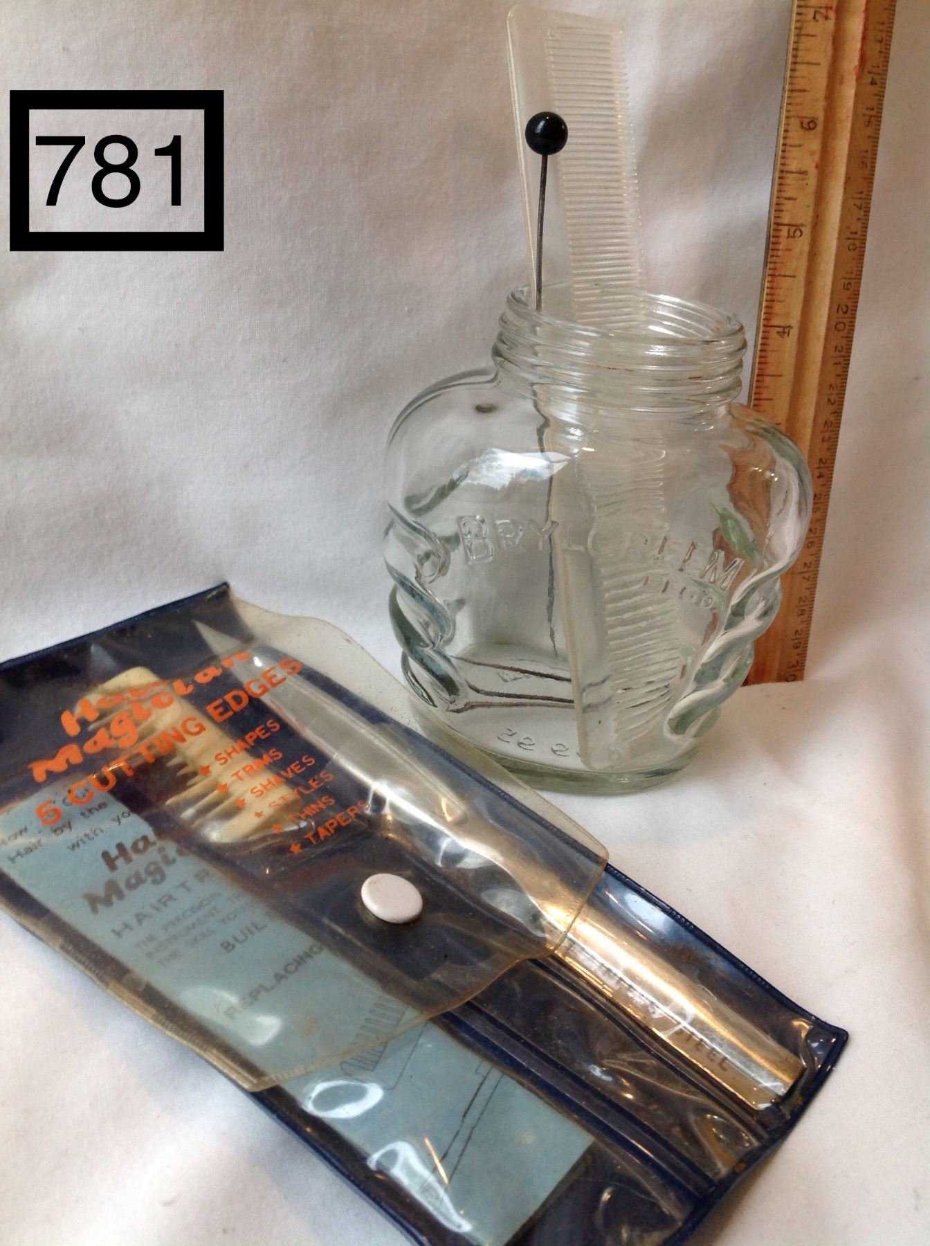 RARE EMBOSSED BRYLCREAM JAR (1950'S HAIR GEL) WITH HAT PIN AND COMB.