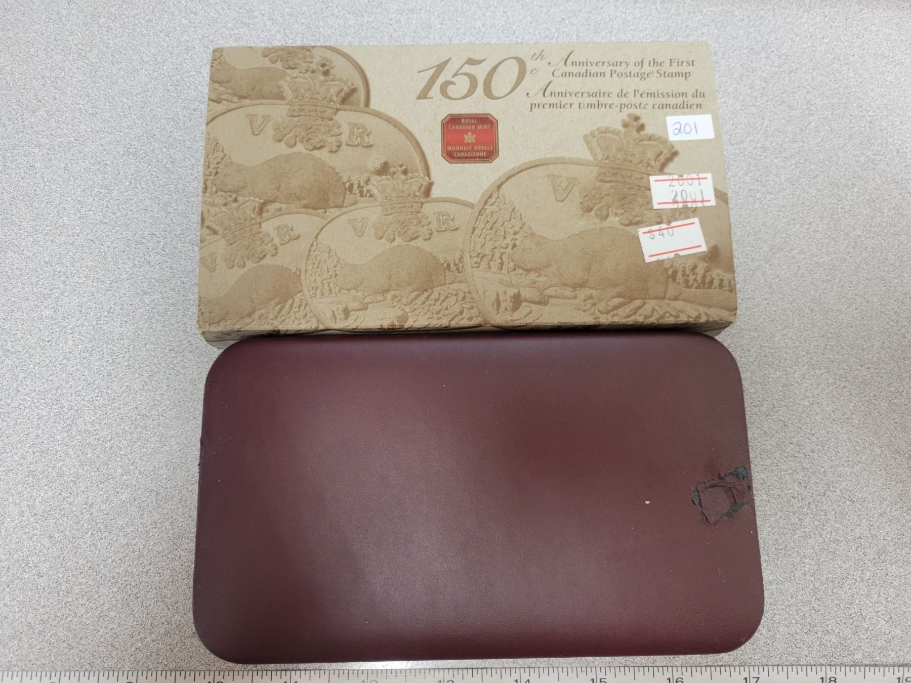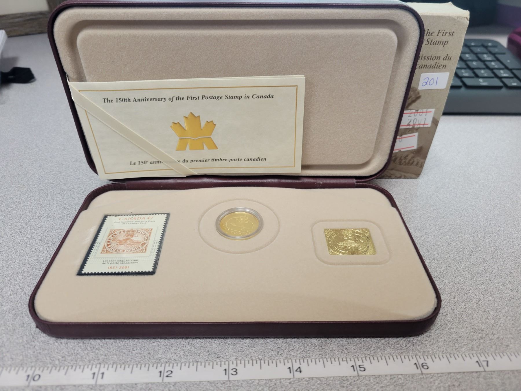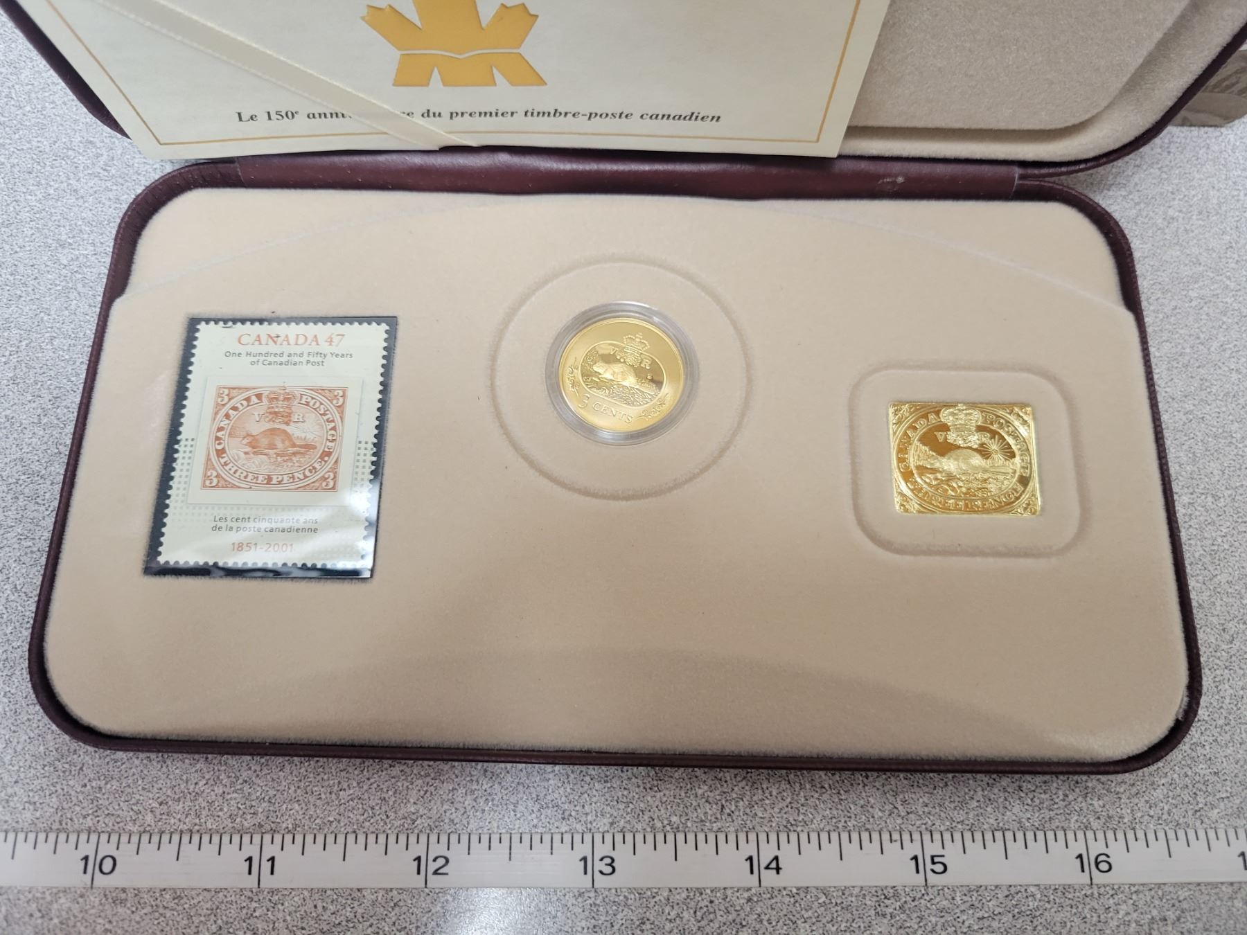 RCM 150th anniversary of the first Canadian postage stamp coin/stamp set. Coin is 92.5% silver and 24K gold plated. 5.39 gram