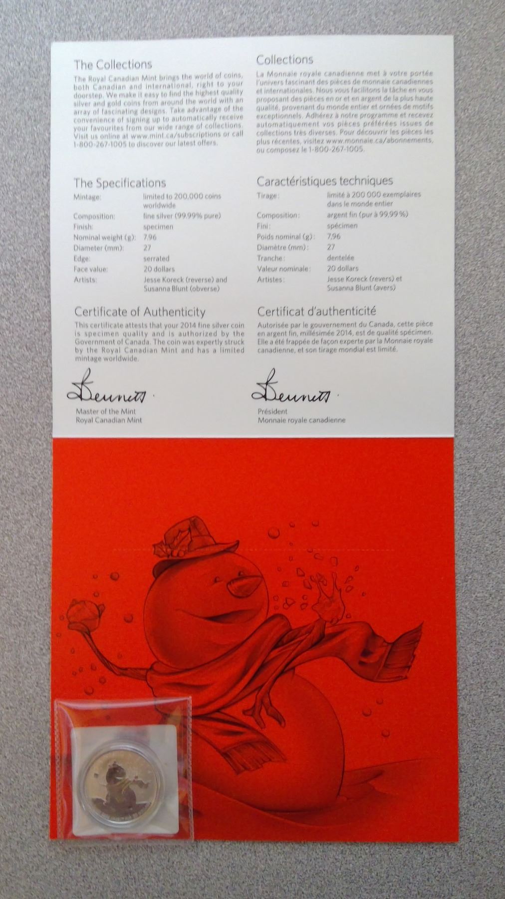 RCM 2014 $20 Specimen Fine Silver .9999 in original packaging
