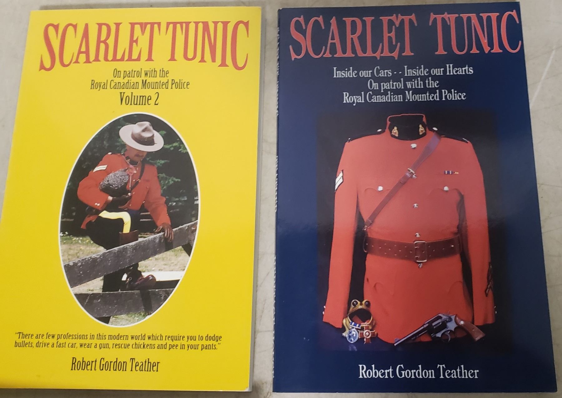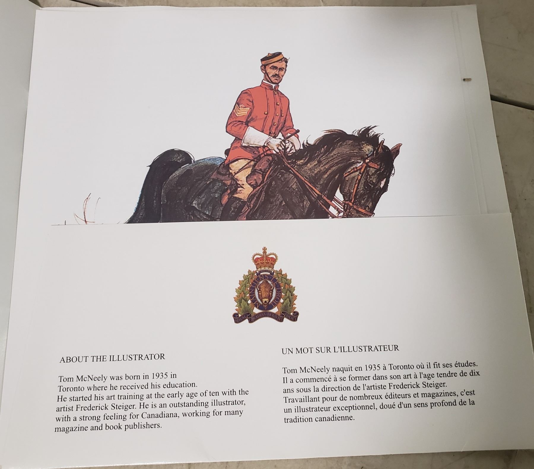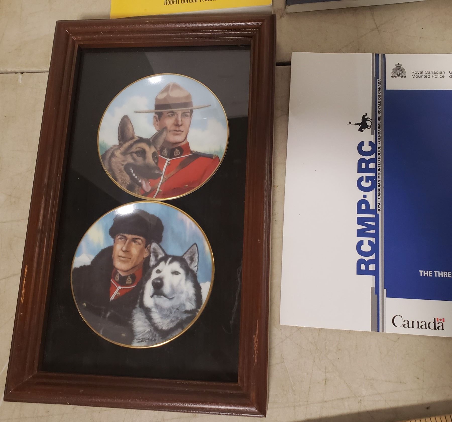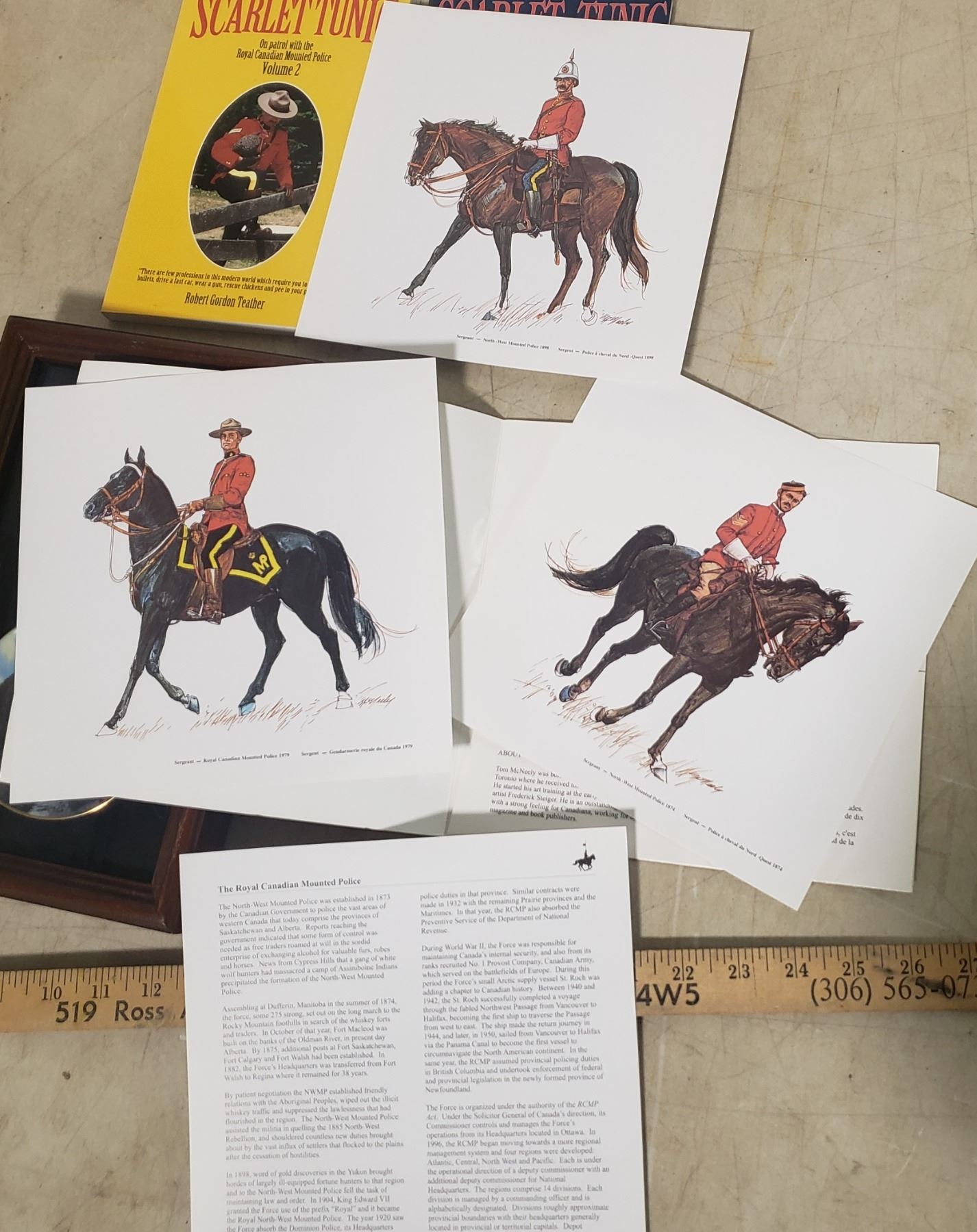 RCMP scarlet tunic collection of books, framed plates and art work -"The three Sergeants / Les Trois Sergents"