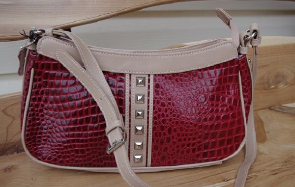 RED LEATHER CROC HANDBAG/quality leather croc handbag single adjustable shoulder strap has inside zipper compatement as well as side organizer compartment outer zipper compartment approx 12" x 7"