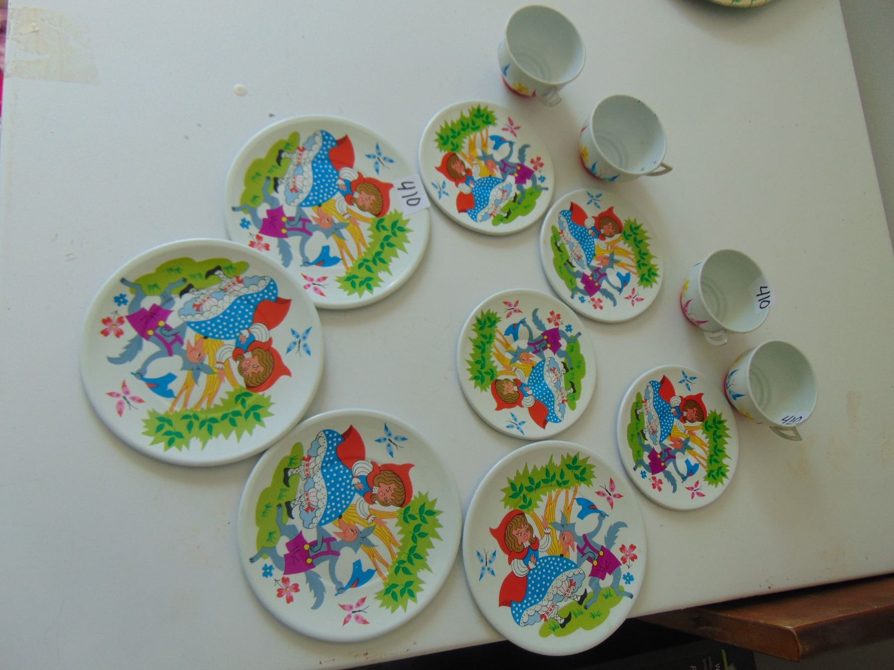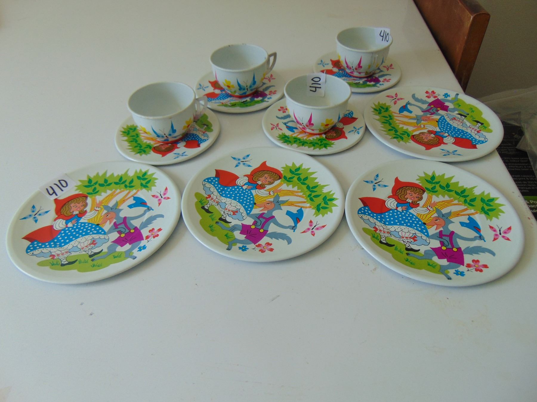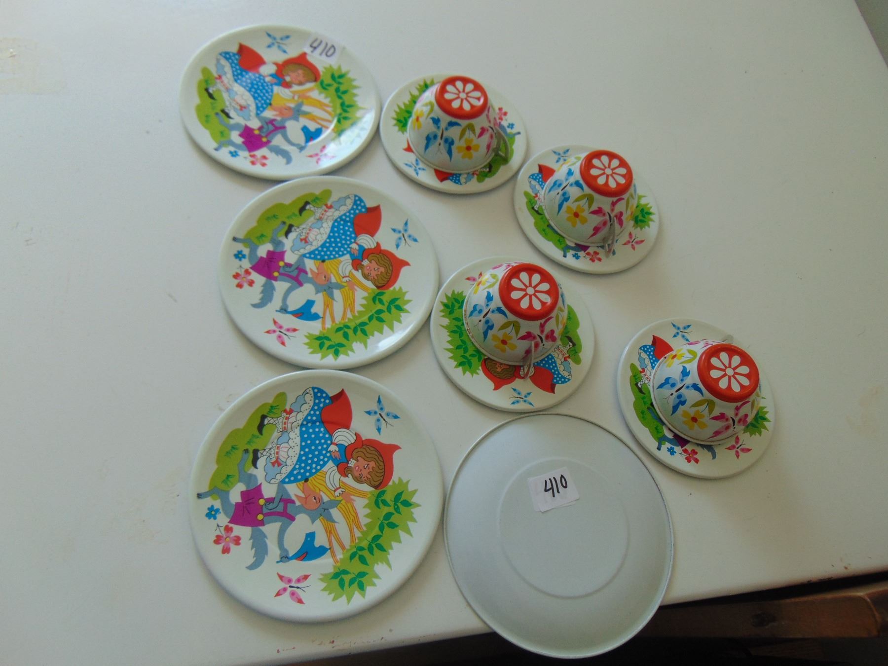 RED RIDING HOOD PAINTED METAL TEA SET, 4 CUPS SAUCERS PLATES