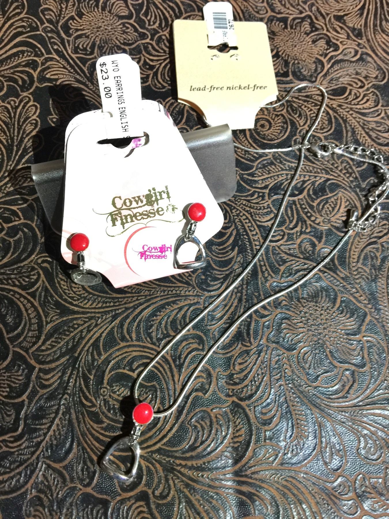 RED STONE ENGLISH STIRRUP NECKLACE AND EARRINGS/NICKEL FREE