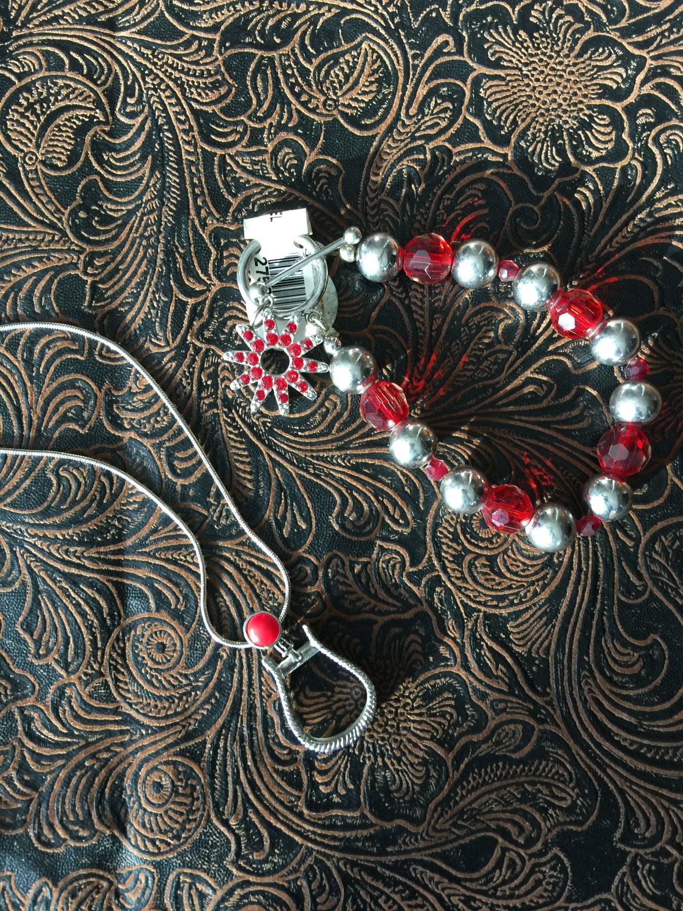 RED STONE WESTERN STIRRUP NECKLACE/RED CRYSTAL SPUR ROWEL BRACELET/NICKEL FREE