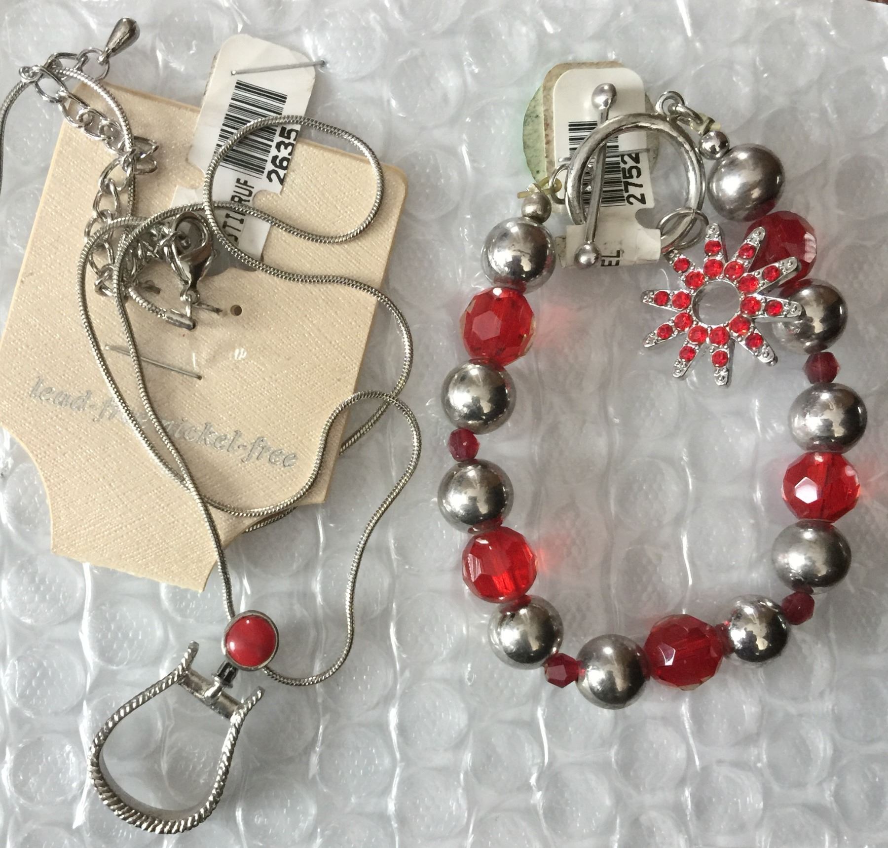 RED STONE WESTERN STIRRUP NECKLACE/RED CRYSTAL SPUR ROWEL BRACELET/NICKEL FREE