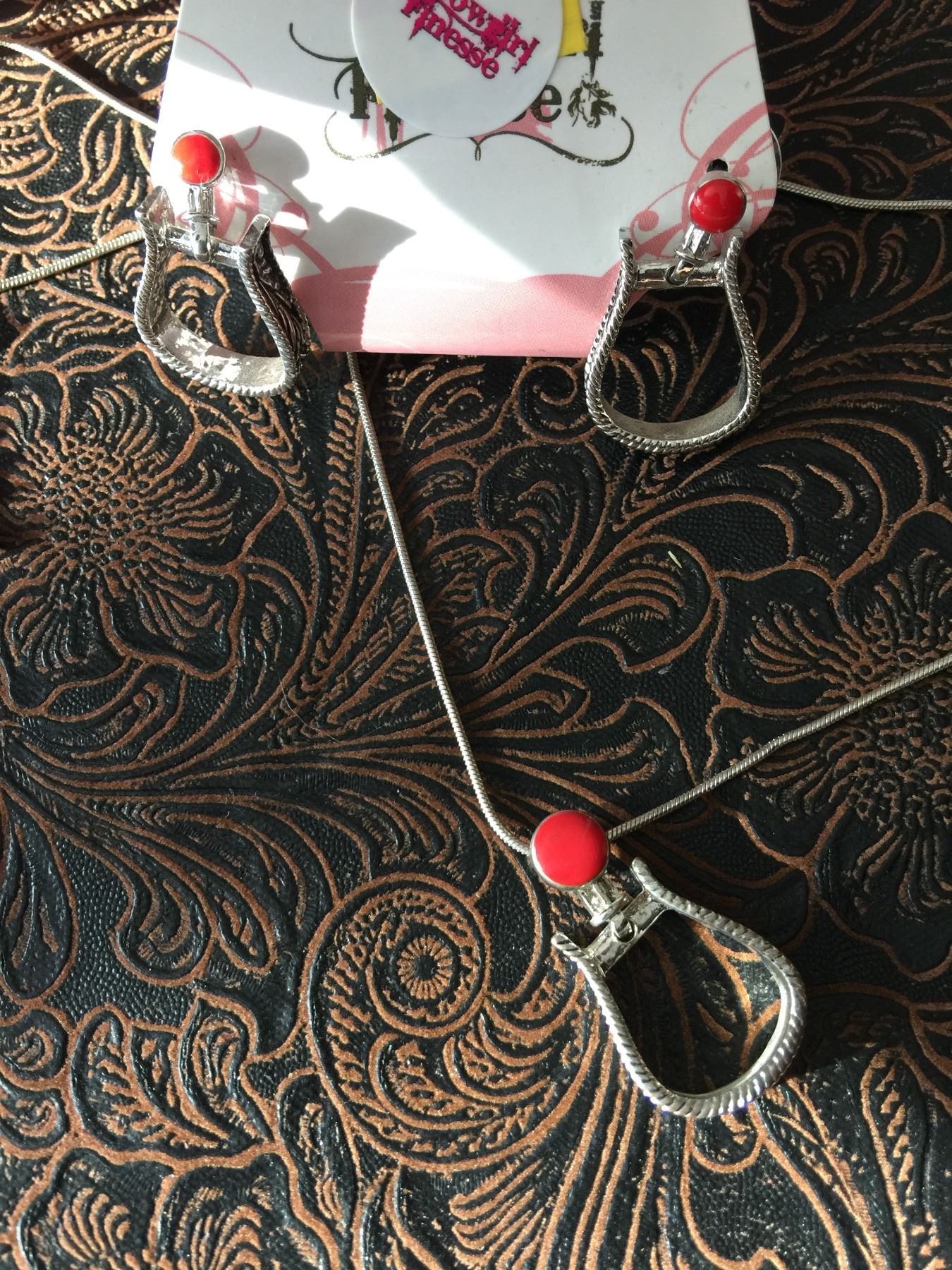 RED STONE WESTERN STIRRUP NECKLACE/RED CRYSTAL SPUR ROWEL BRACELET/NICKEL FREE