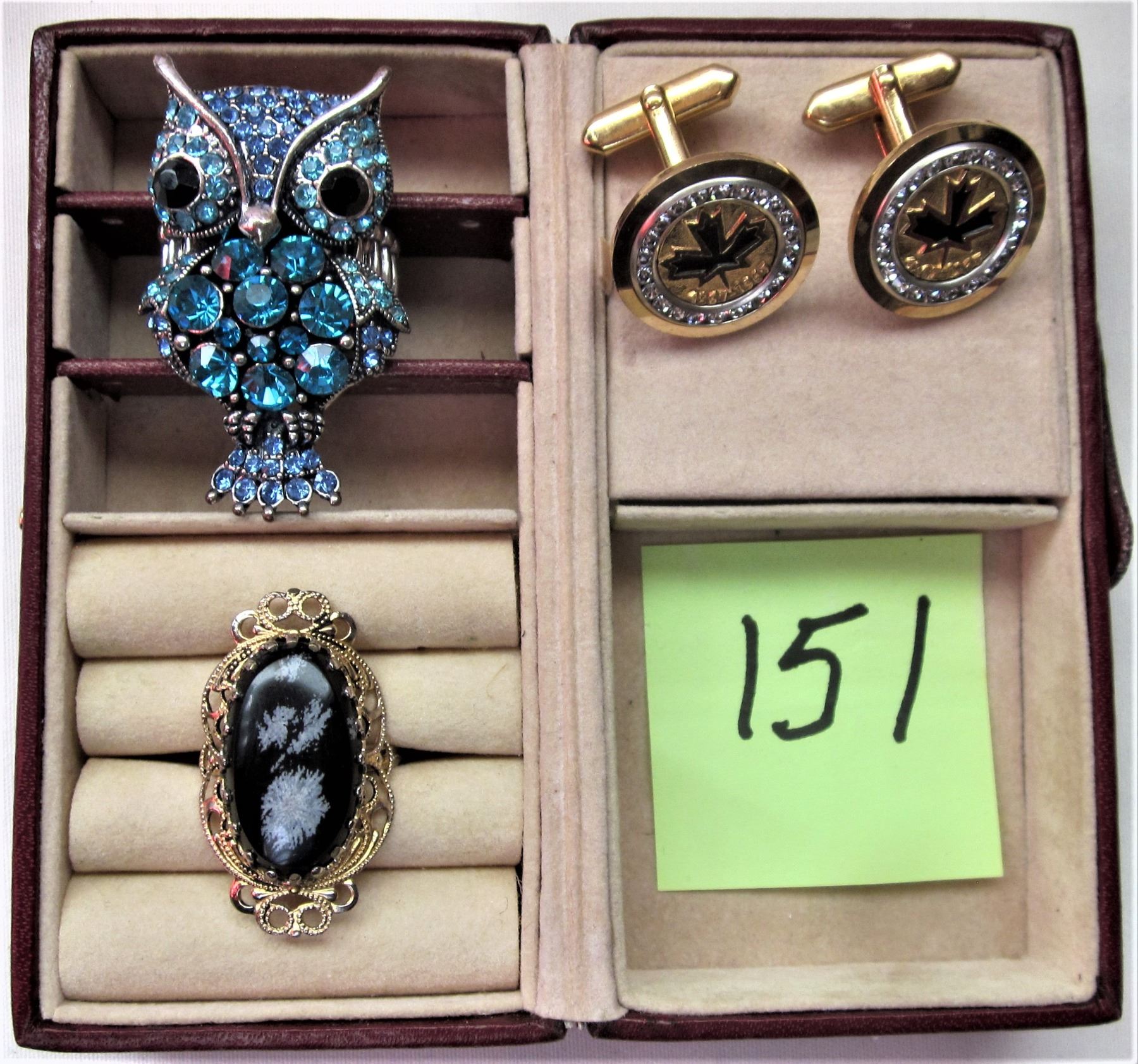 RHINESTONE OWL RING, GOLD TONE FILAGREE RING, BLACK OVAL STONE, PAIR CANADIAN CENTENNIAL MENS BOXED CUFF LINKS