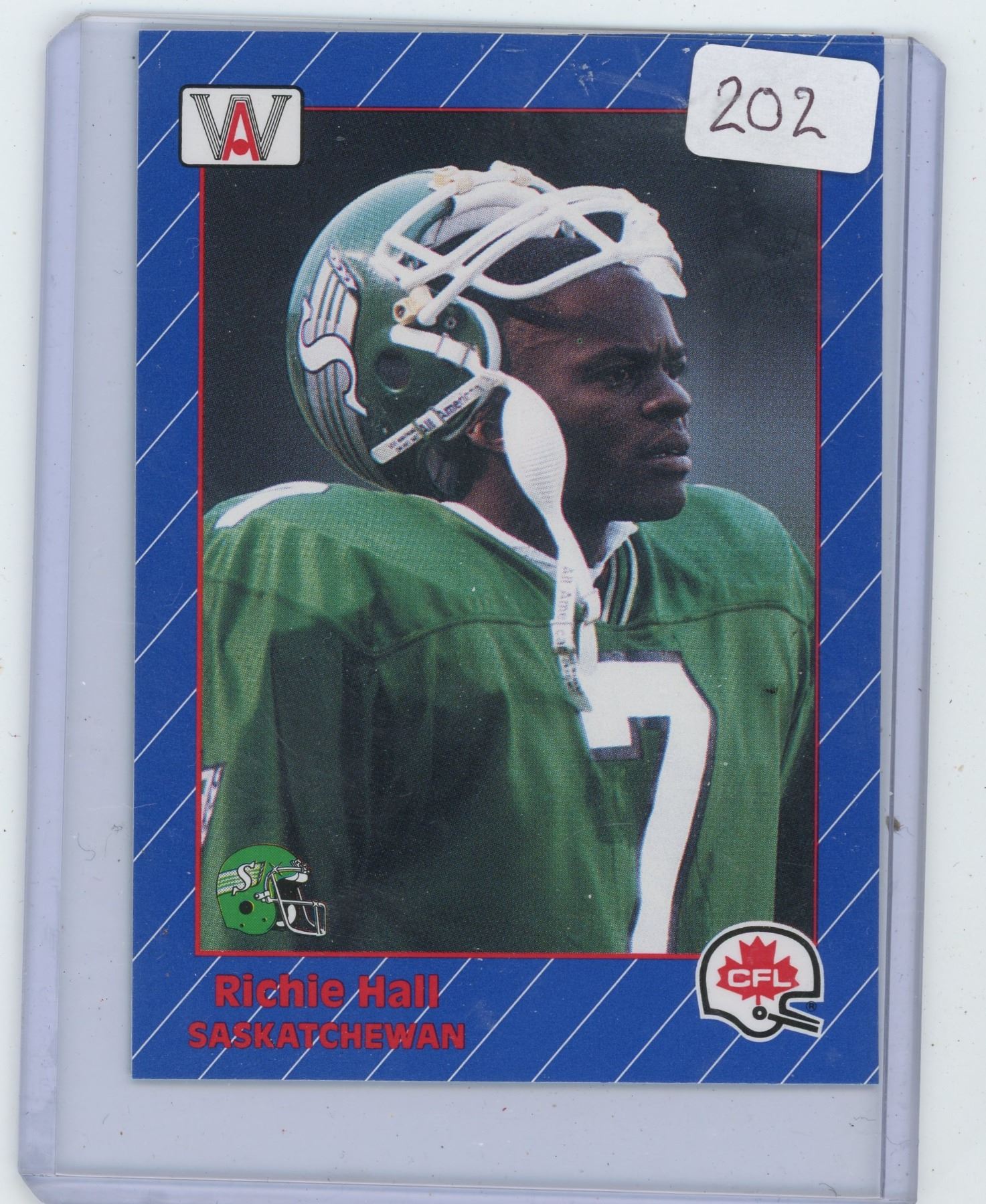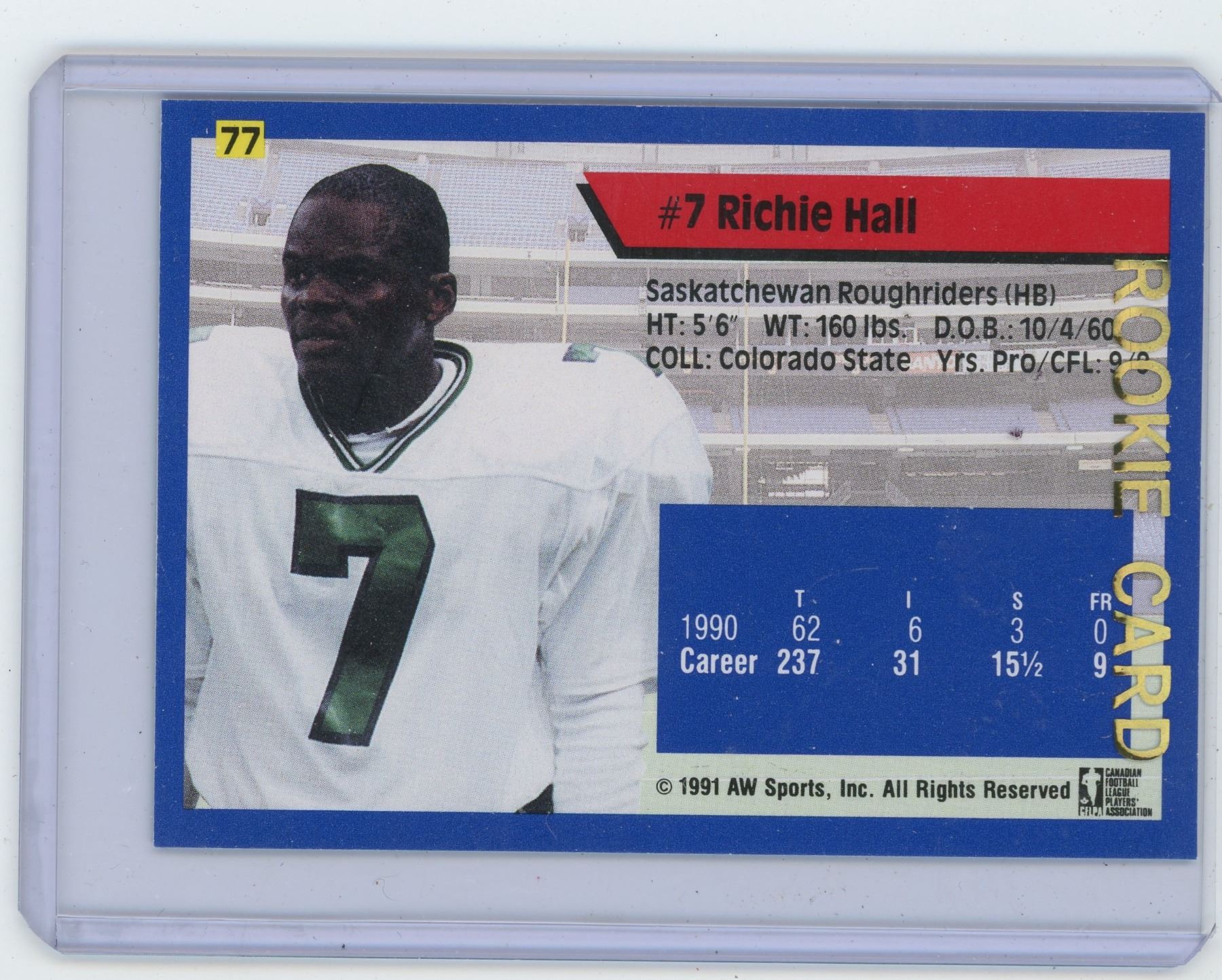 RITCHIE HALL, SASKATCHEWAN ROUGHRIDERS DB, CFL FOOTBALL CARD. 1991 AW SPORTS. GEM UNC.