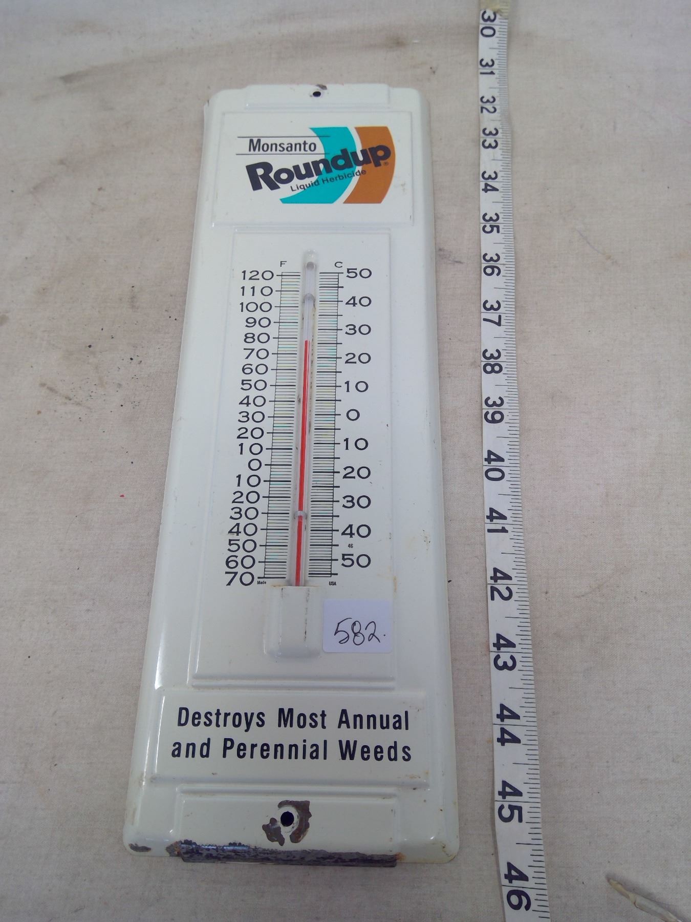 ROUND-UP CHEMICAL TIN ADVERTISING THERMOMETER