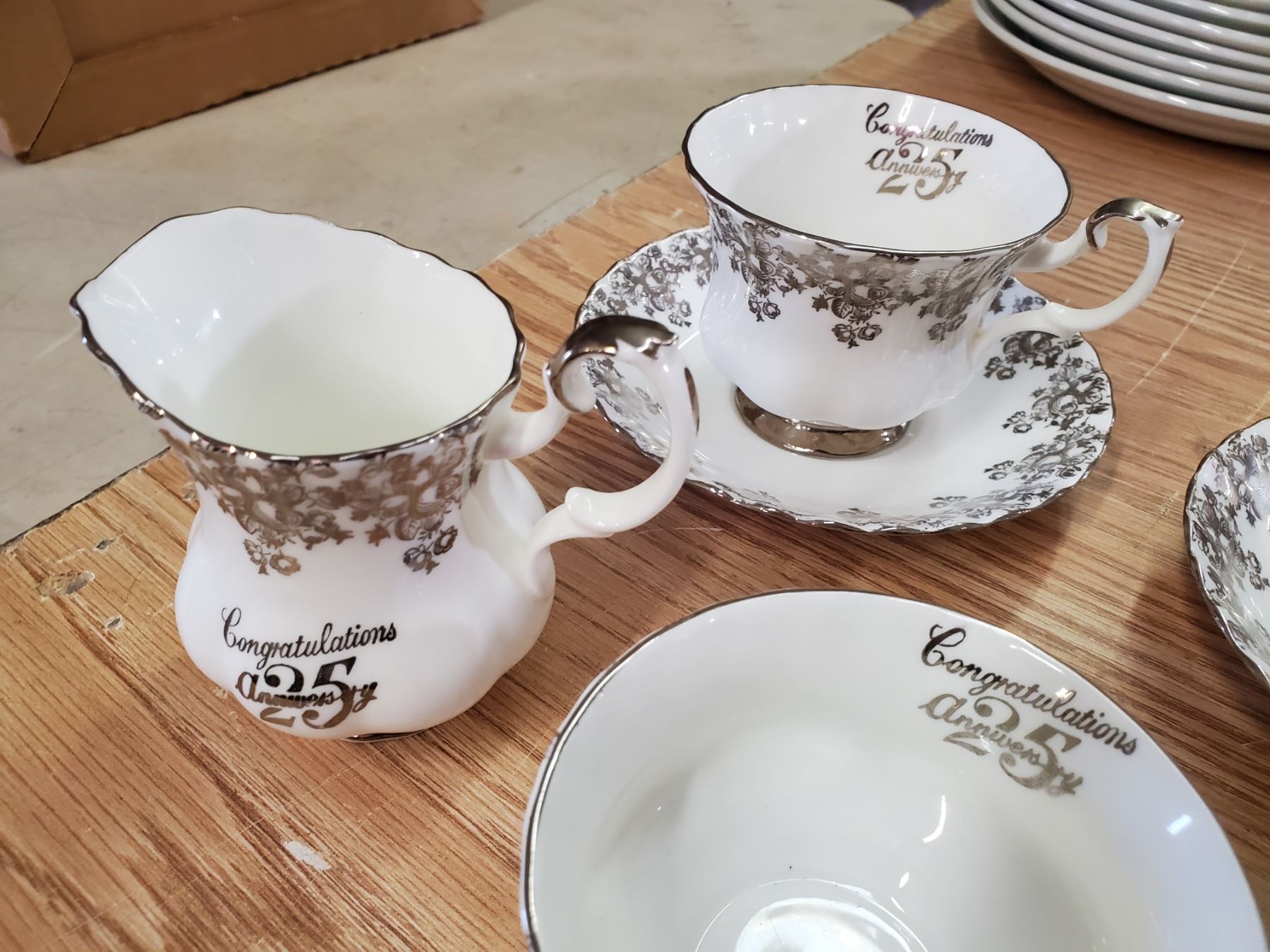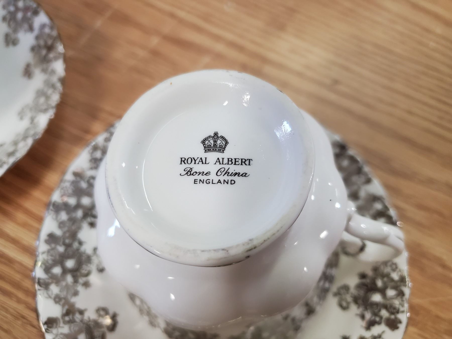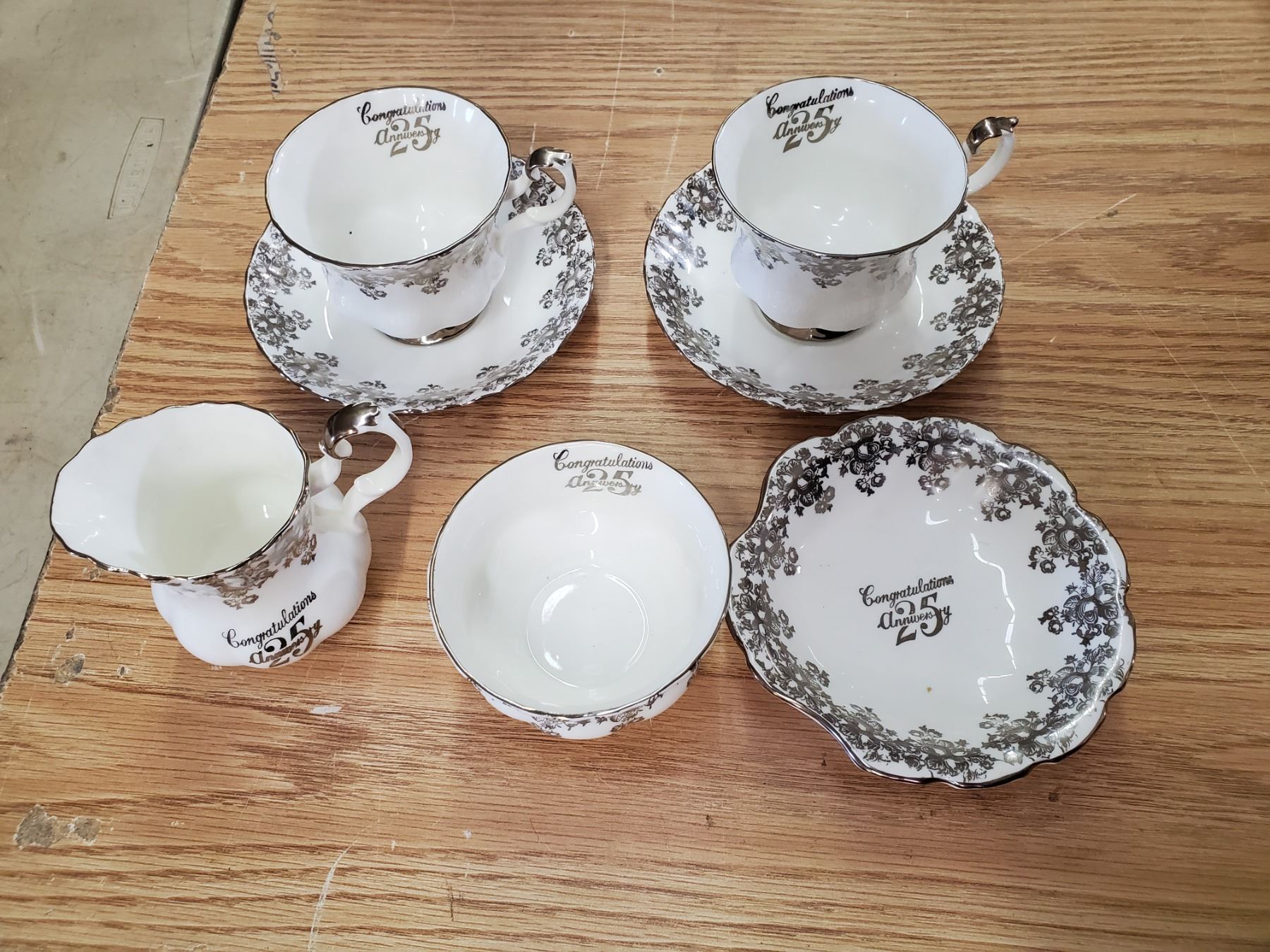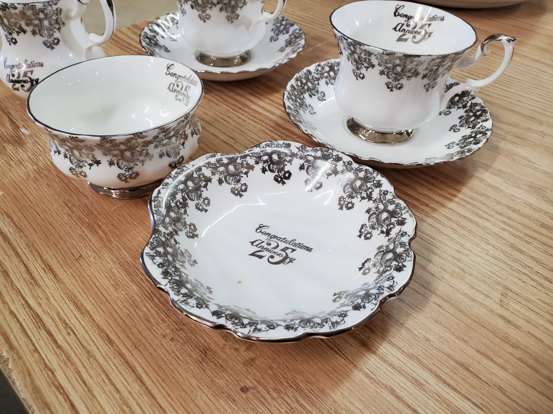 ROYAL ALBERT 25TH ANNIVERSARY TEACUPS & SAUCERS, CREAM, SUGAR & TRAY