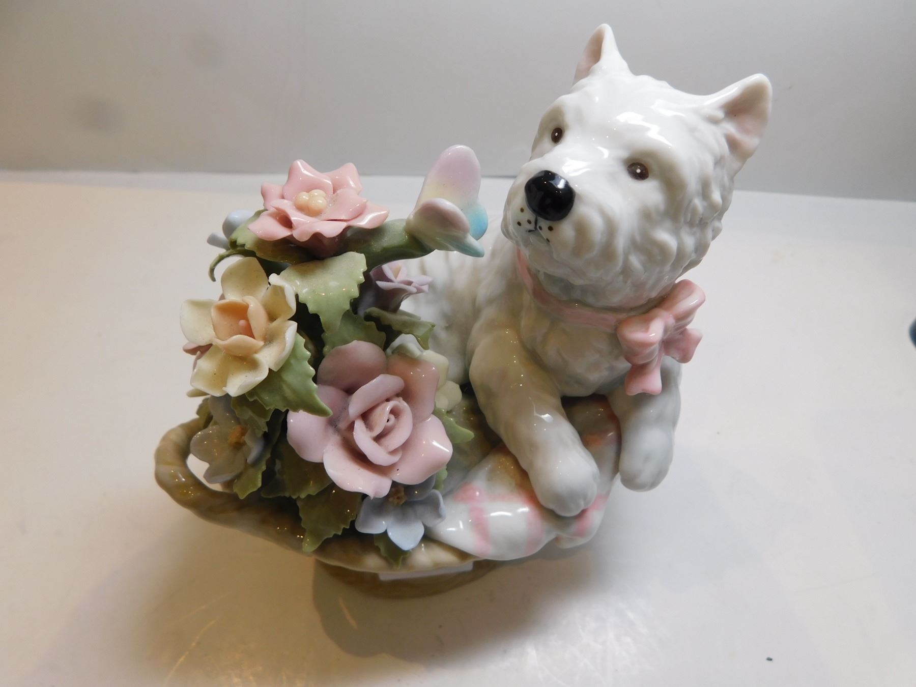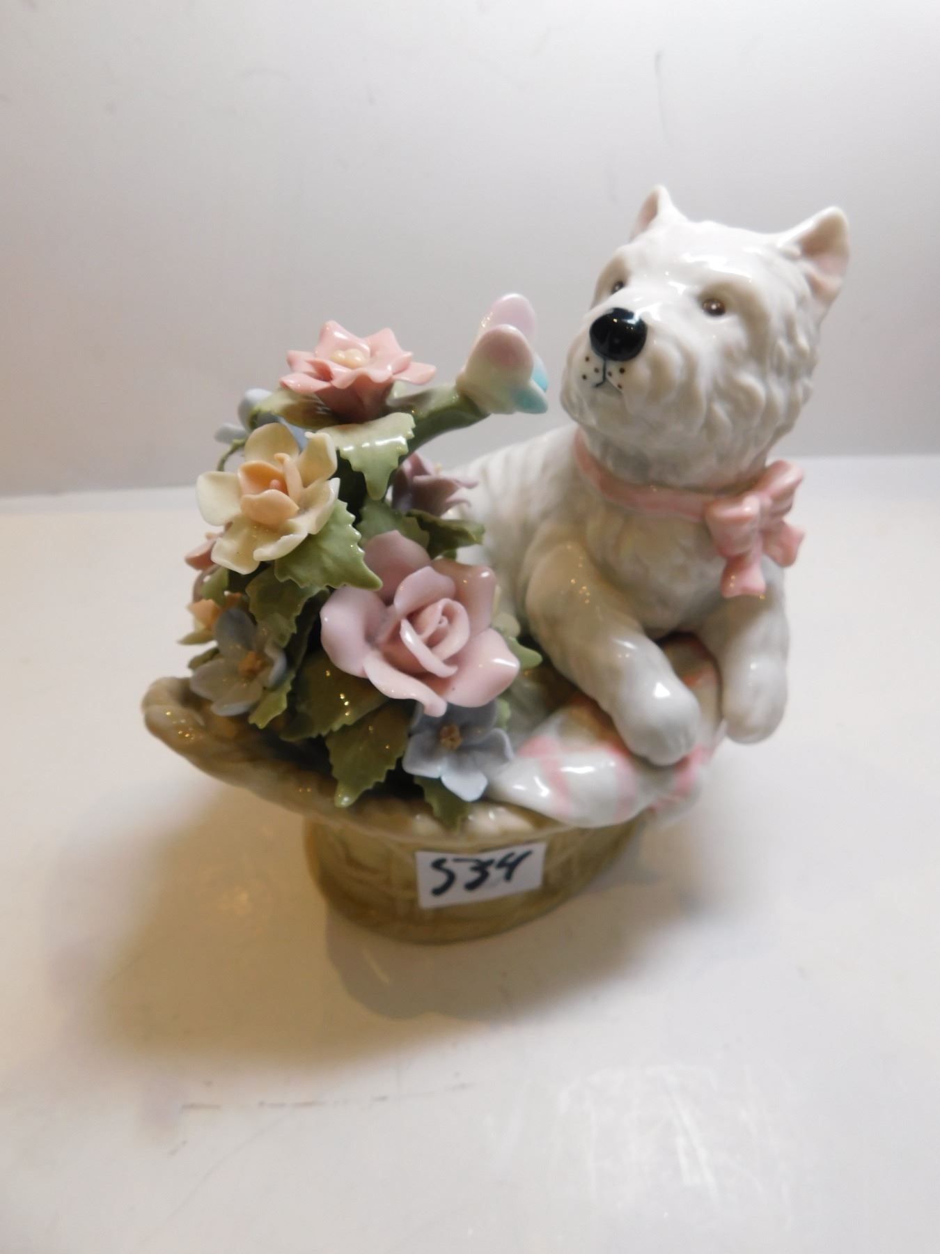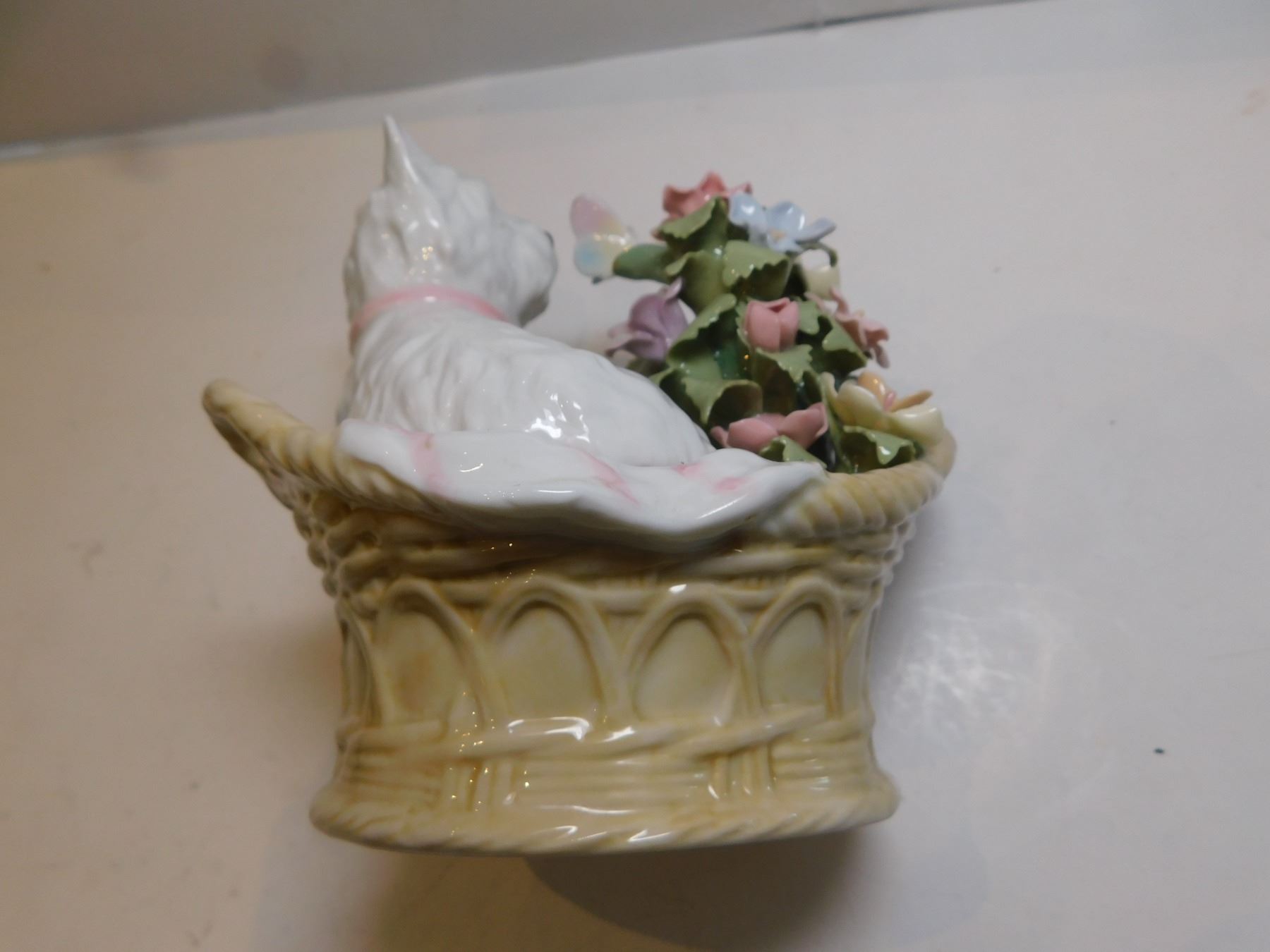 ROYAL ALBERT MUSICAL DOG IN BASKET WITH FLOWERS, WINDUP ON BOTTOM