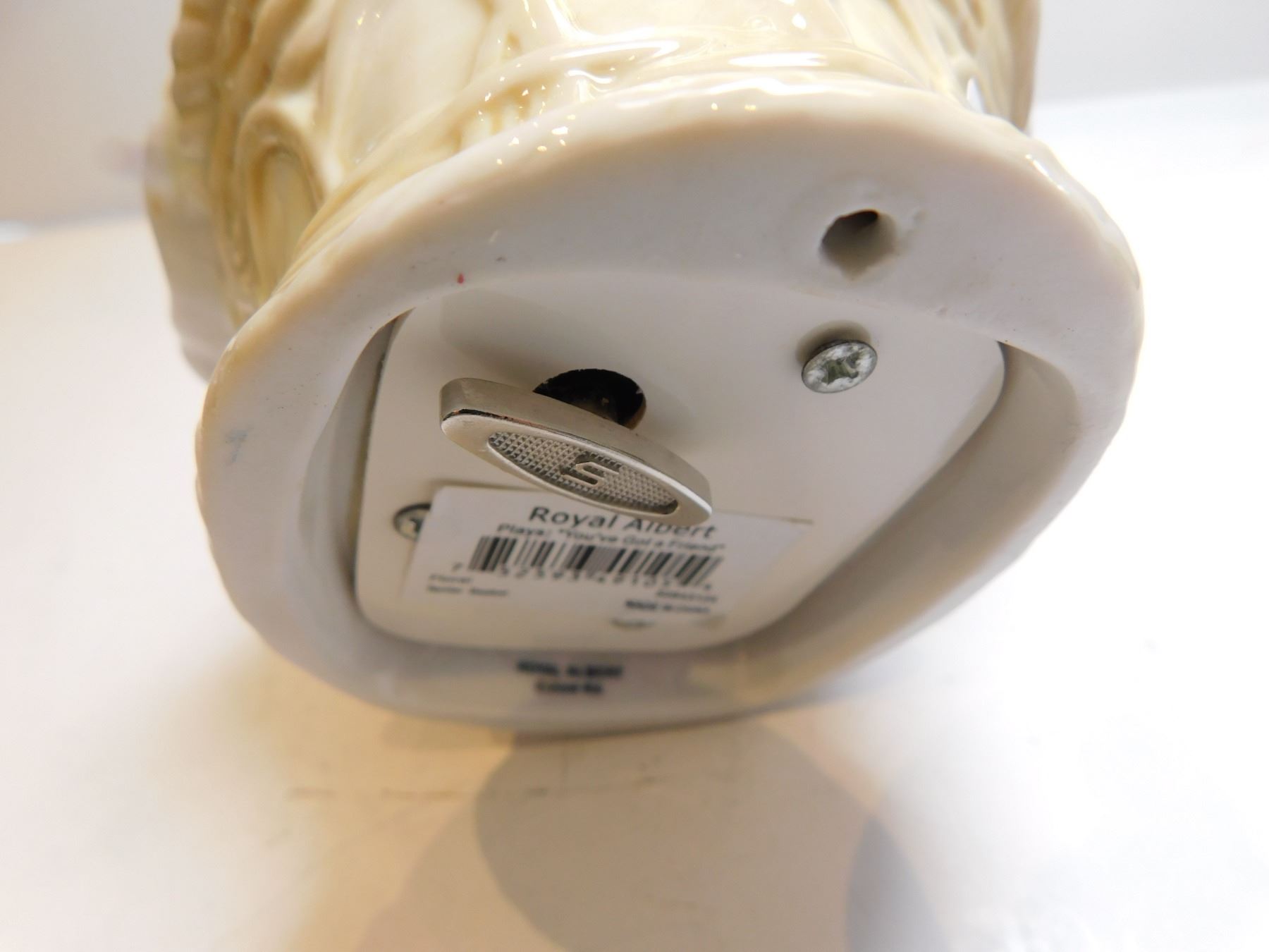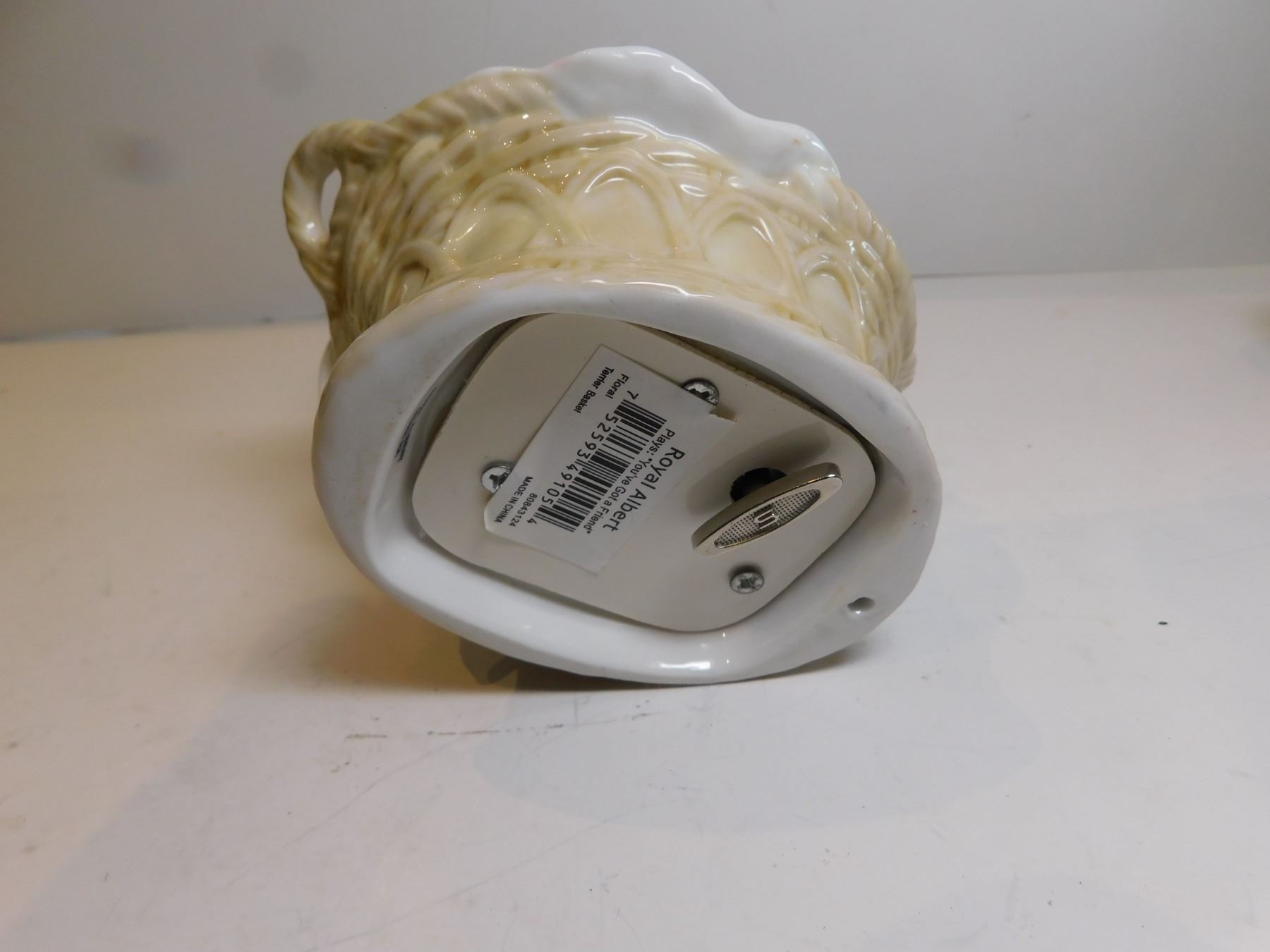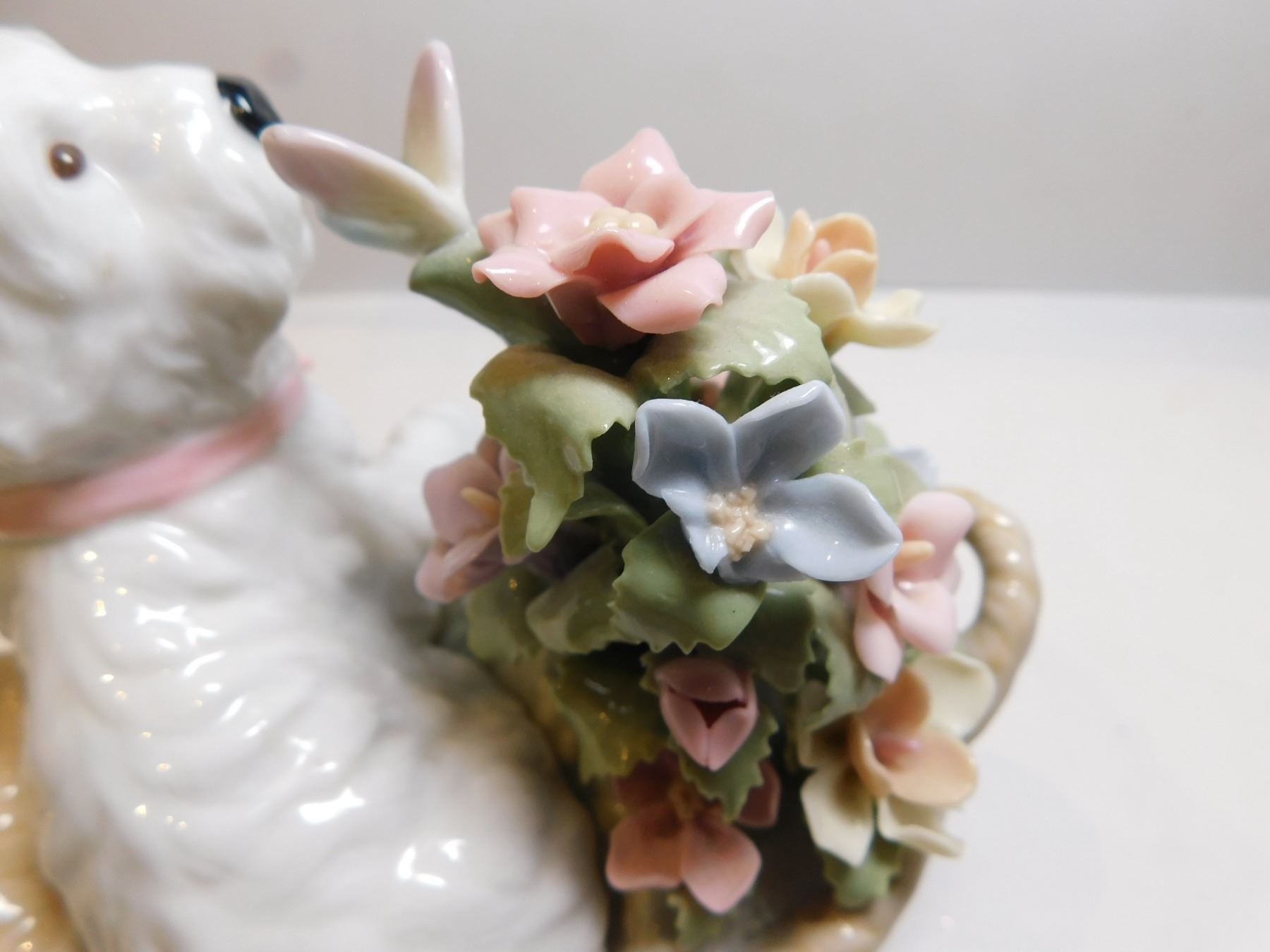 ROYAL ALBERT MUSICAL DOG IN BASKET WITH FLOWERS, WINDUP ON BOTTOM