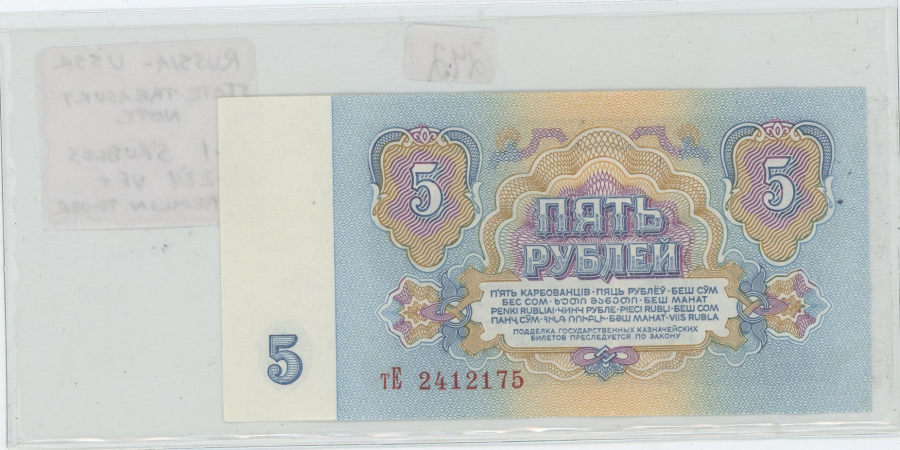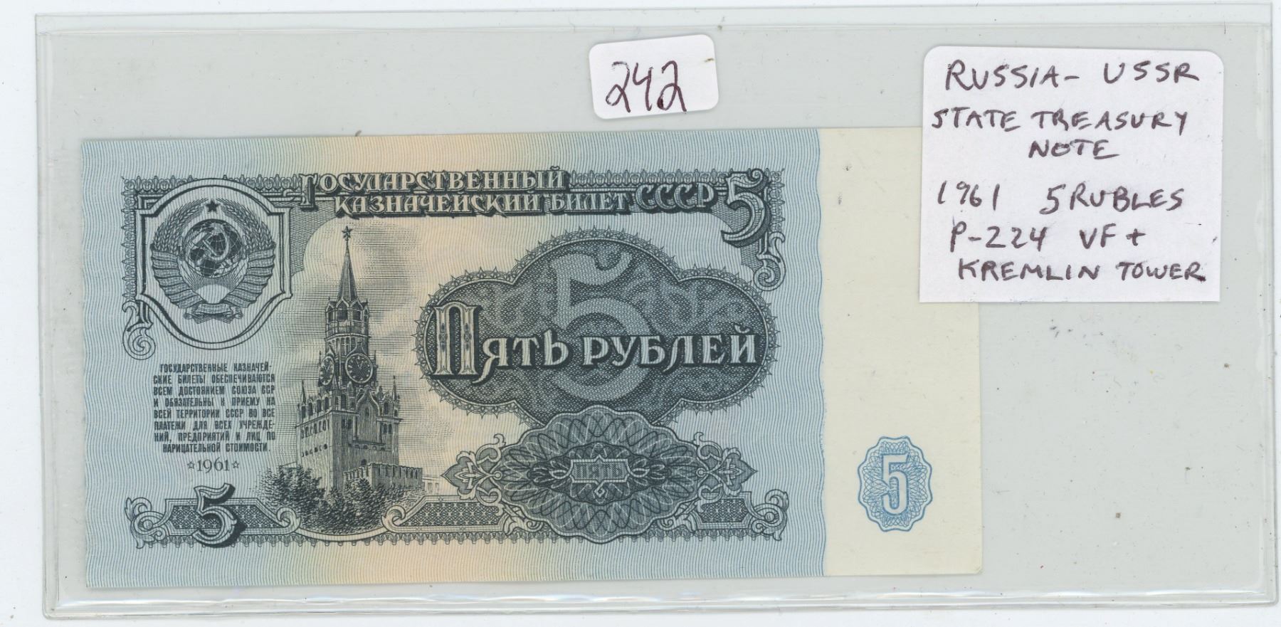RUSSIA – USSR. 1961 5 RUBLES STATE TREASURY NOTE. KREMLIN TOWER. P-224. VF+.