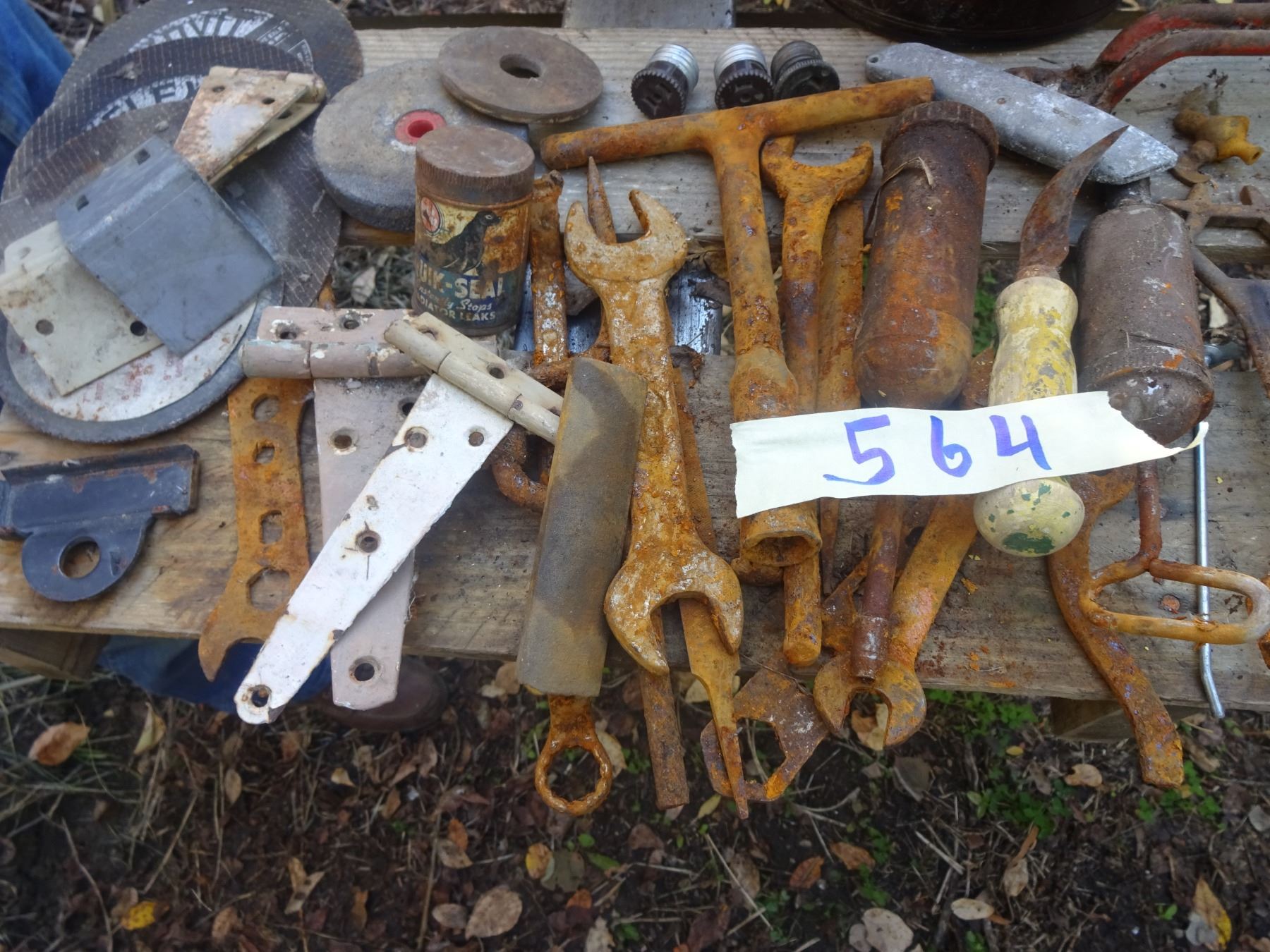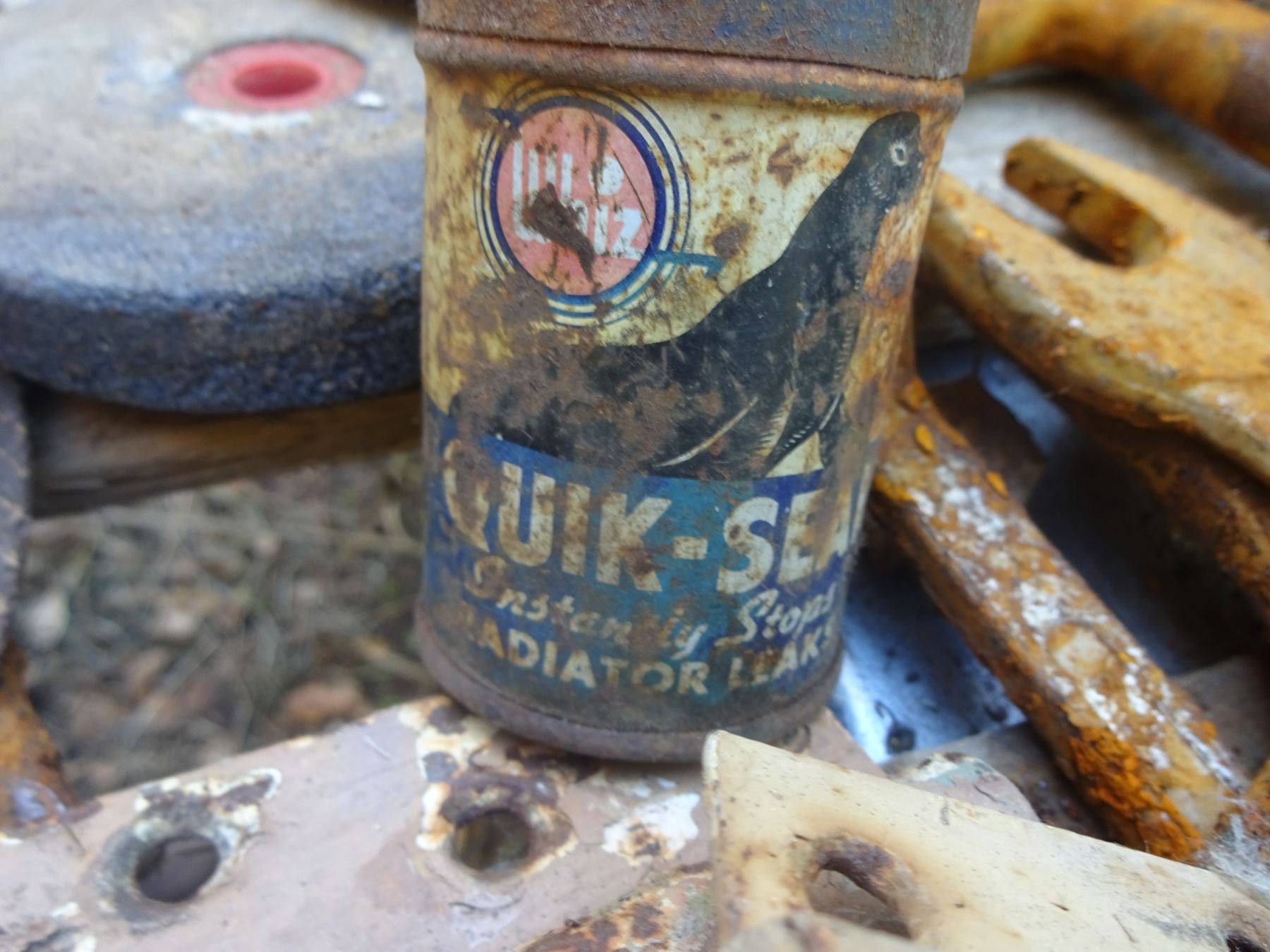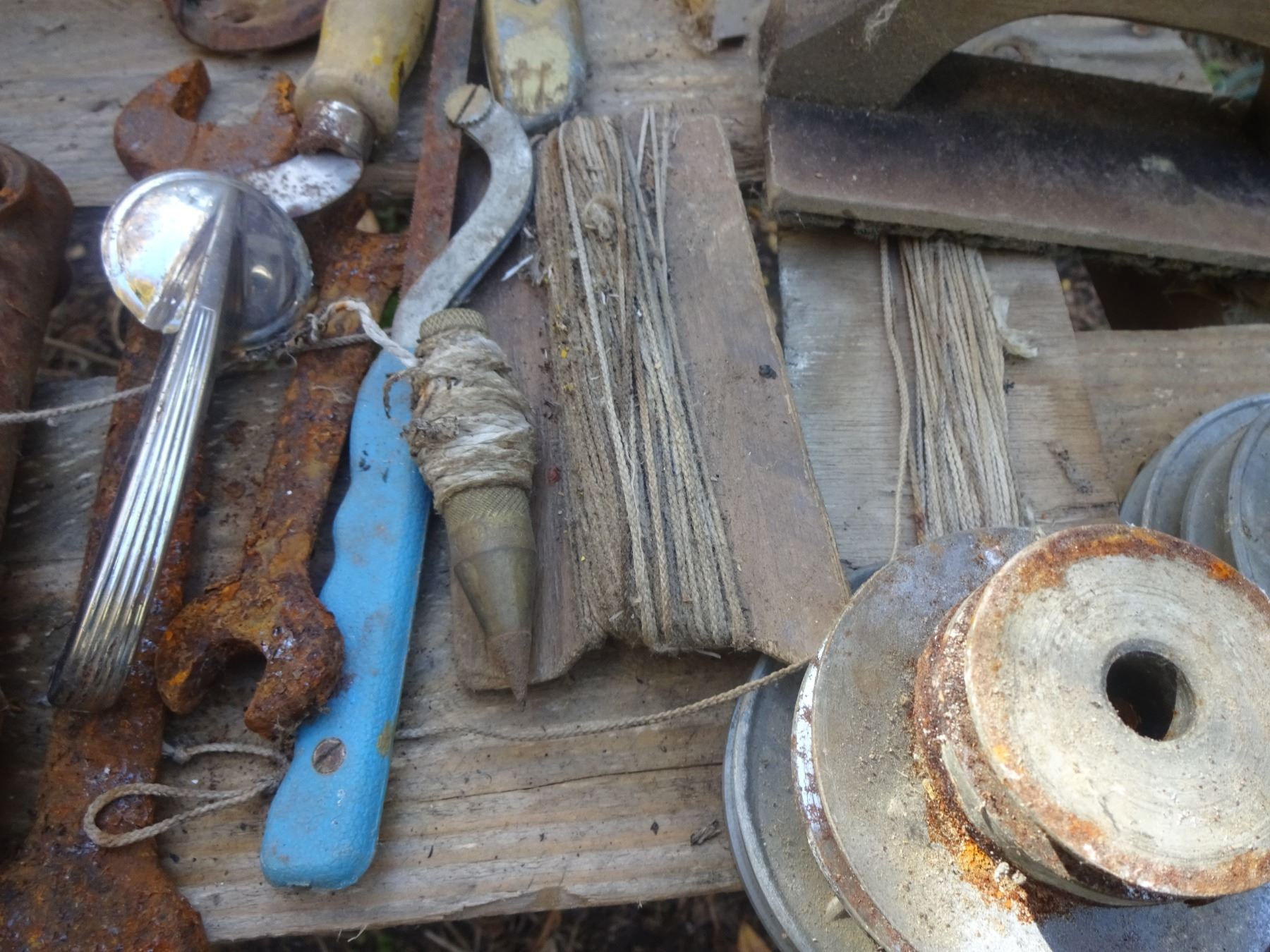RUST TOOLS + ASSORTED PULLEYS + OLD CAN RADITON SEAL + ECT