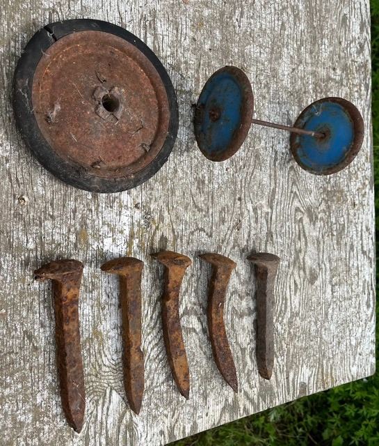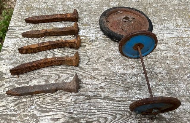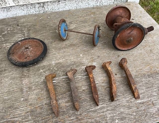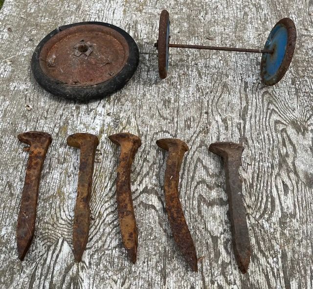Rail road spikes x5 & Antique wagon wheels x3