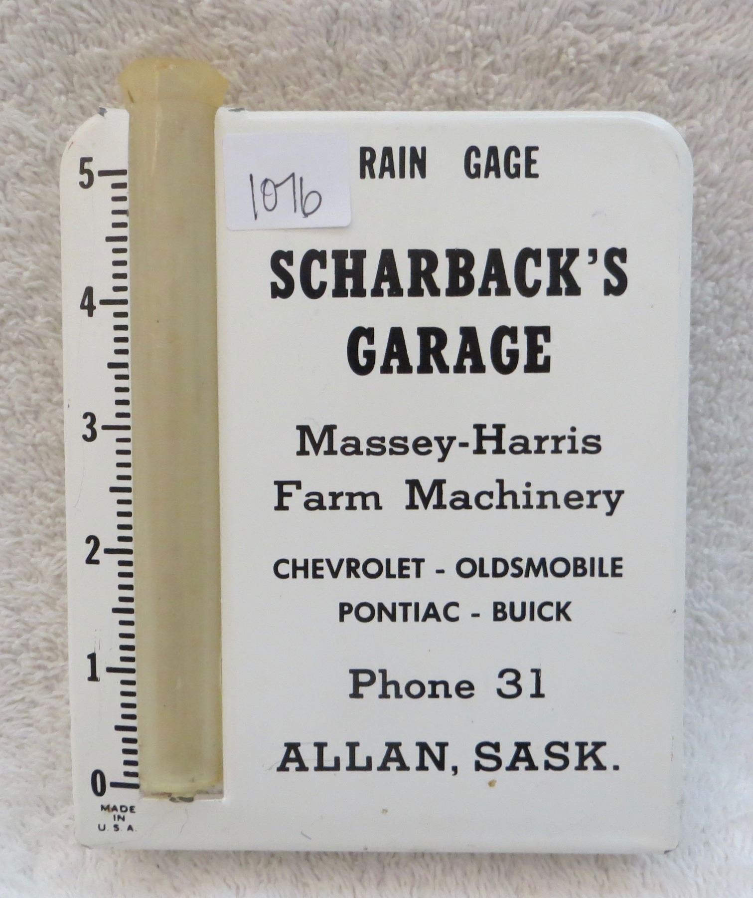 Rain gauge - "Scharback's Garage" - metal Massey Harris