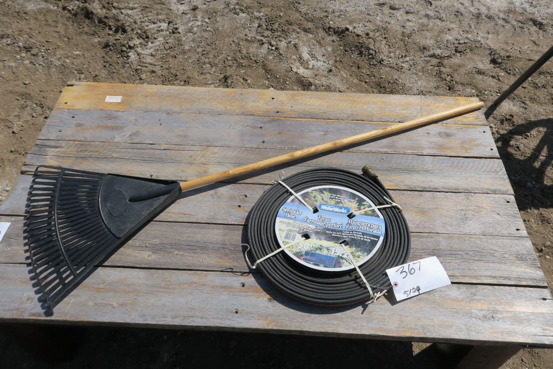 Rake, 50' Hose Sprinkler and 4pc Plastic Fence