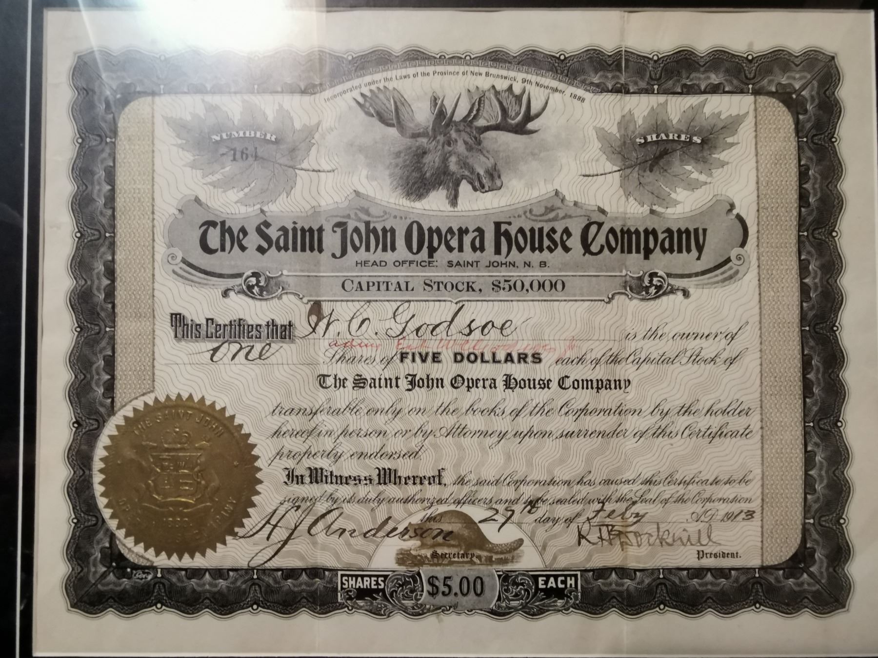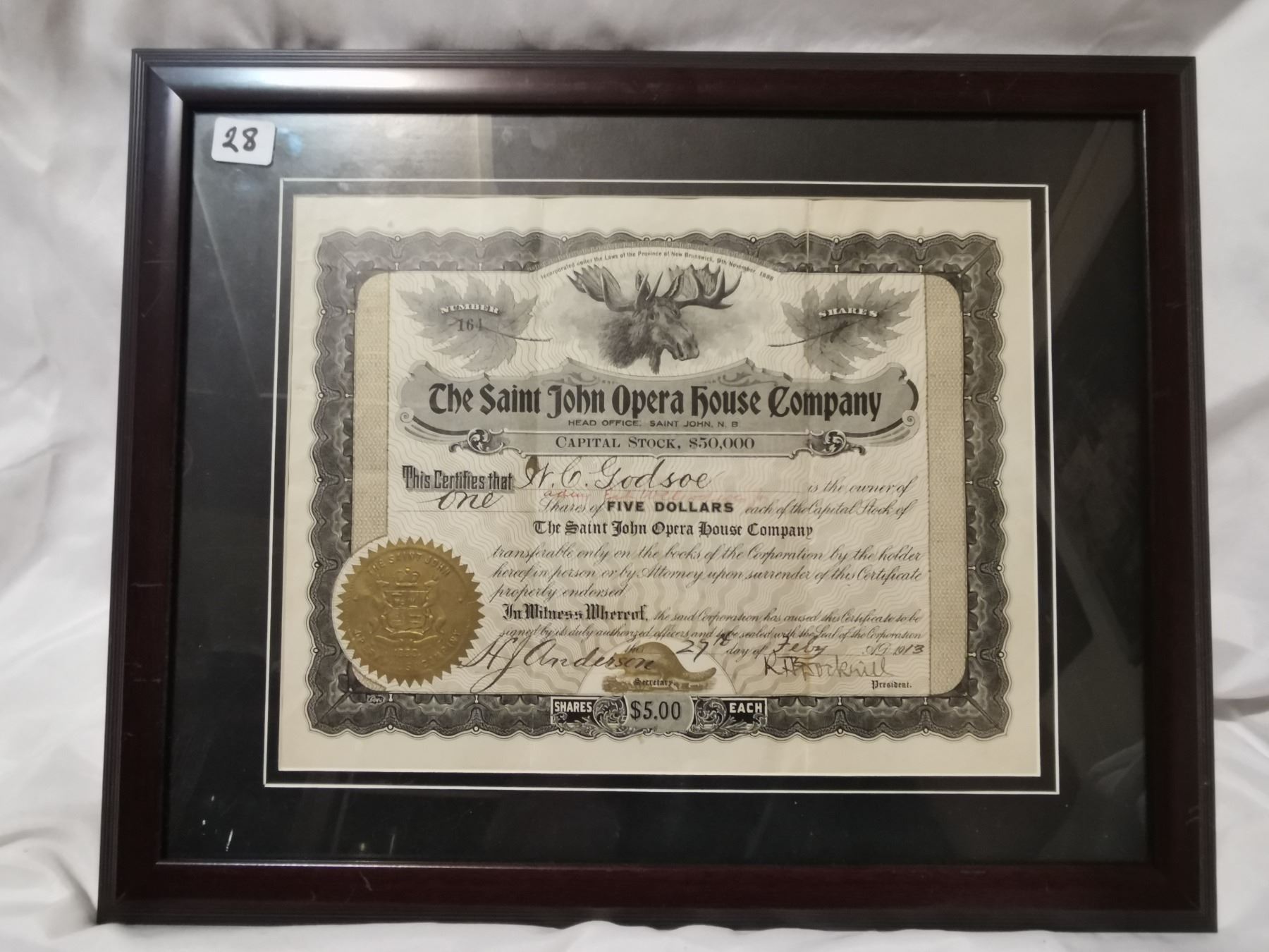 Rare 1913 Saint John $5.00 share bond, framed
