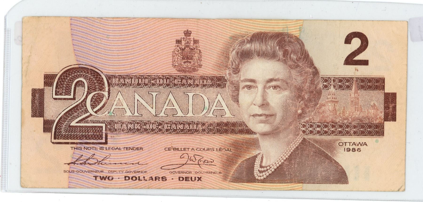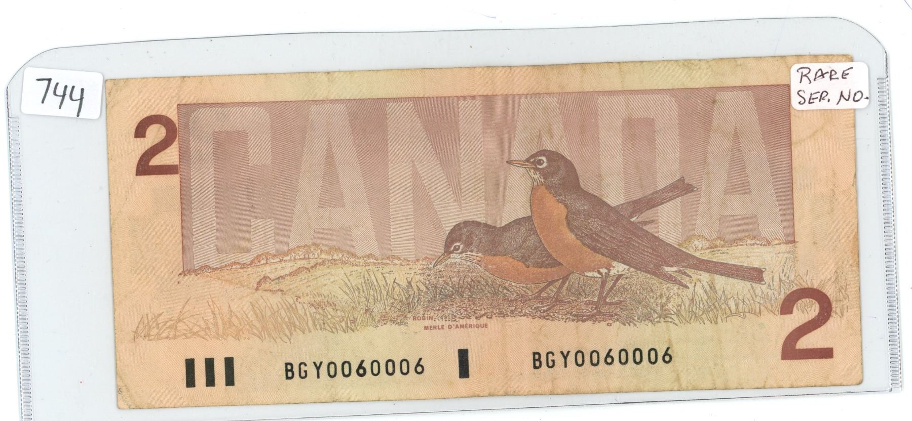 Rare Serial number 1986 canada $2 bill, Thiessen/Crow (#BGY 0060006)