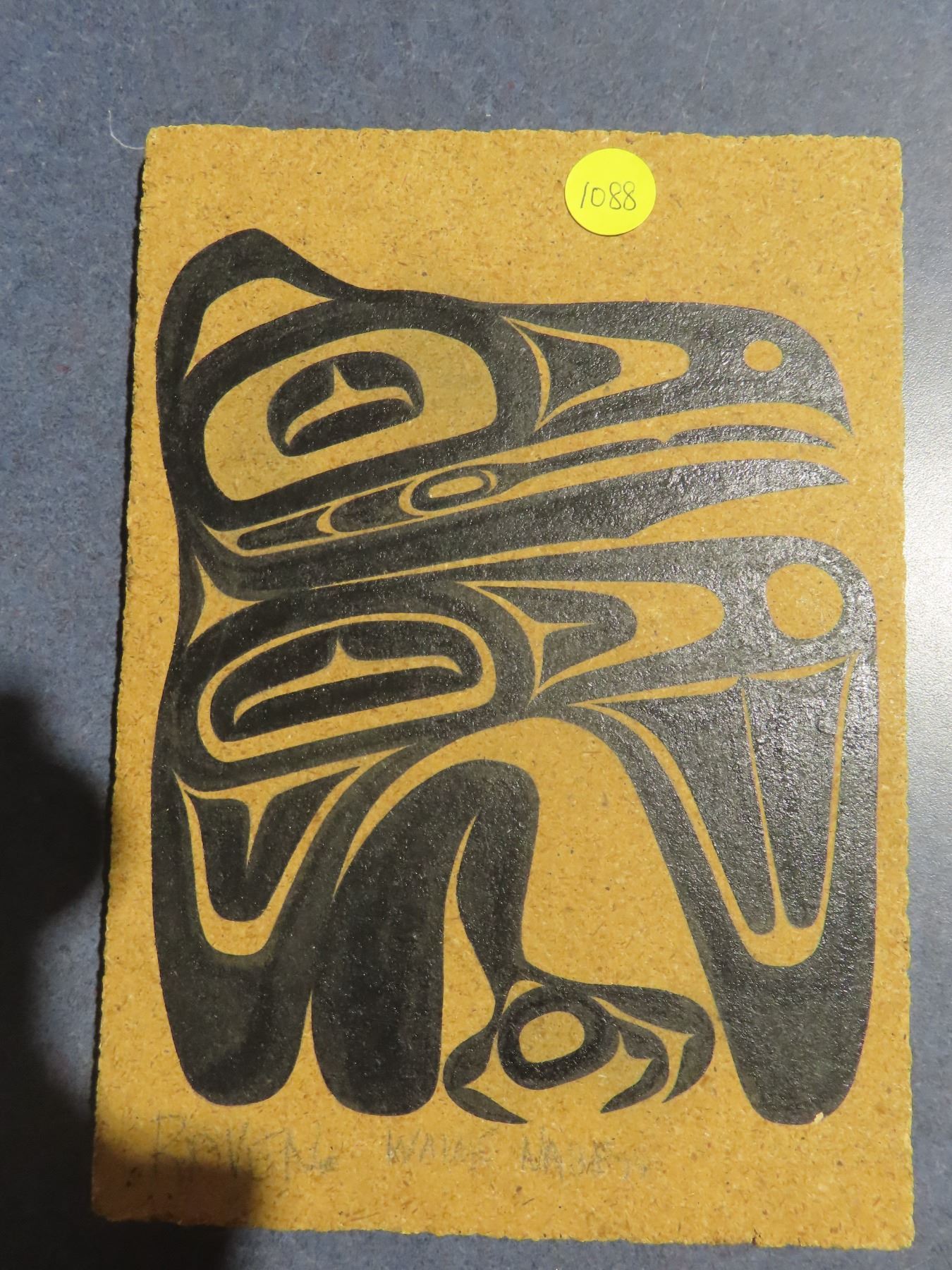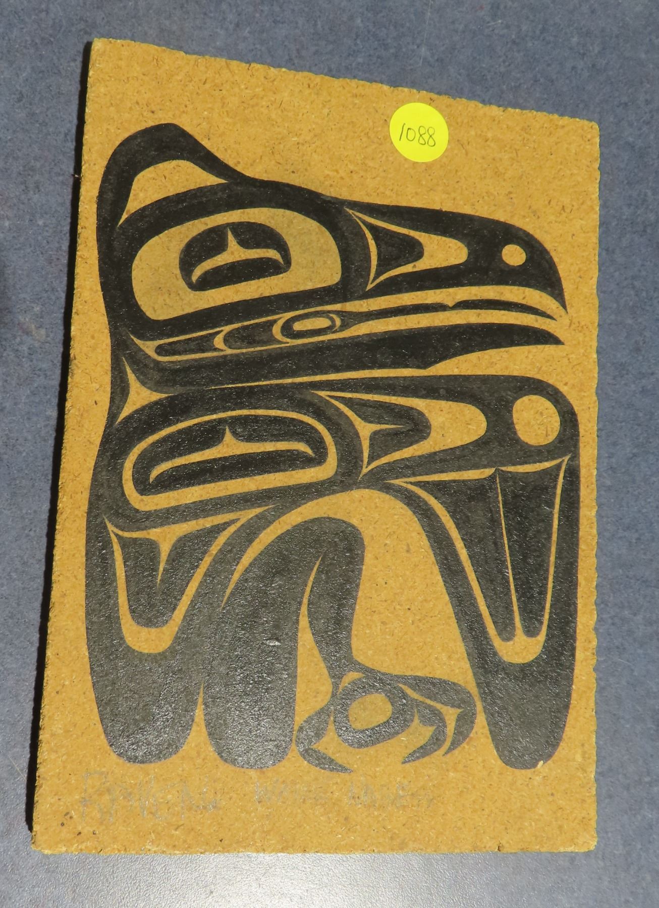 Raven painting ( west coast design on pressed wood) by Wayne? While looking for his family in Saskatchewan in late 1990's 6.5 x8.5 inch