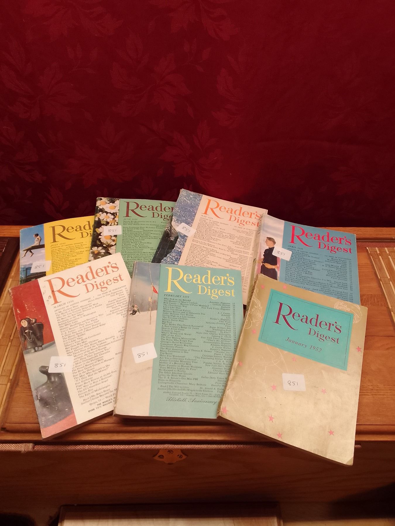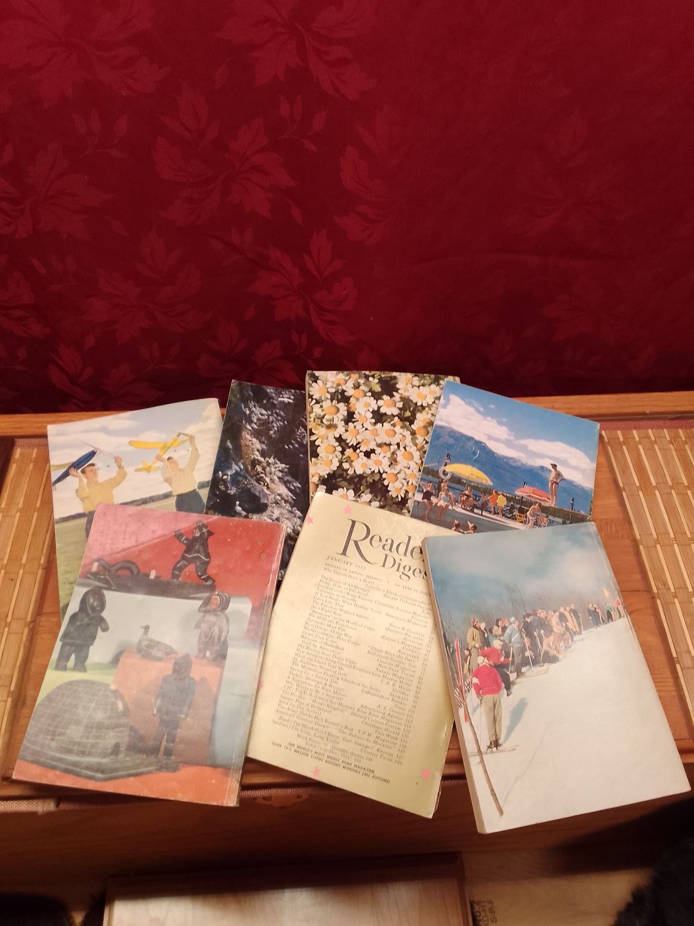 Reader's Digest Lot: 7 Issues from 1952 Vintage Colorful Covers Collection- This set of seven vintage Reader's Digest magazines from 1952 showcases the iconic colorful covers of the era, with themes of nature, winter sports, flowers, and everyday life scenes. These pocket-sized issues deliver condensed stories, articles, humor, and inspiration reflecting early 1950s American culture, family values, and post-war optimism.