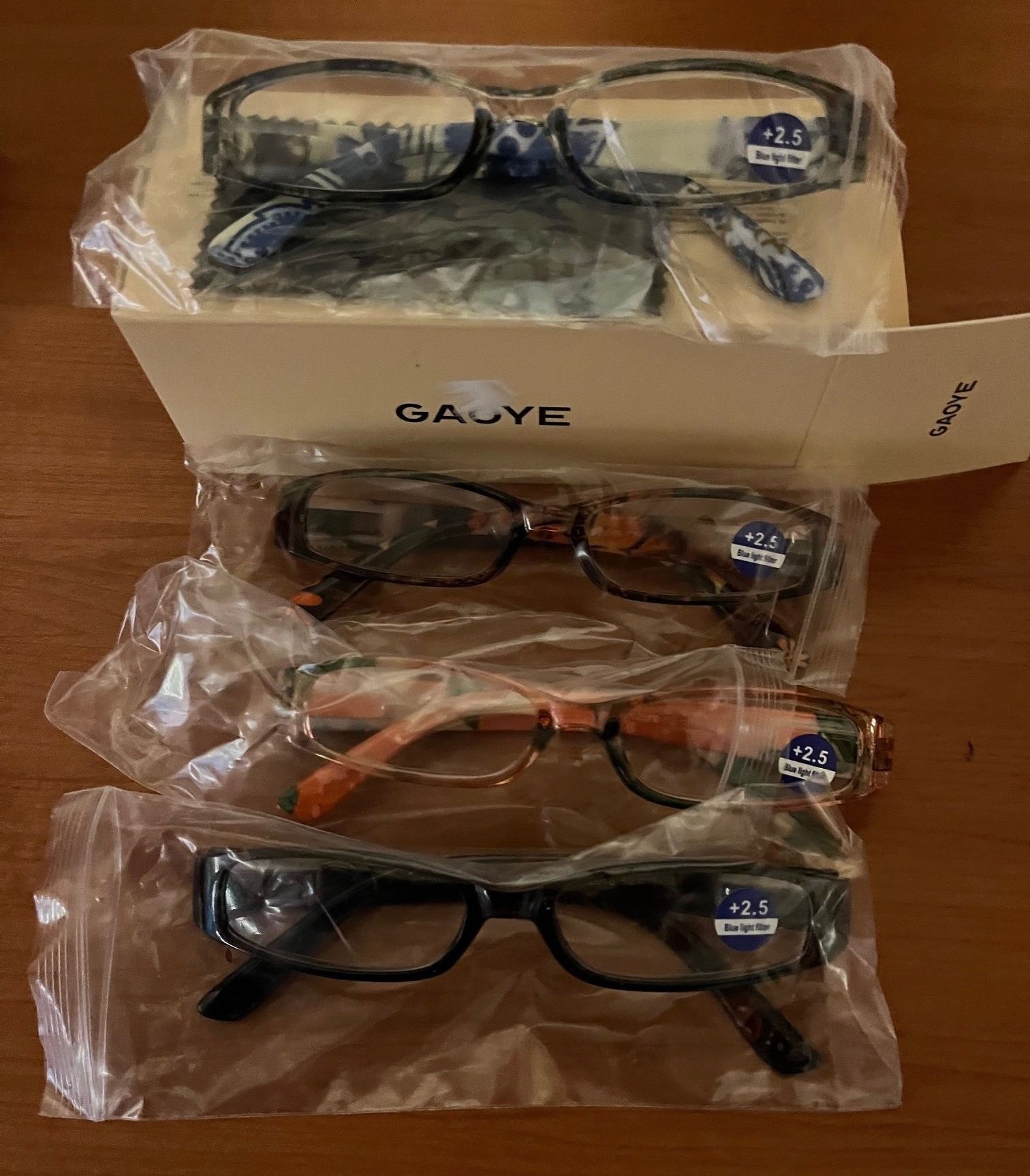 Reading Glasses x 4. +2.50 strength. New with cloth. Never used.