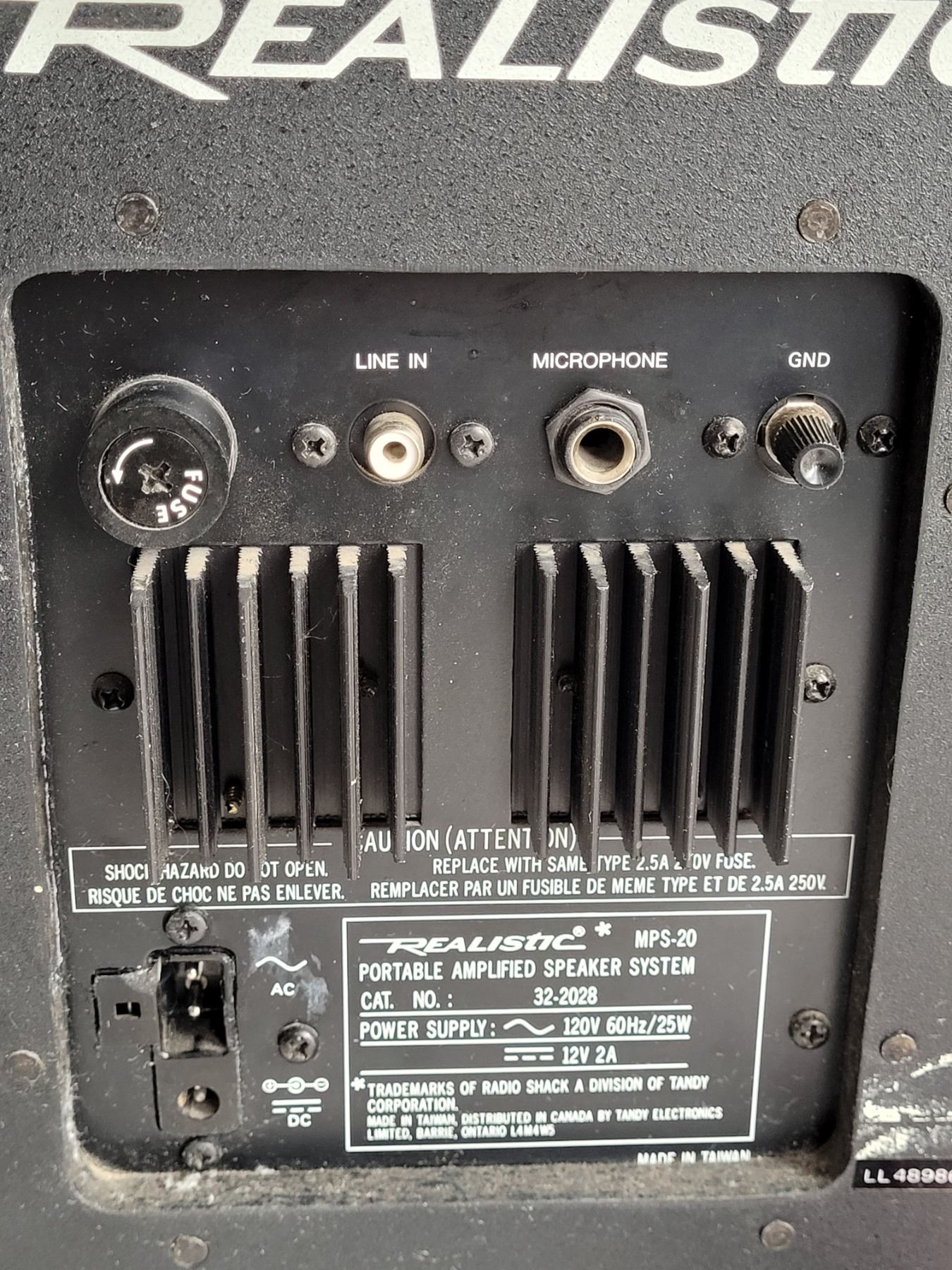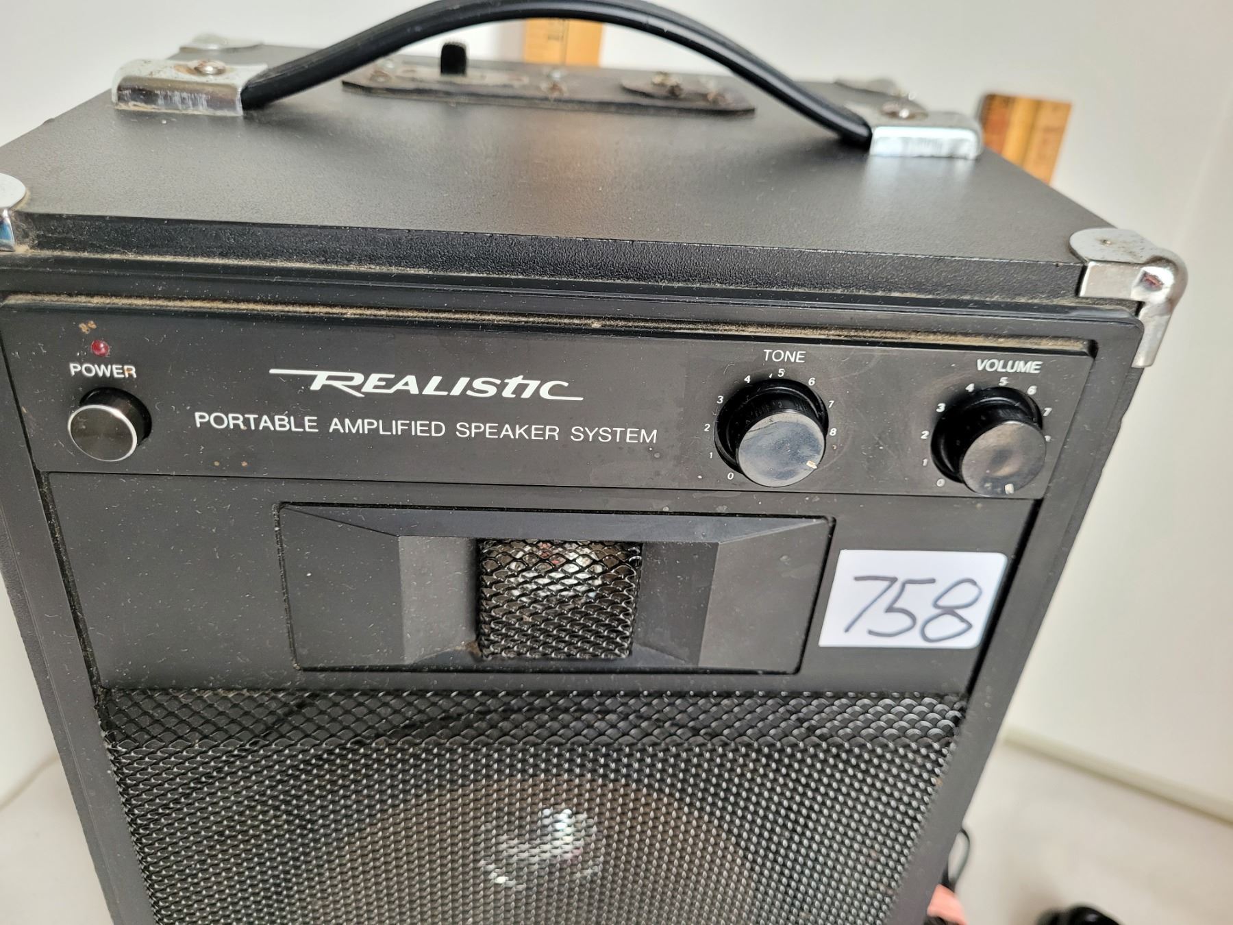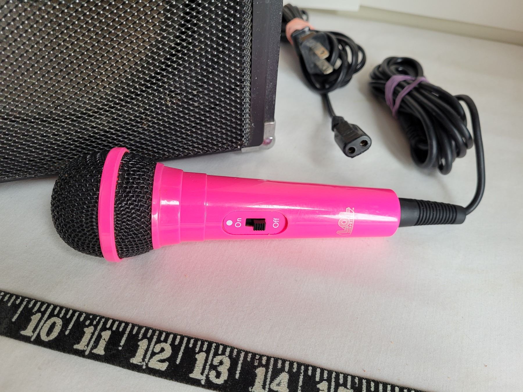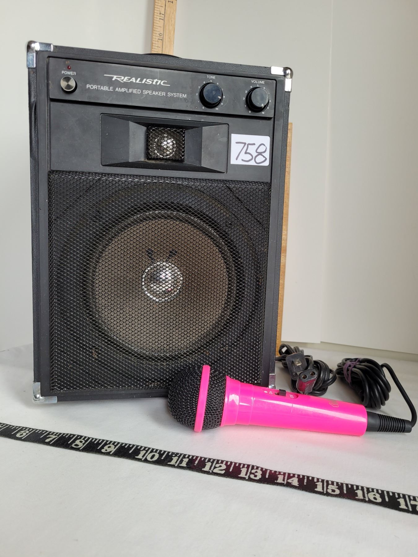 Realistic portable, amplified speaker with a Pink microphone. Works great.