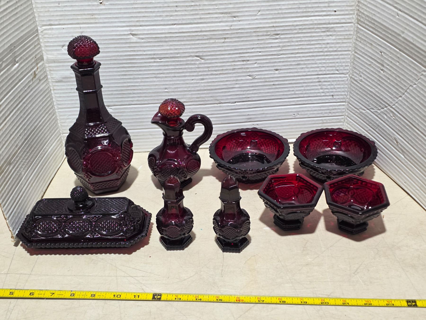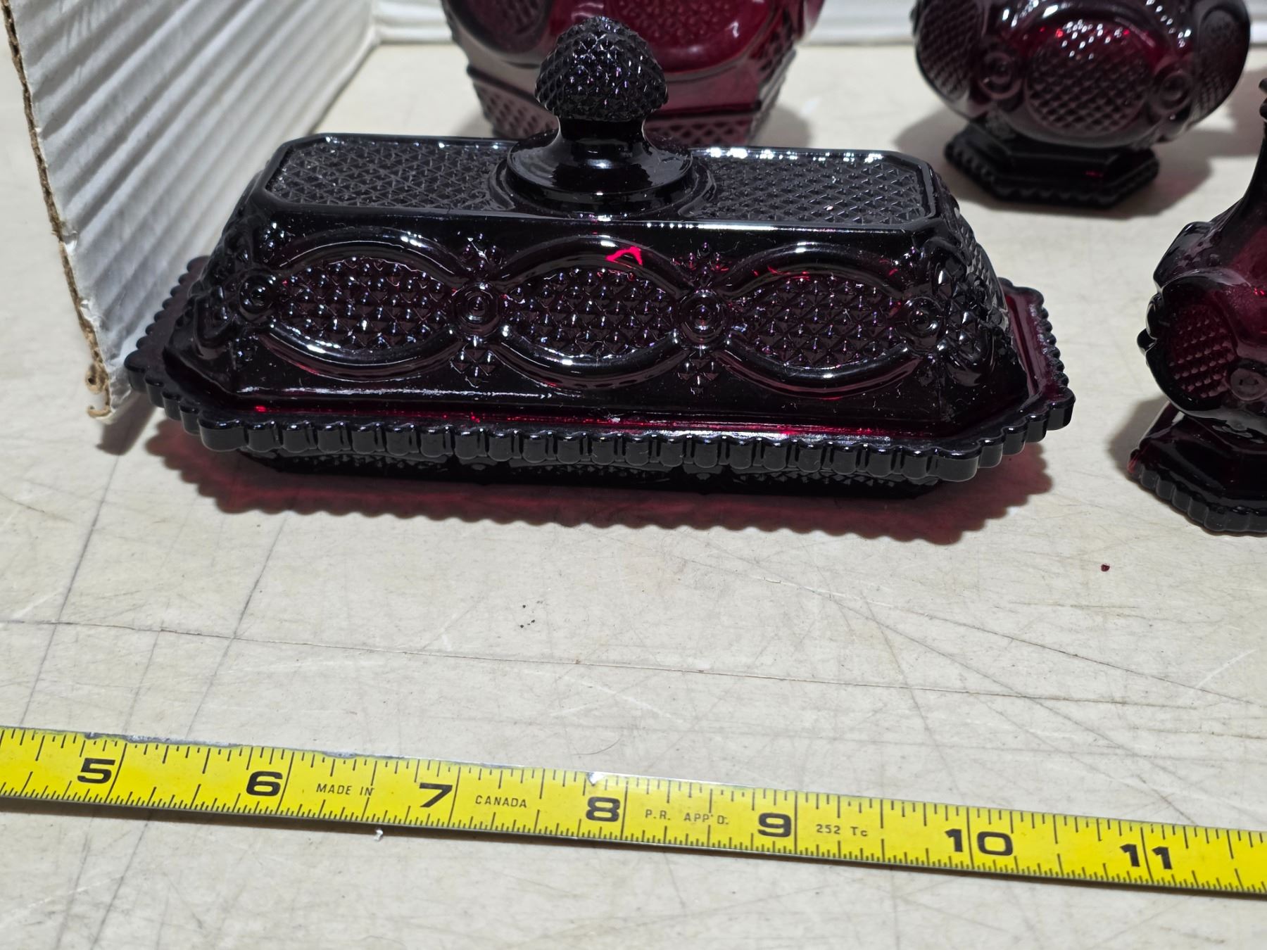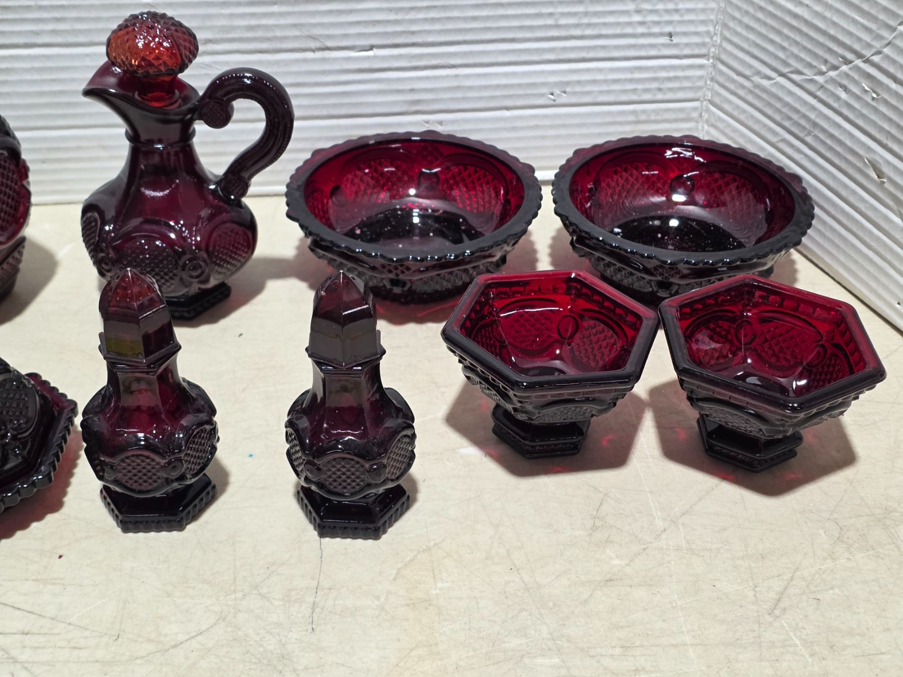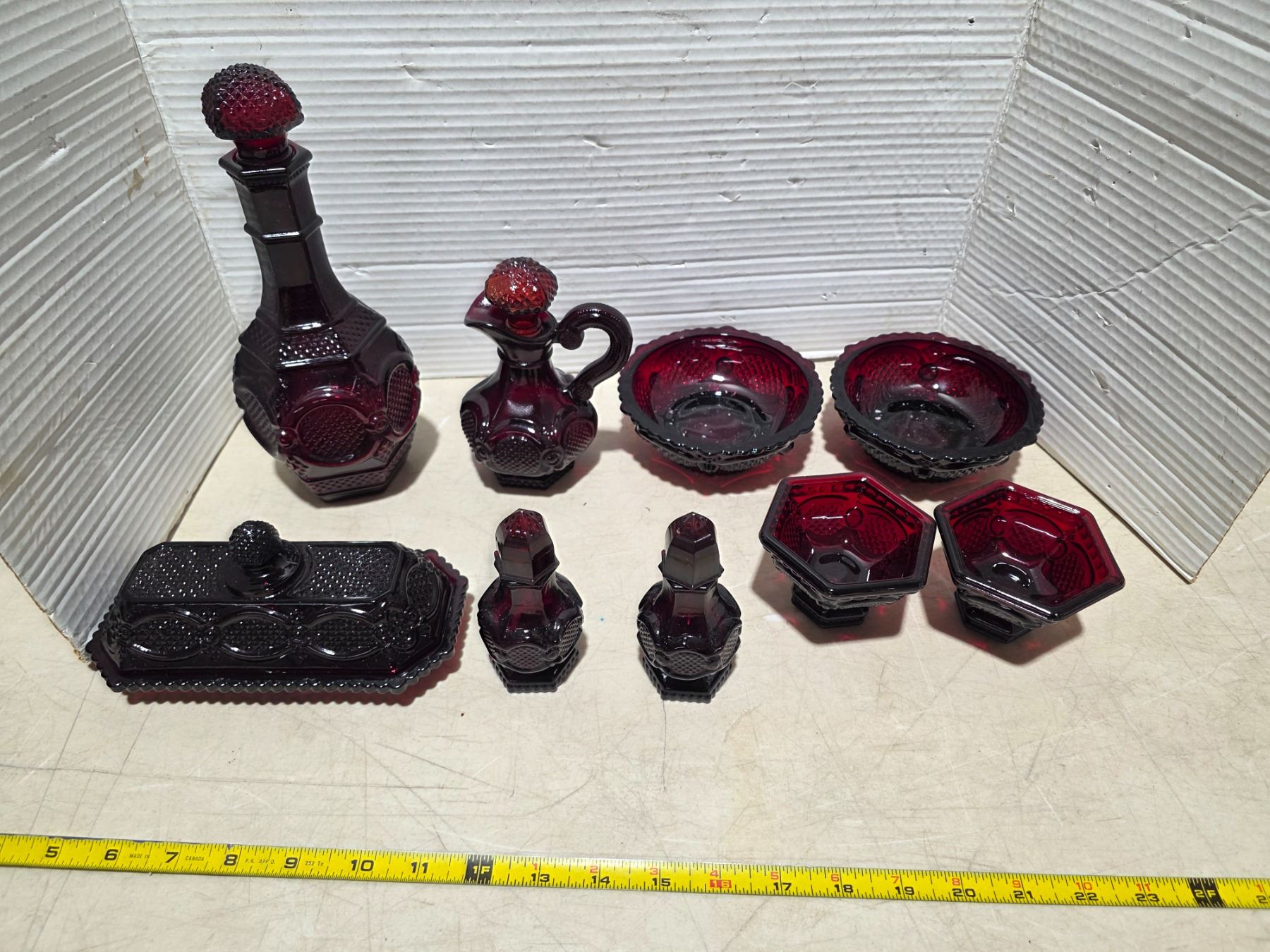 Red Avon glassware- salt and pepper, butter dish