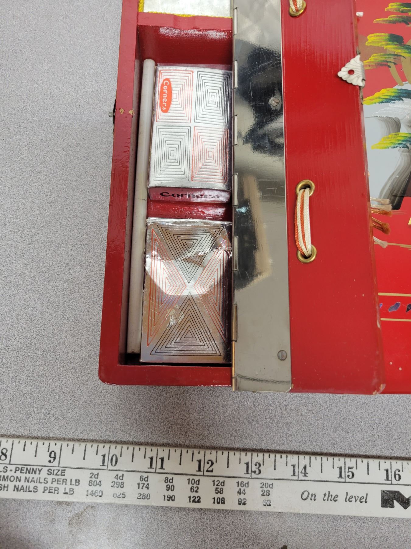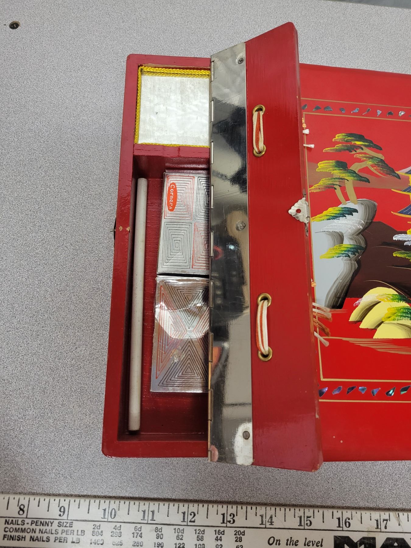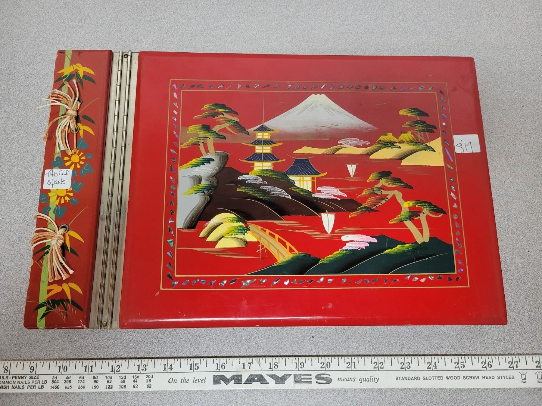 Red Chinese lacquered picture album with music box - never used book style