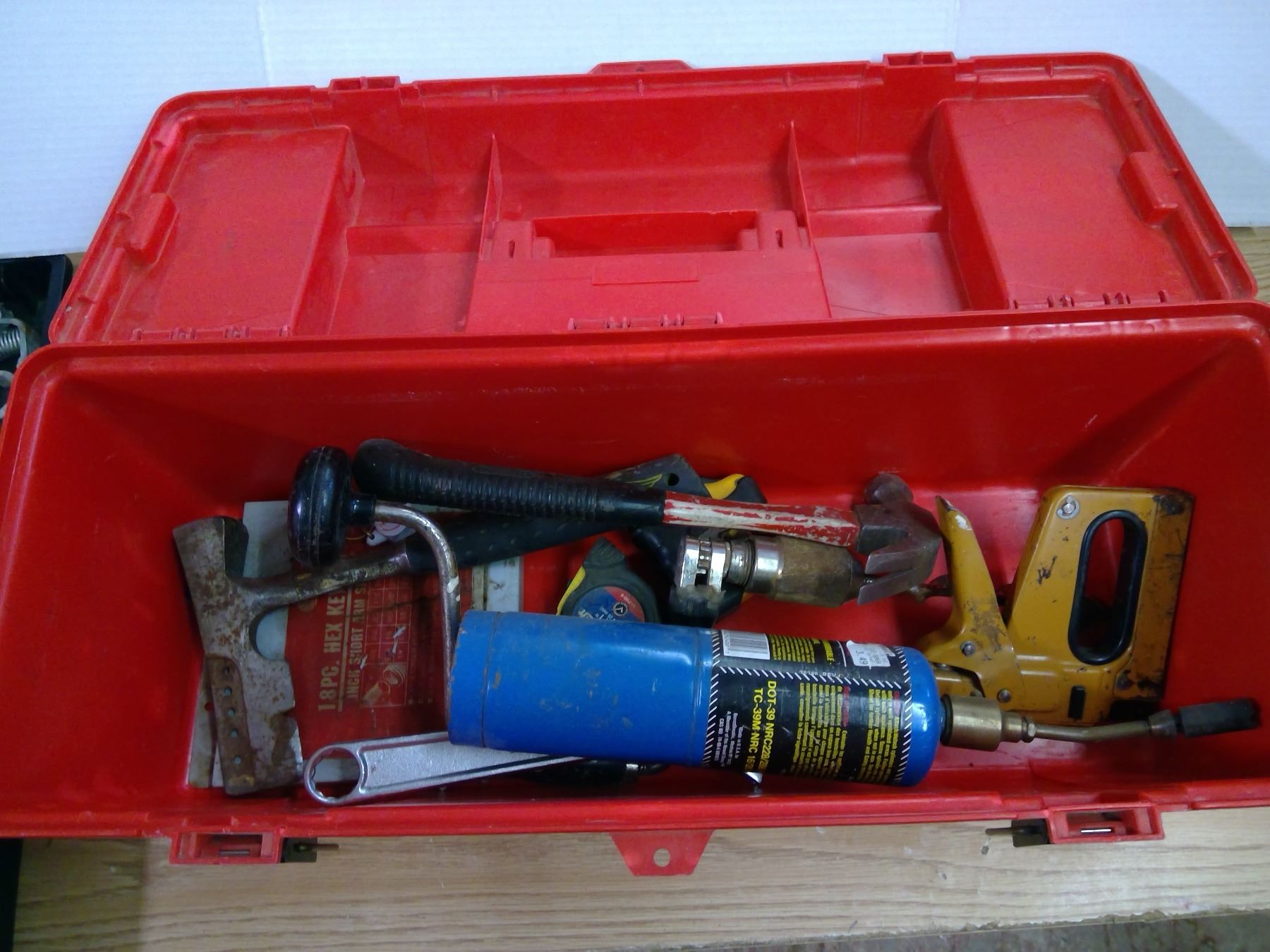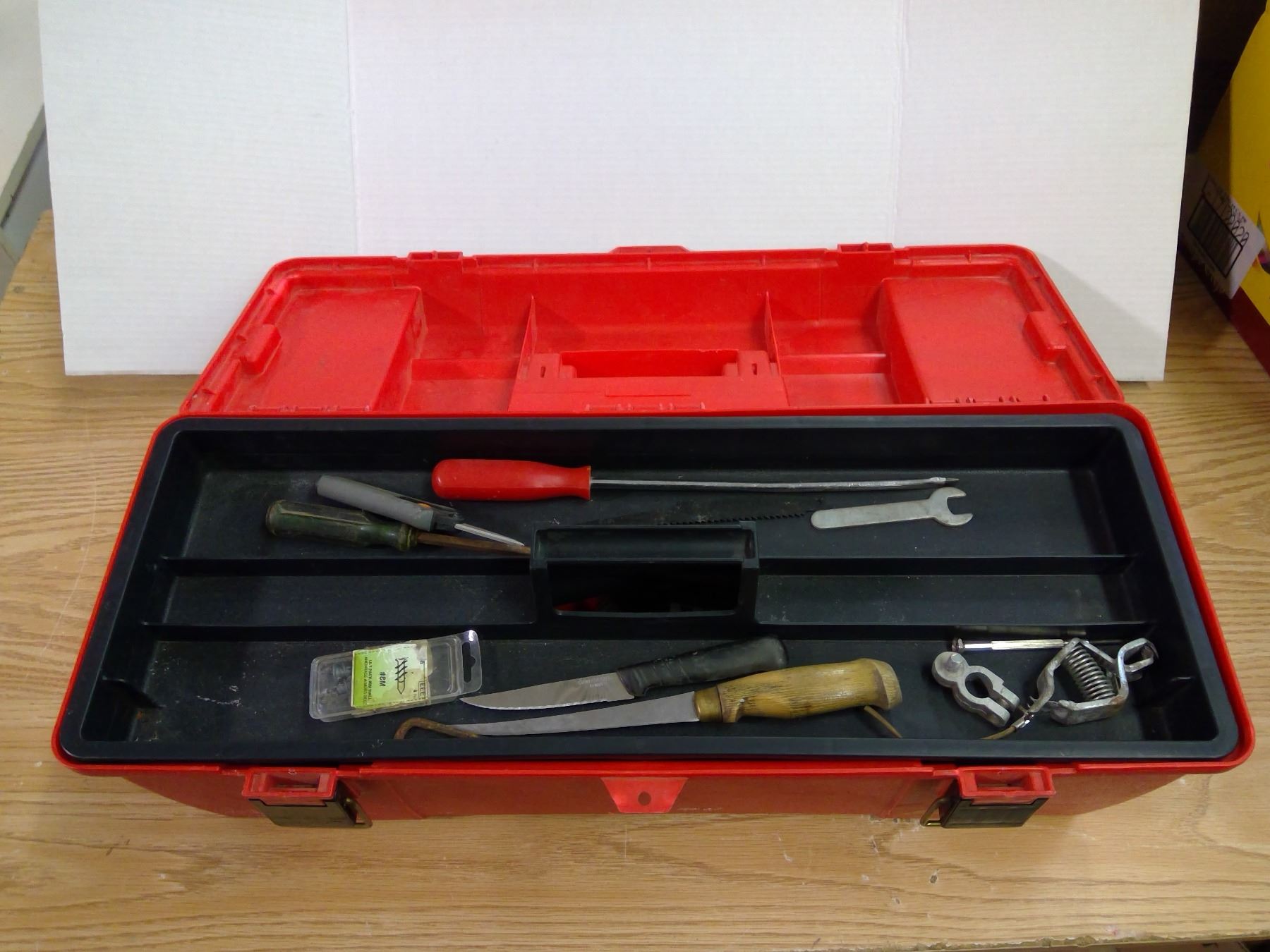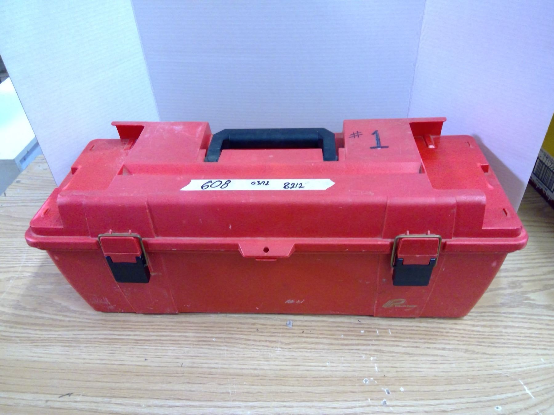 Red Plastic Toolbox 24x10x10" & Lot of Tools