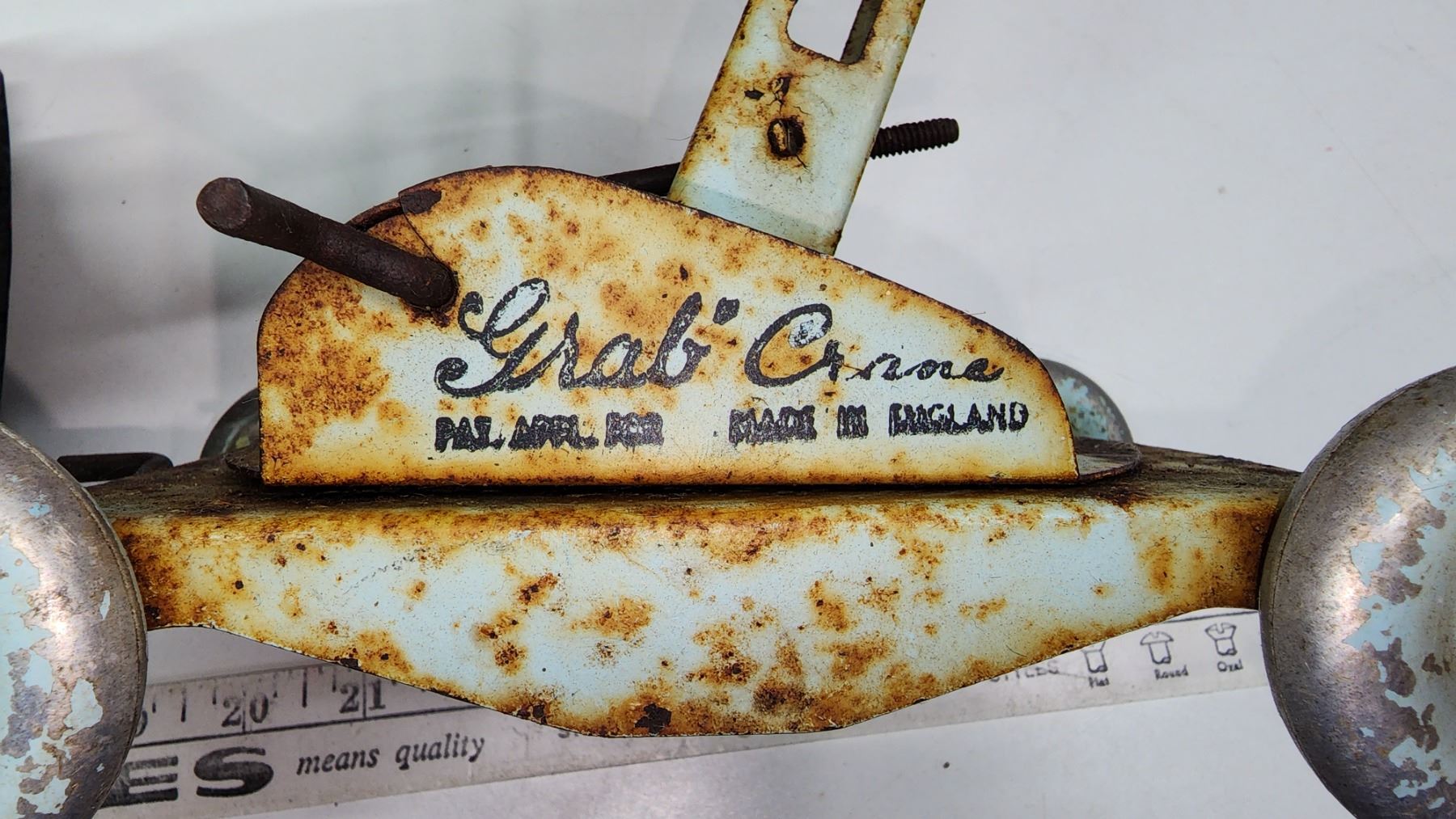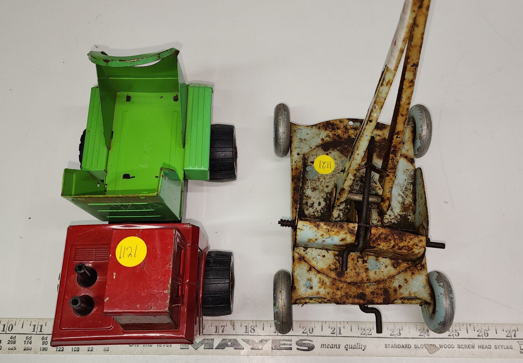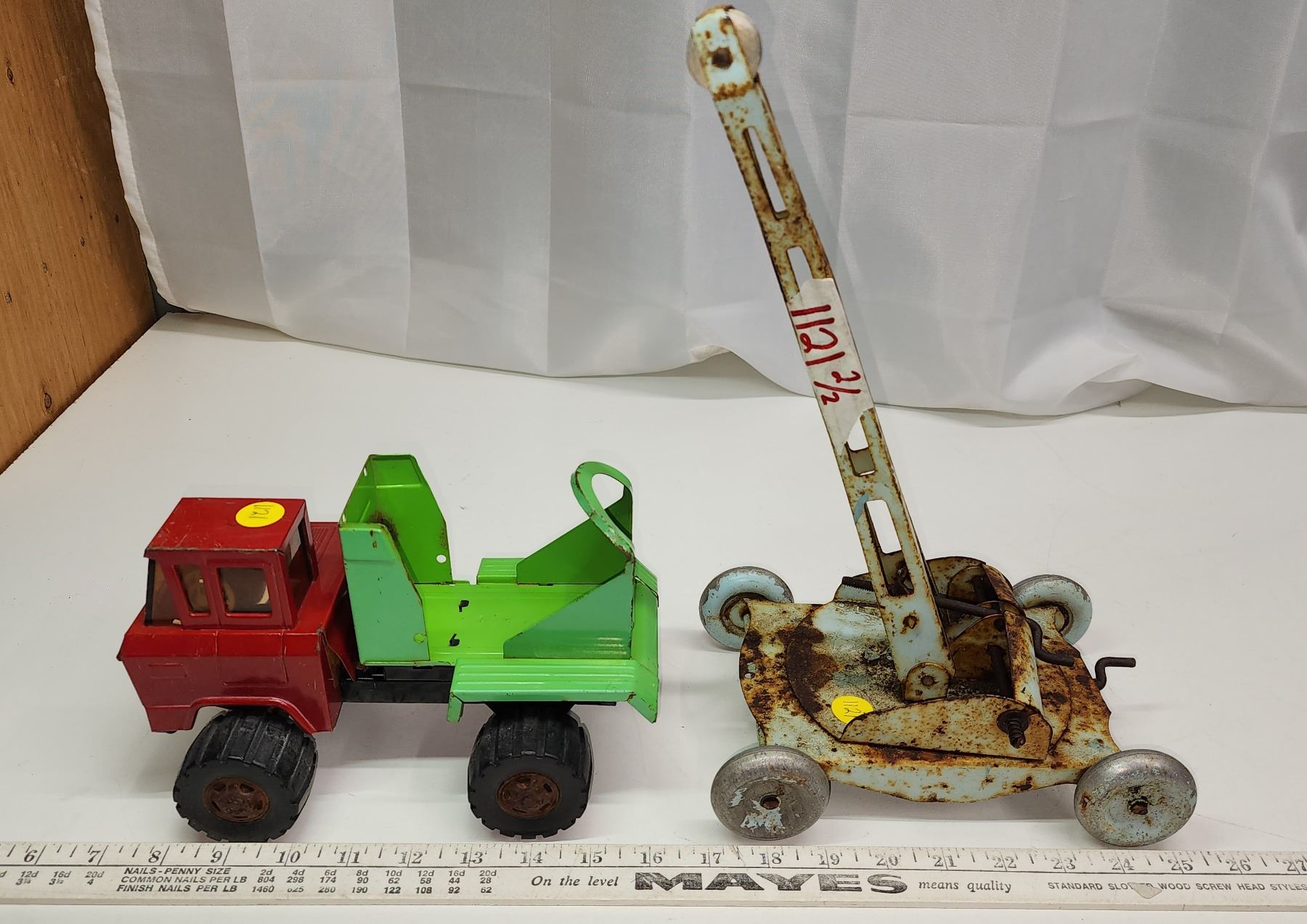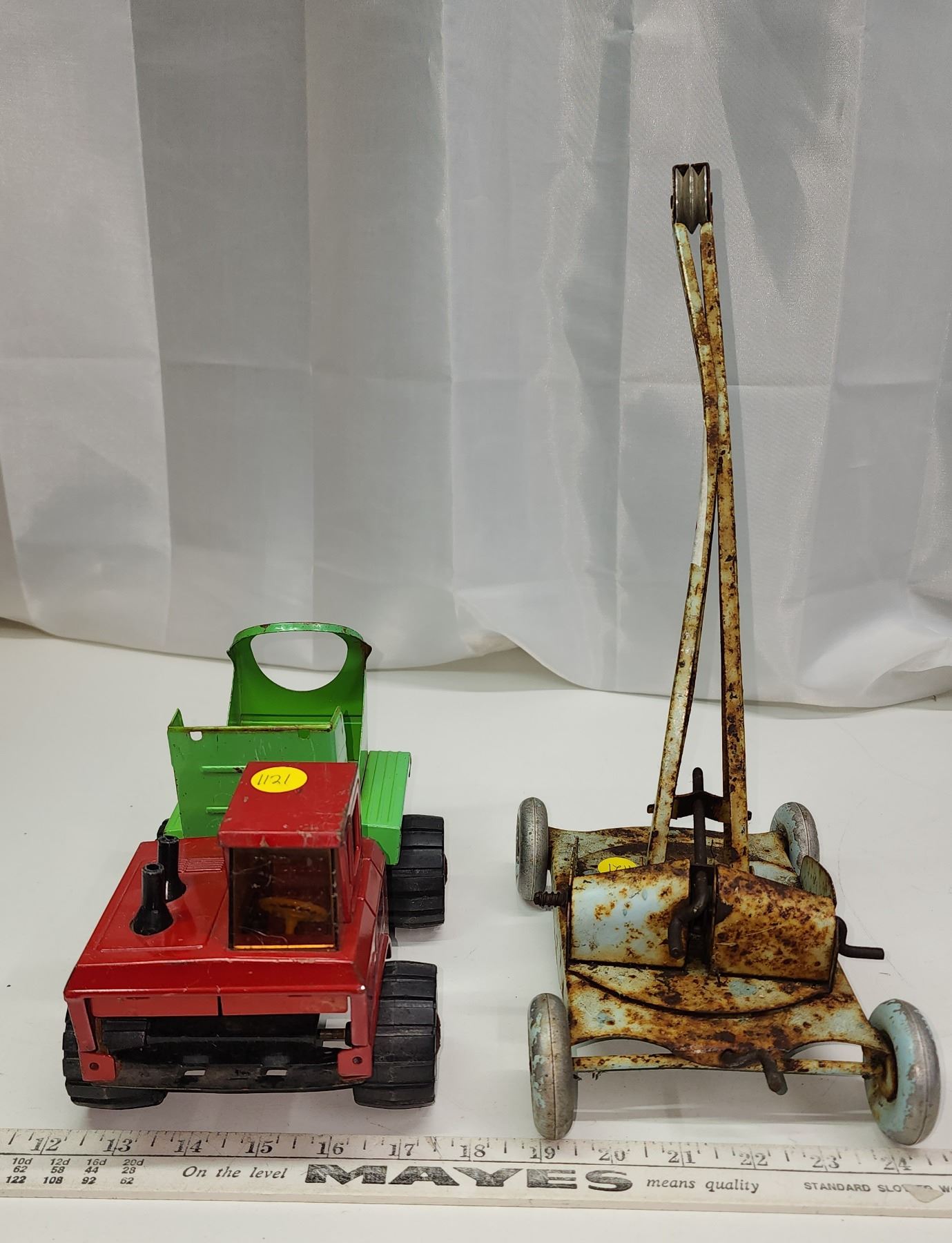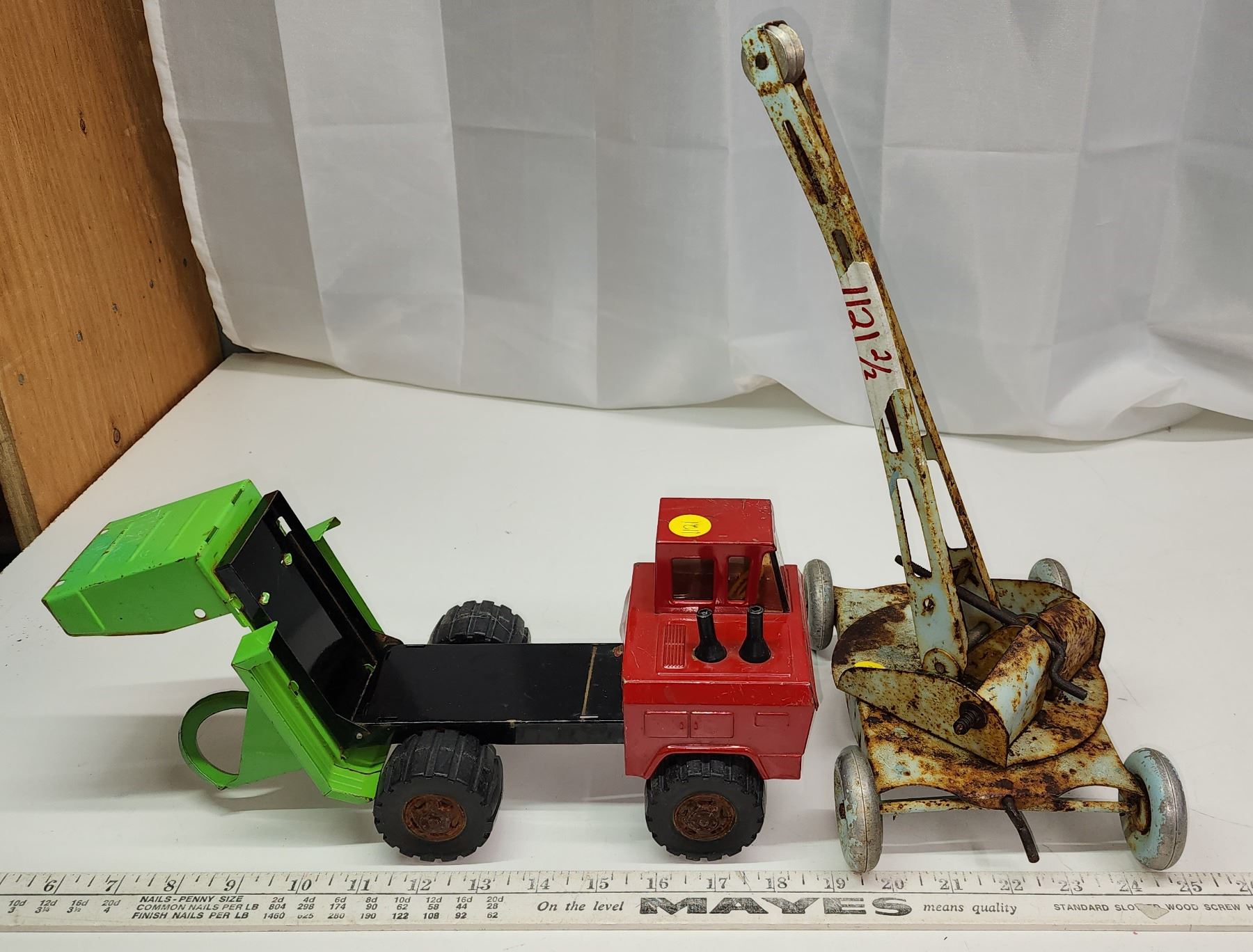 Red n Green metal toy truck & metal toy crane (crane is missing piece)