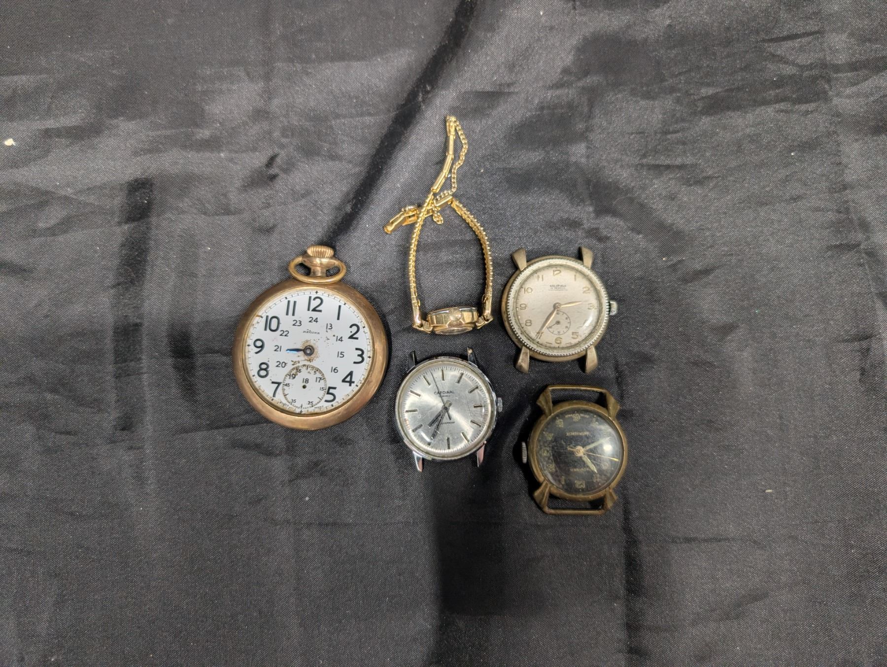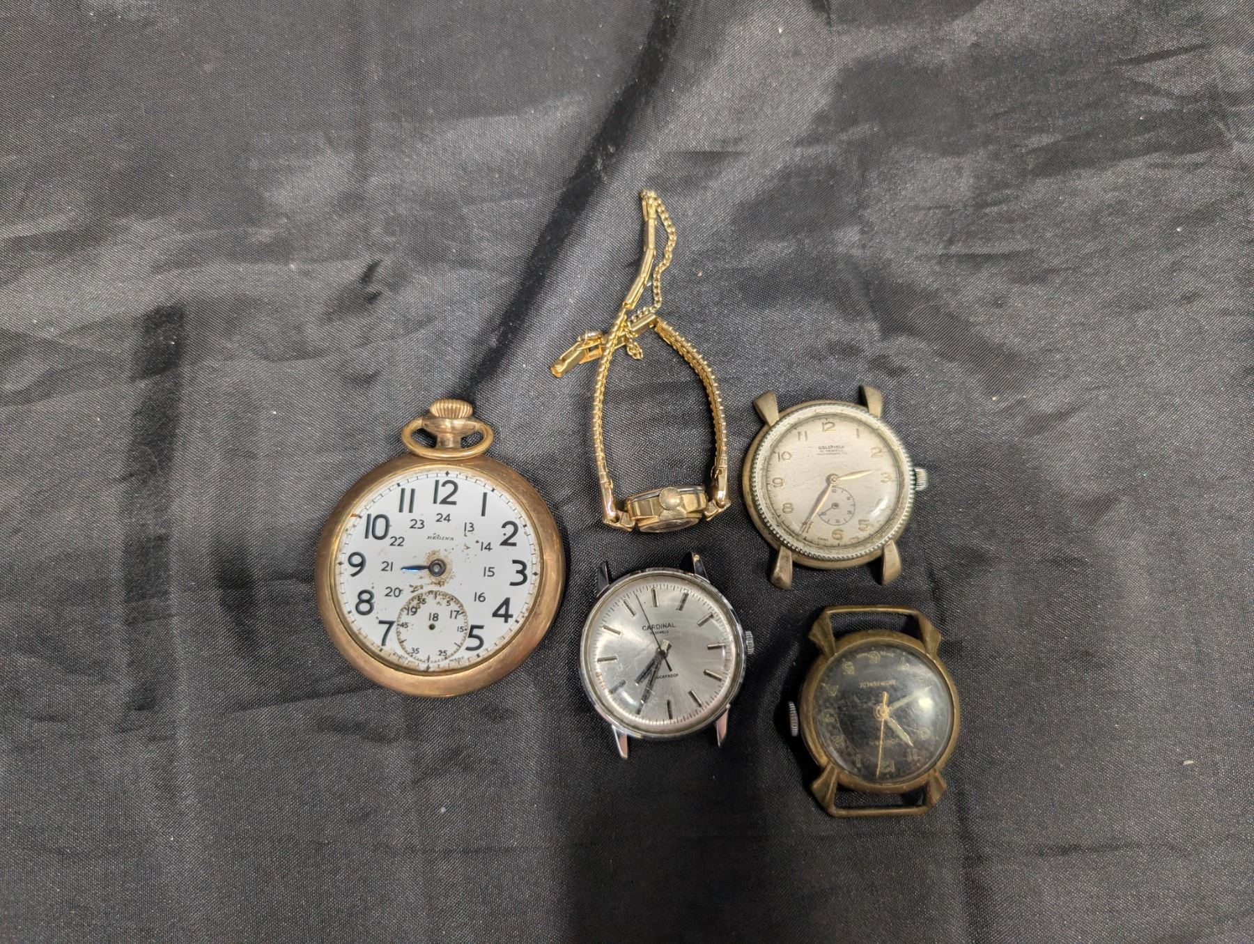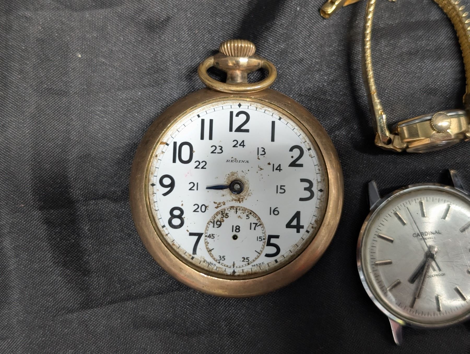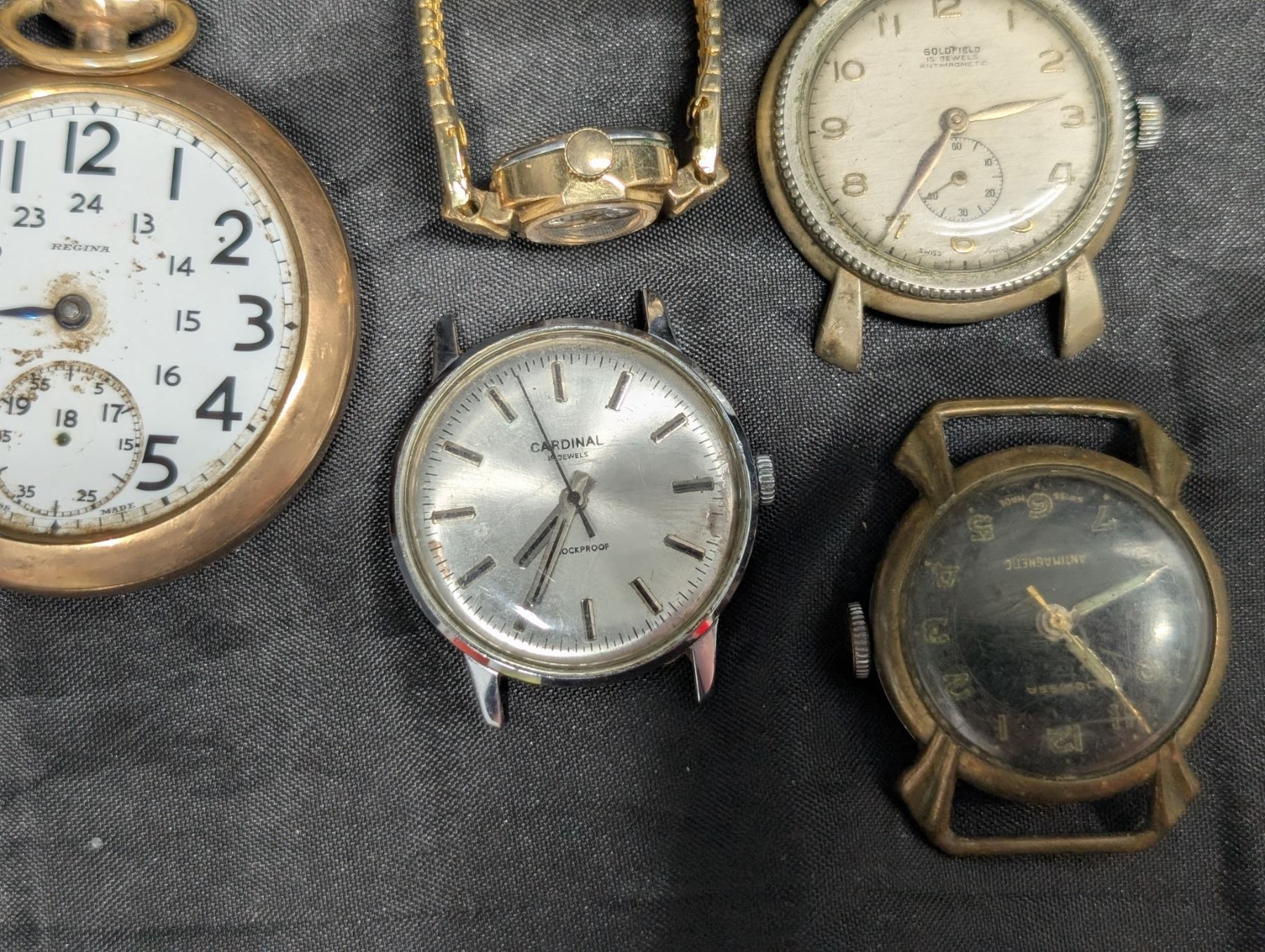 Regina Pocket Watch running Plus 3 Watches, Goldfield, Conidial, Swiss made, All For parts