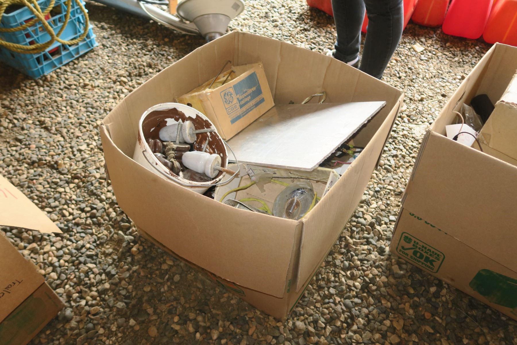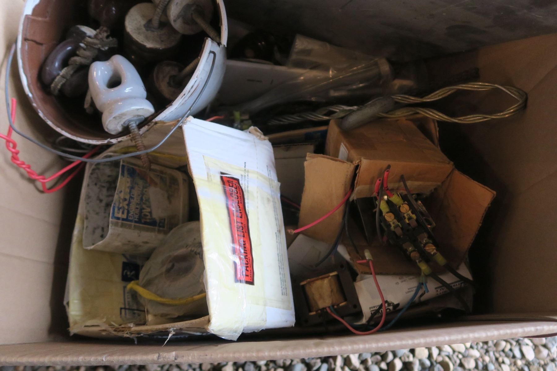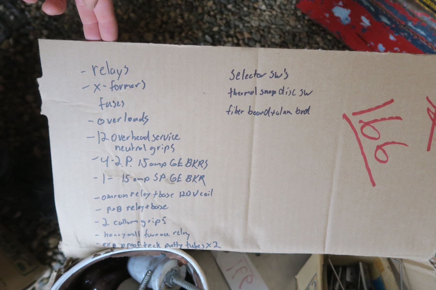Relays, Xformersfuses, Overloads, (12) Overhead Neutral Grips, (4) 2P 15amp GE Bkr, (1) 15 amp SPGE BKR, Relay/Base 120V, P/B Relay and Base, (2) Collum Grips, Honeywell Furnace Relay, (2) Proof Tek Putty Tubes, Selector Switch, Thermal Snapdisc, Fiber Board