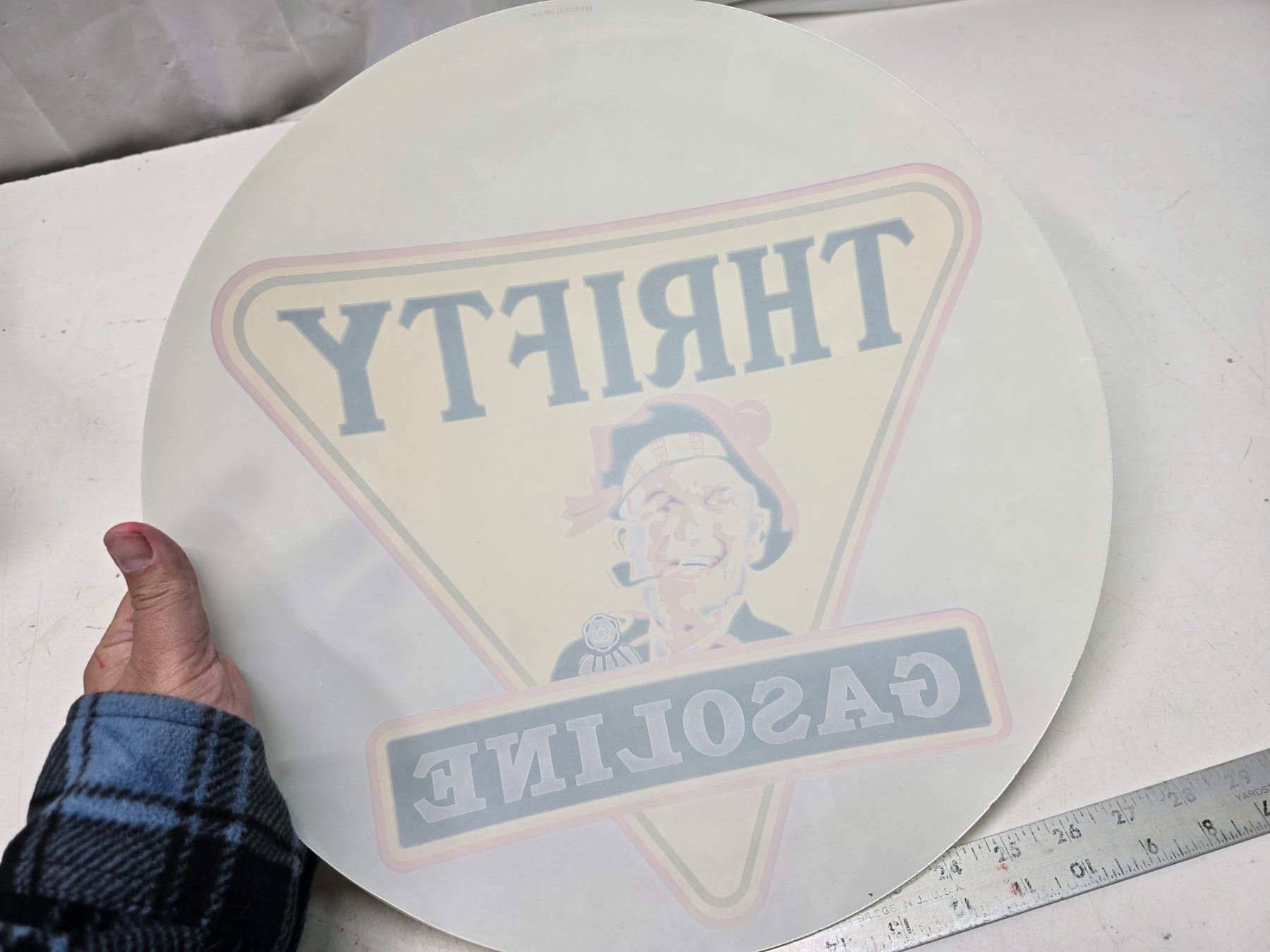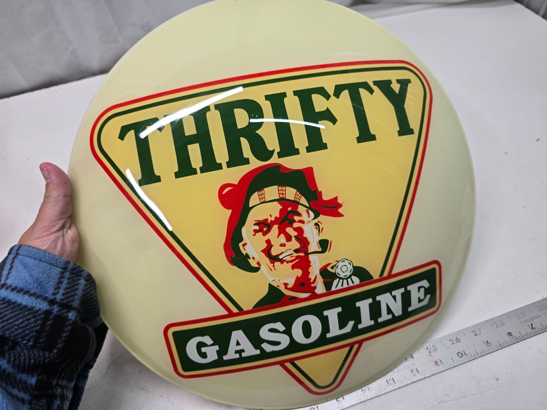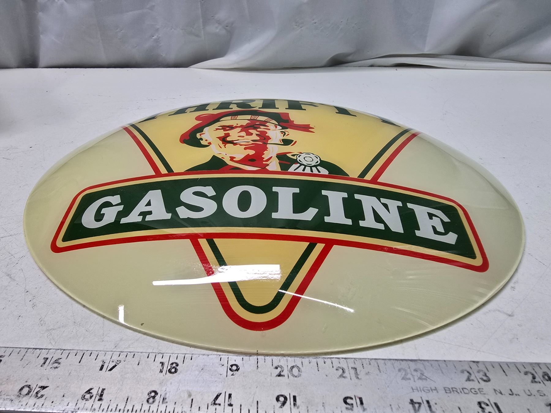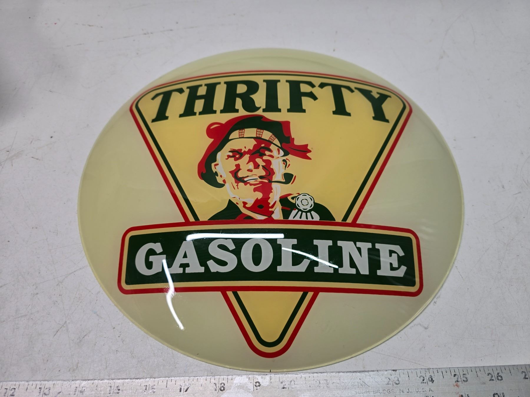 Reproduction, glass "Thrifty Gasoline" gas globe lense - 15" across