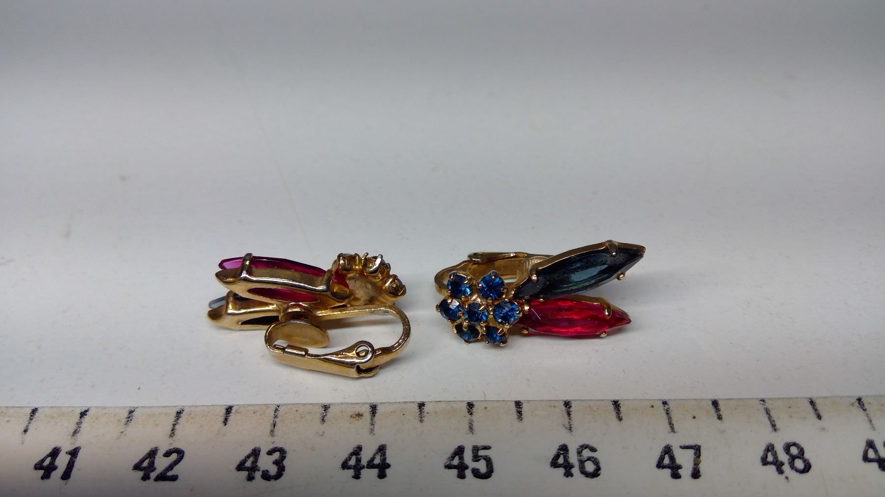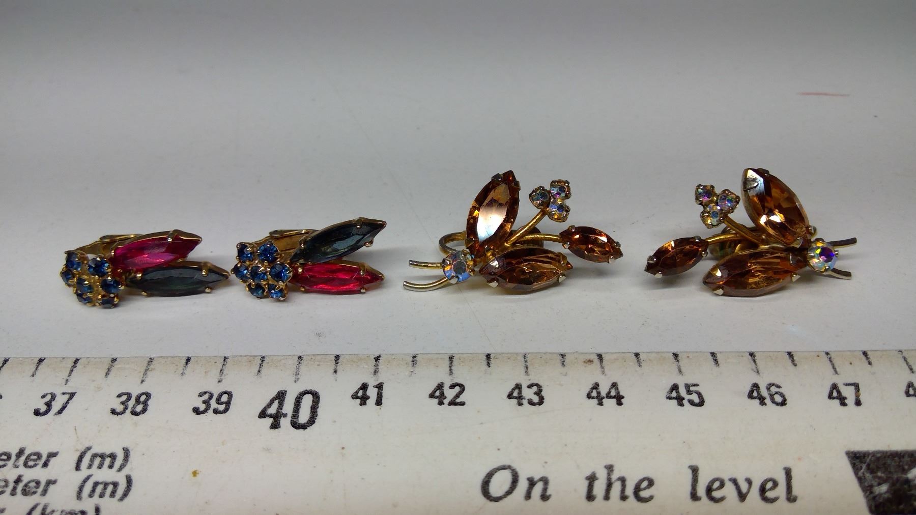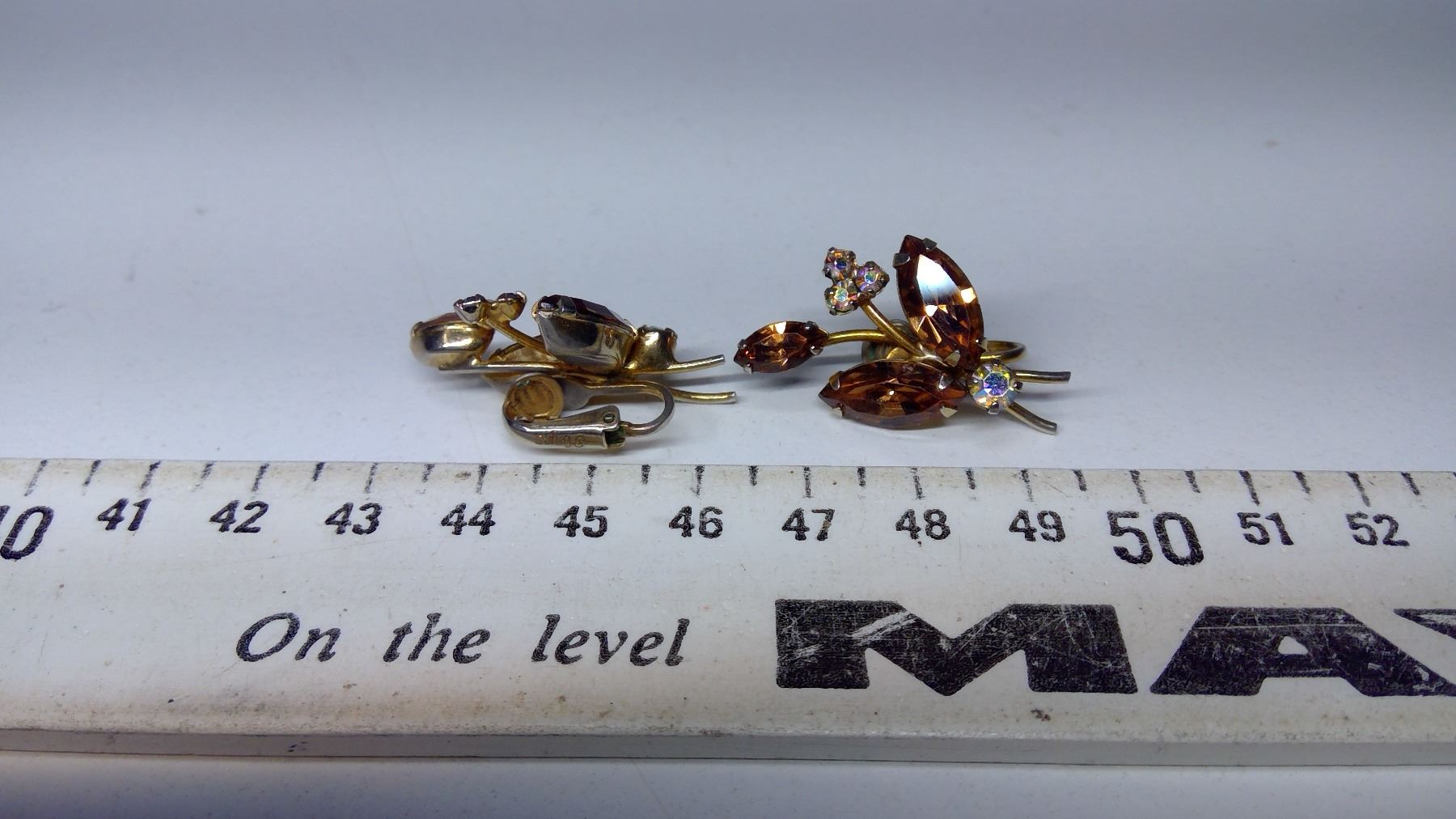 Rhinestone clip earrings, 2 pair, amber rhinestones marked “Keyes”