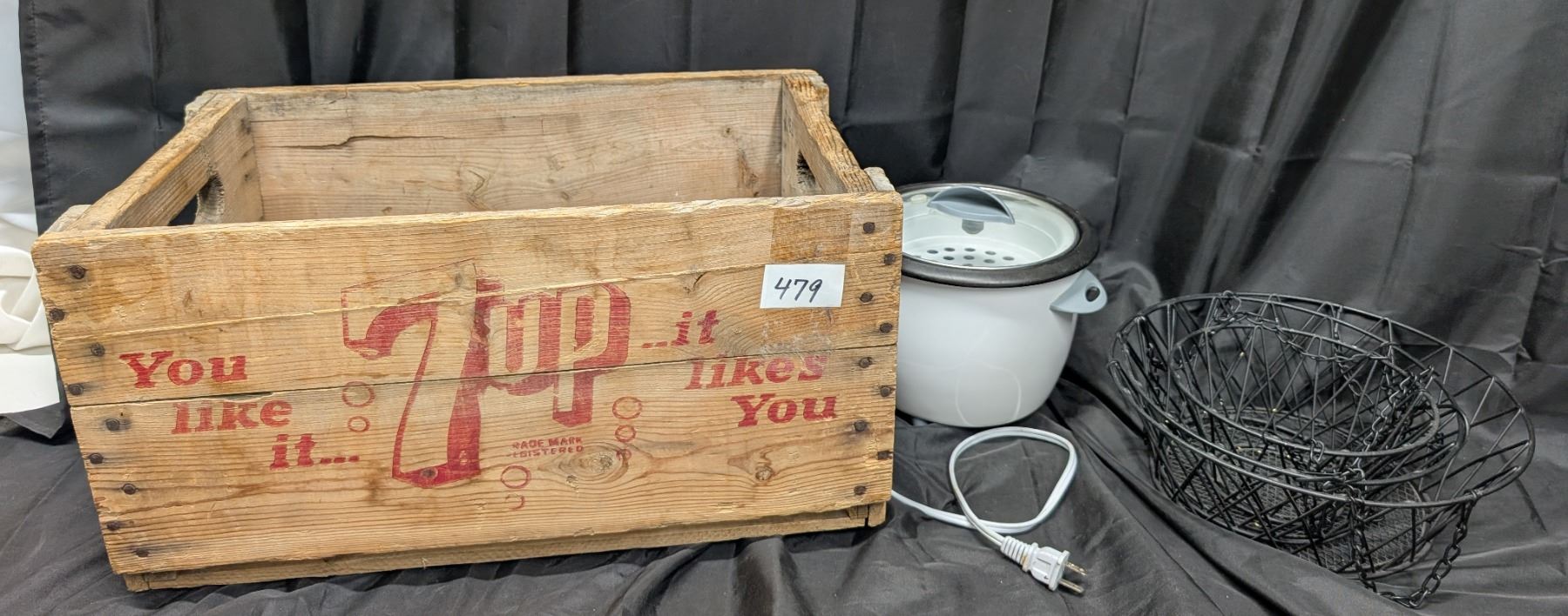 Rice Cooker (works) Hanging Fruit Basket, and vintage 7-11 Crate