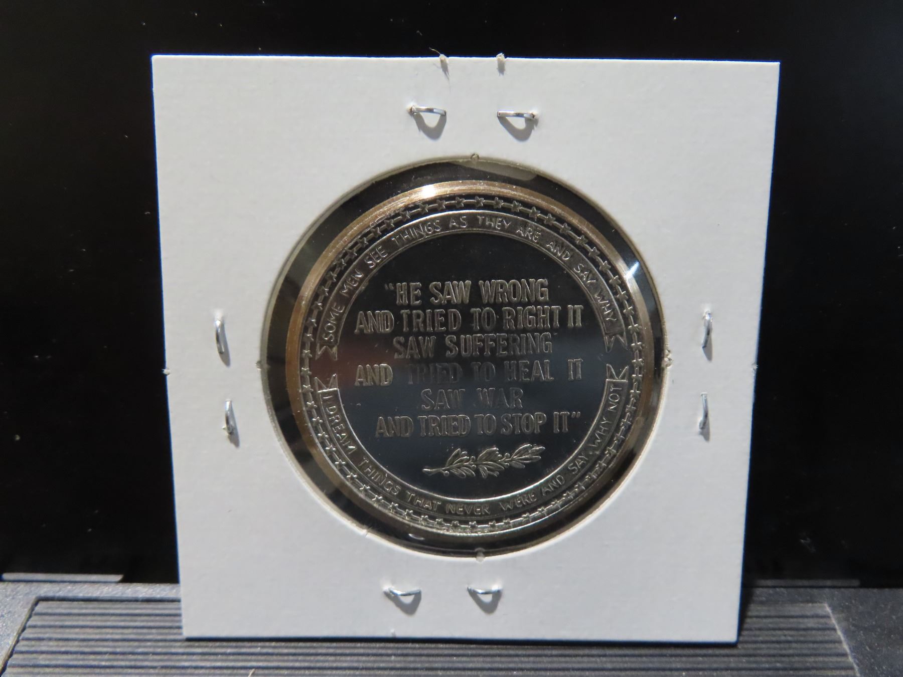 Robert Kennedy medal. 1925 – 1968. He Saw Wrong and tried to Right it, Saw Suffering and tried to Heal it, Saw War and tried to Stop it. BU.