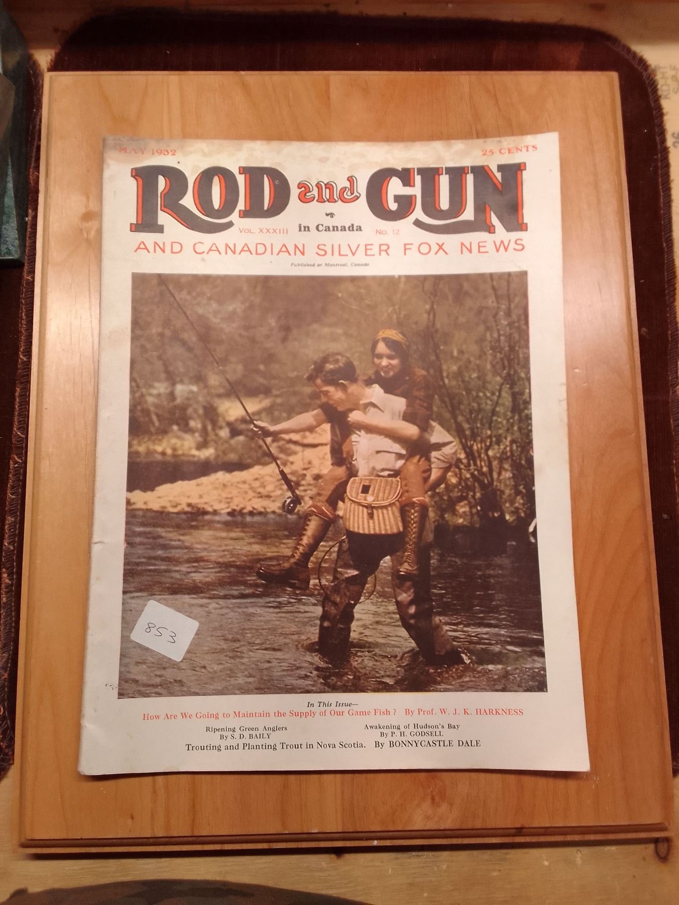 Rod and Gun May 1932: Canadian Fly Fishing Cover Vintage Outdoor Magazine- This May 1932 issue of Rod and Gun in Canada (Vol. XXXIII, No. 12) features a sepia-toned cover photo of two fly fishermen wading in a river with creels and rods. Priced at 25 cents, it includes articles on maintaining game fish supply, trout fishing in Nova Scotia,- And Canadian silver fox news, capturing the era's passion for hunting, fishing, and conservation.