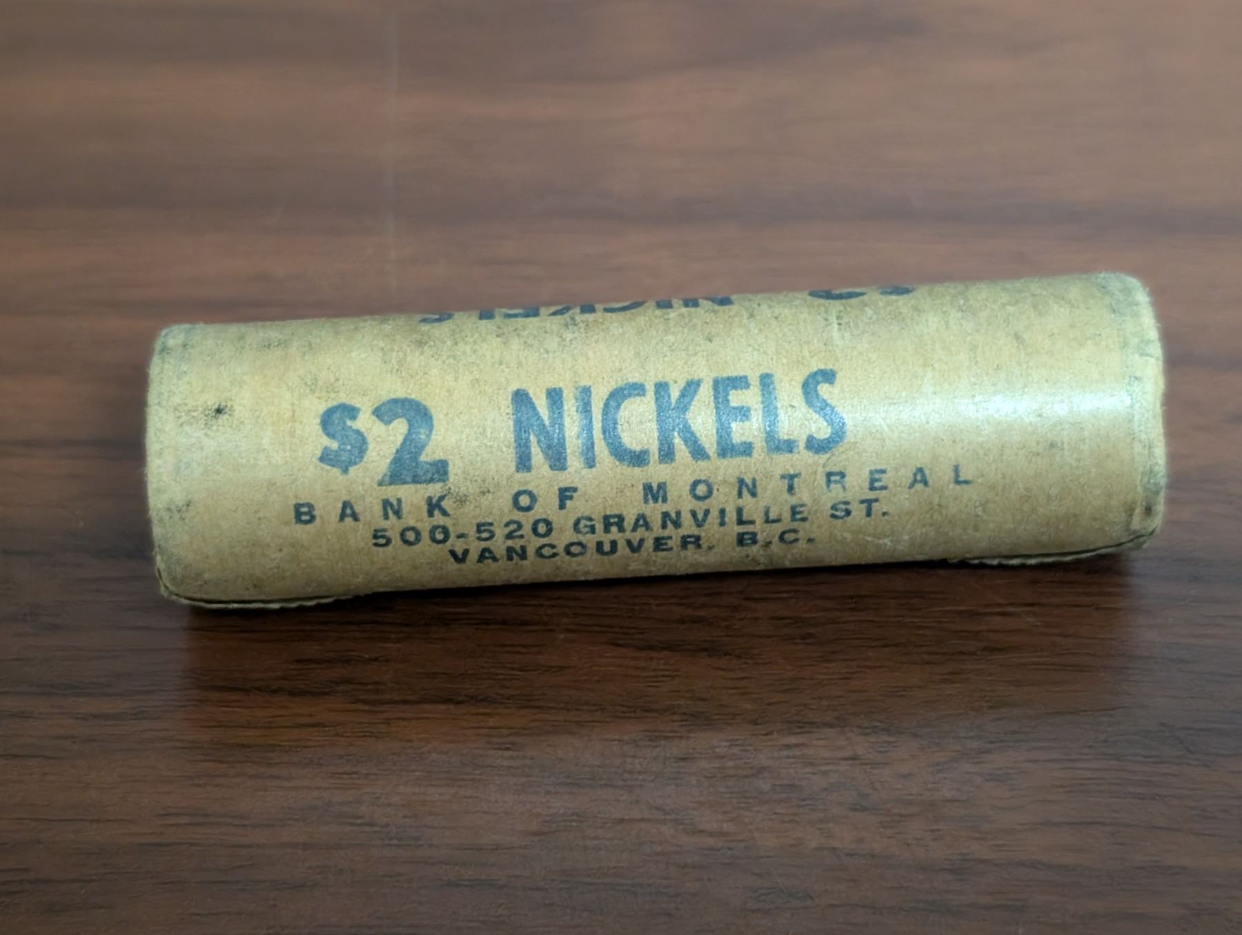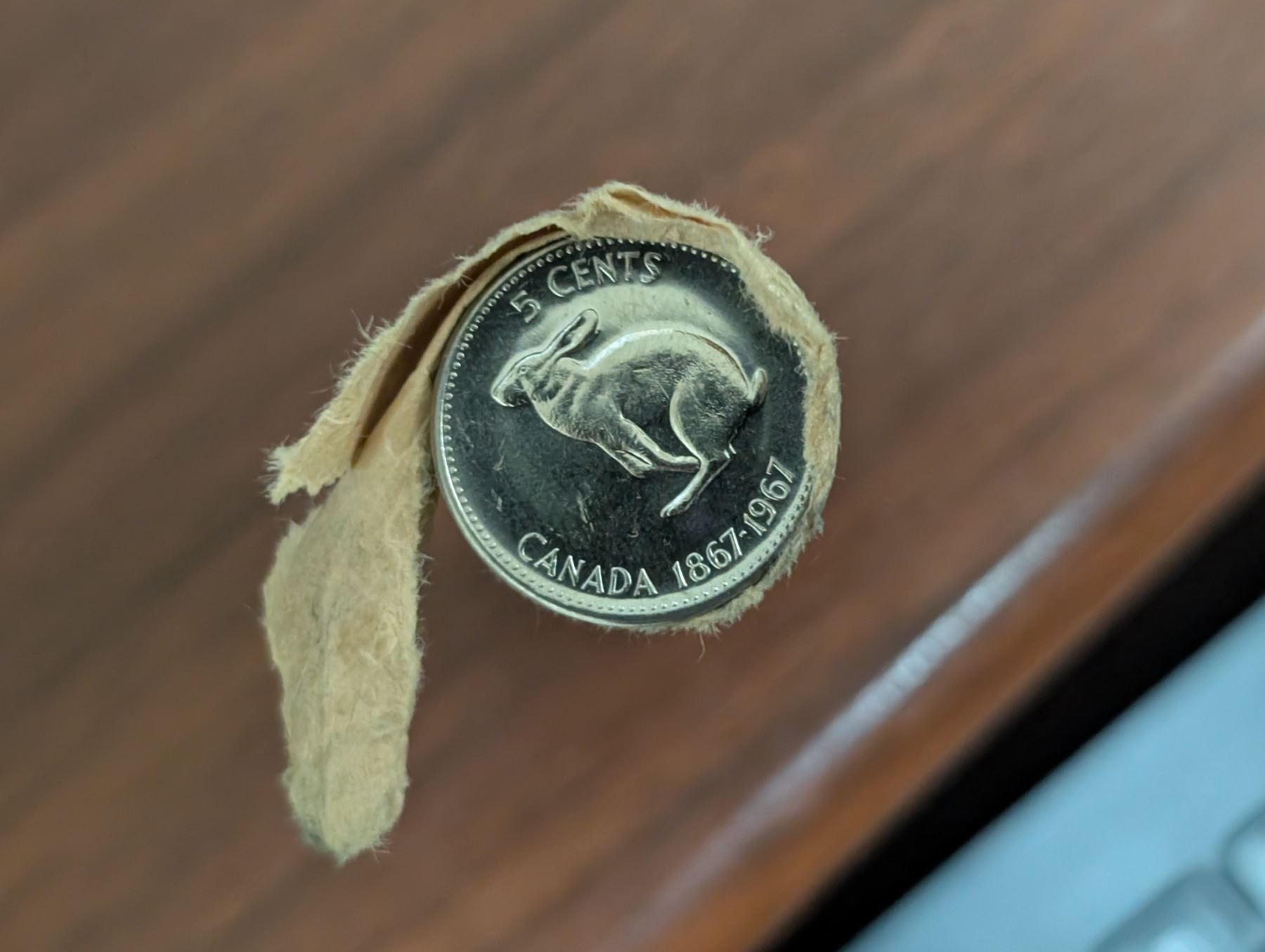 Roll of 1967 5-cent coin bunny Canadian Centennial nickel, commemorating the 100th anniversary of Canada.