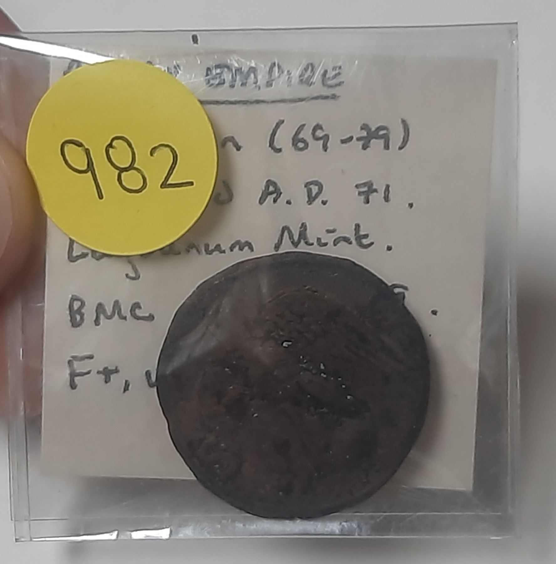 Roman Empire. Emperor Vespasian (69 – 79) Aes minted in 71 AD at the Lugdunum Mint in what is now France. Emperor/Eagle. Fine Plus with verdigris.