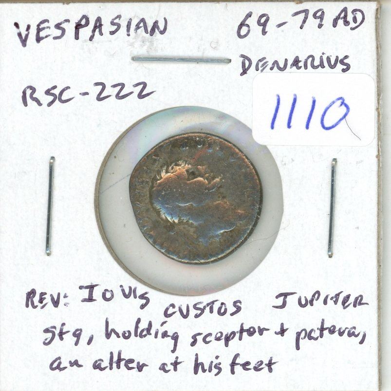 Roman Empire. Emperor Vespasian. Ruled from 69 – 79 AD. Silver Denarius. Obv: Emperor facing right. Rev: Jupiter standing, holding scepter & patera, an alter at his feet. Fine.